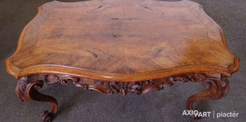 [0N256/UZ-K] Antik, három darabos, gyékény fonatos, nagypolgári bécsi barokk szalon garnitúra. A fa szerkezetek épek, dúsan faragott díszítésűek. A garnitúra részei: - 1 darab dúsan faragott, ovális asztal Magassága: 57 cm Szélessége: 68 cm Hossza: 109 cm - 2 darab körkarfás fotel Magassága: 94 cm Szélessége: 74 cm Mélysége: 72 cm A fotelek gyékénye több helyen benyomódott.