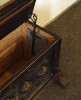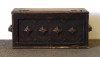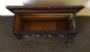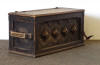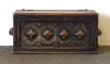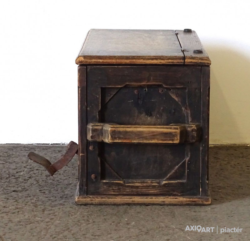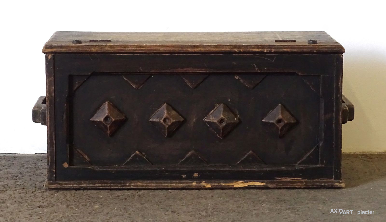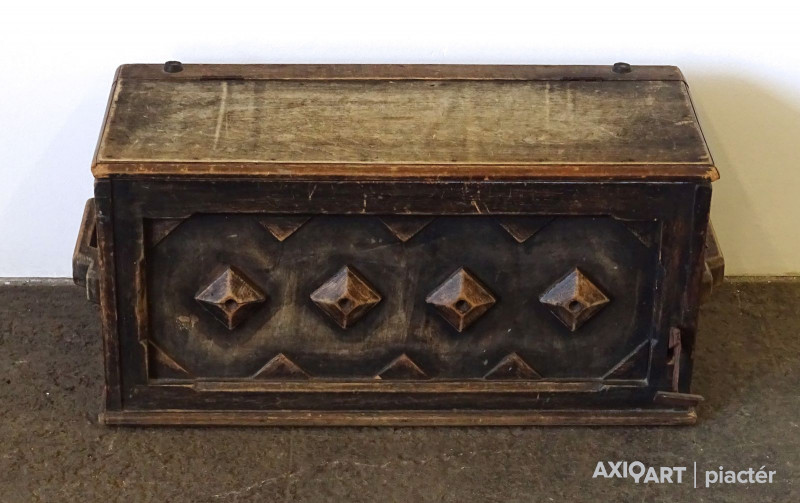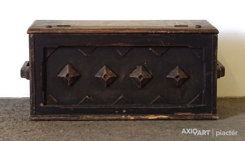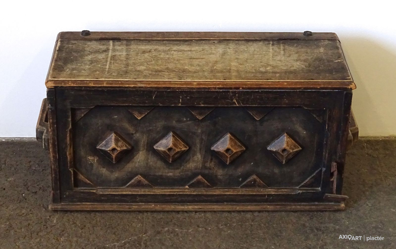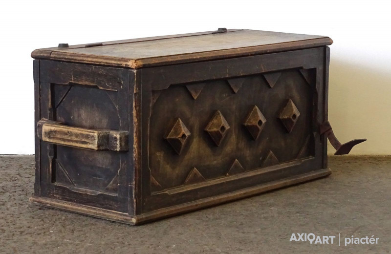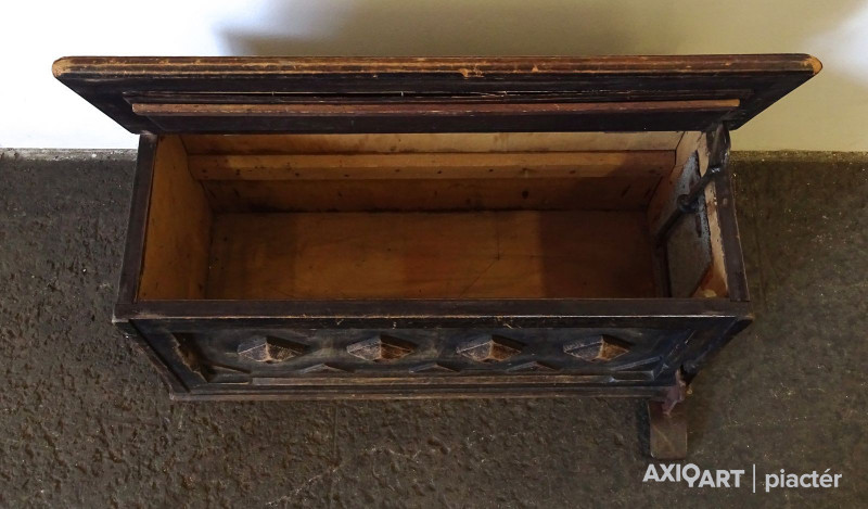 Antik, kis méretű, fülekkel rendelkező, faragott elemekkel díszített barokk fa láda. Tetejét egy kovácsoltvas pedálszerkezet nyitja.