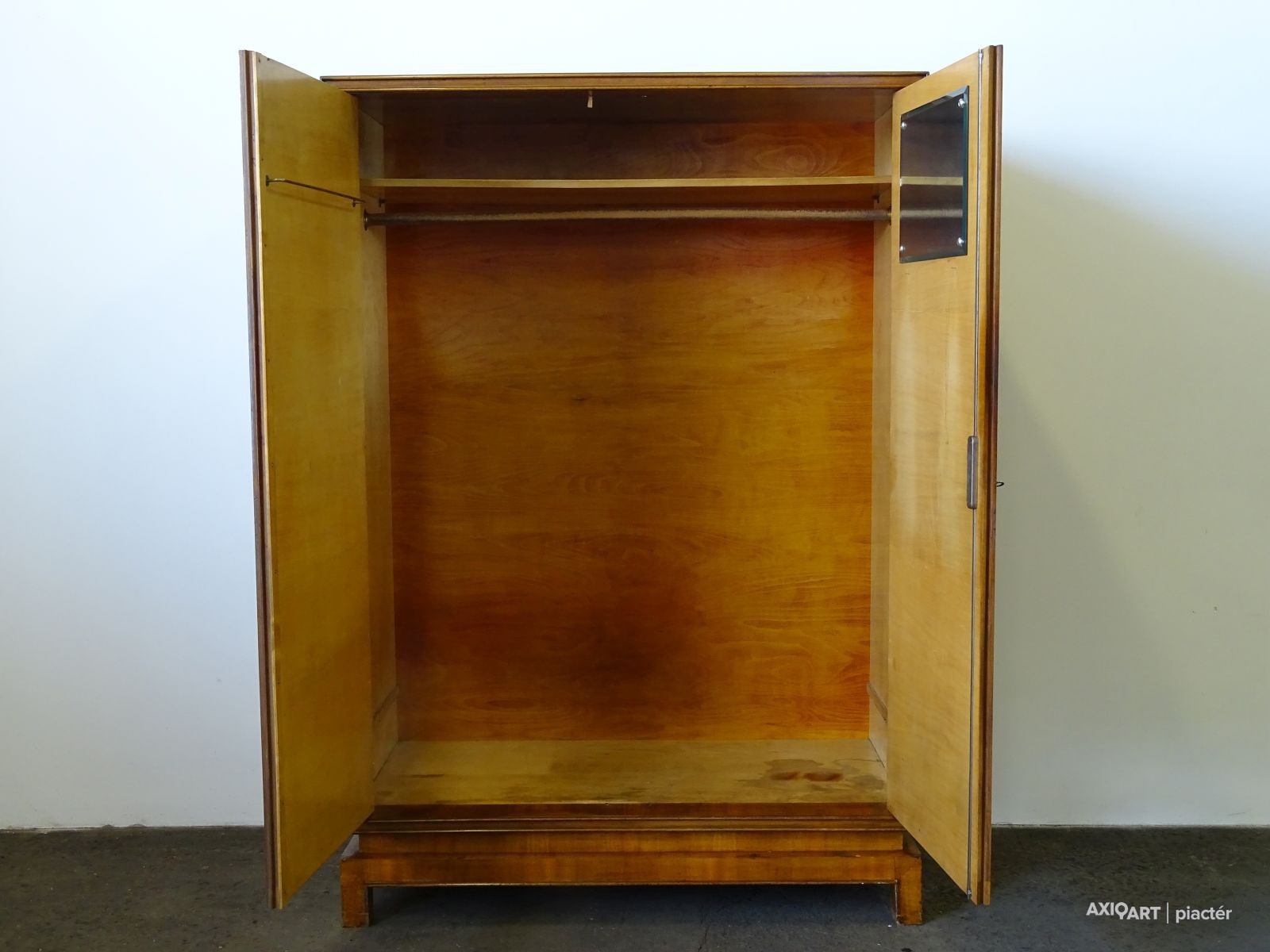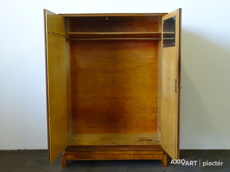 [0I207/UZ-N] Szép állapotú, formatervezett nyolc darabos bútor garnitúra. A garnitúra részei: - 1 darab kétajtós ruhásszekrény - 1 darab fésülködő asztal tükörrel - 1 darab bárszekrény - 1 darab nagyméretű üveglapos kerekasztal, szalonasztal - 2 darab támlás szék - 2 darab karfás gurulós fotel, virágmintás levehető huzattal, párnával.