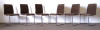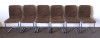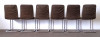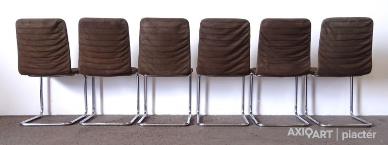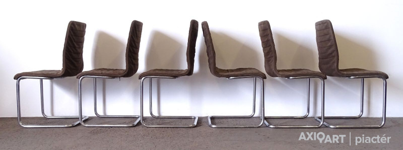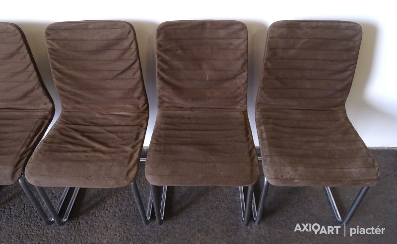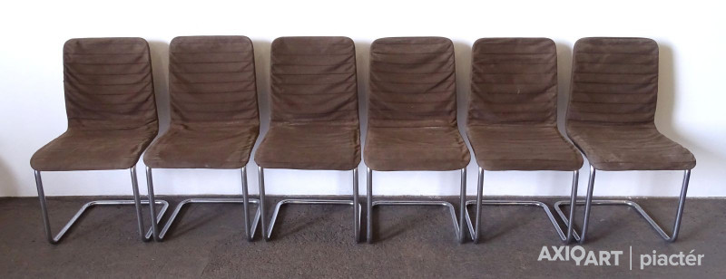 Antik formatervezett design bútor, hat darabos szék garnitúra. Hajlított króm váz, hajlított rétegelt lemez ülőfelület barna színű kárpittal.