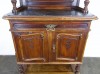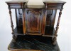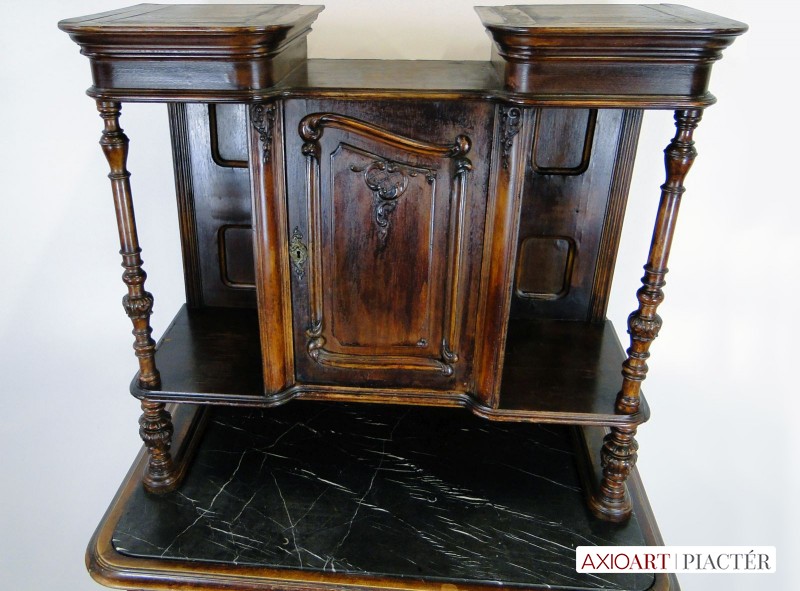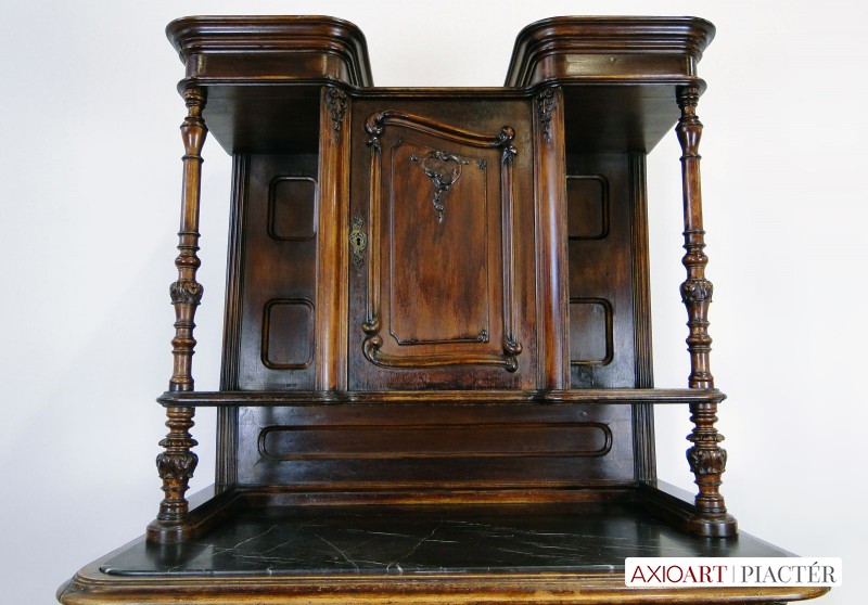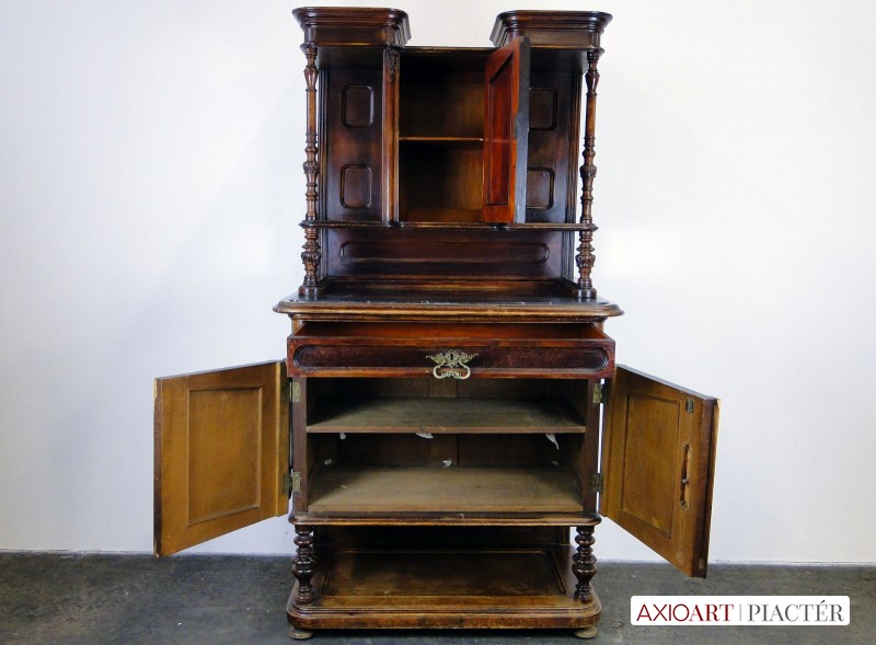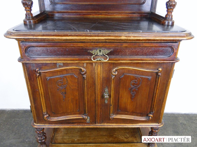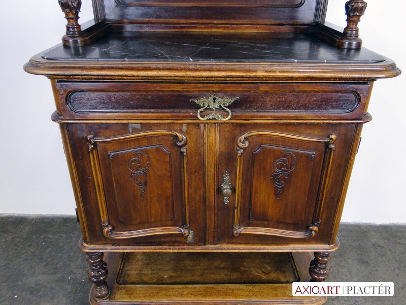 [0E202/UZ-K] Gyönyörű, antik faragványokkal gazdagon díszített, oszlopos tálaló szekrény, az 1800-as évek közepéről. A bútor intakt, eredeti állapotában található. Rajta hibátlan állapotú, fekete márványok találhatóak. Réz veretei hibátlanok, egységesek. A tálaló szekrény felületén kisebb furnér hibák találhatóak, szerkezetileg ép, stabil. Magasság: 190 cm Szélesség: 104.5 cm