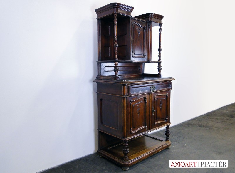Gyönyörű, antik faragványokkal gazdagon díszített, oszlopos tálaló szekrény, az 1800-as évek közepéről. A bútor intakt, eredeti állapotában található.