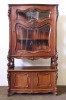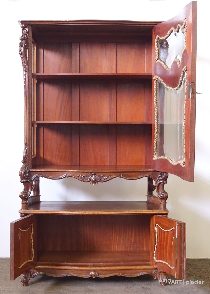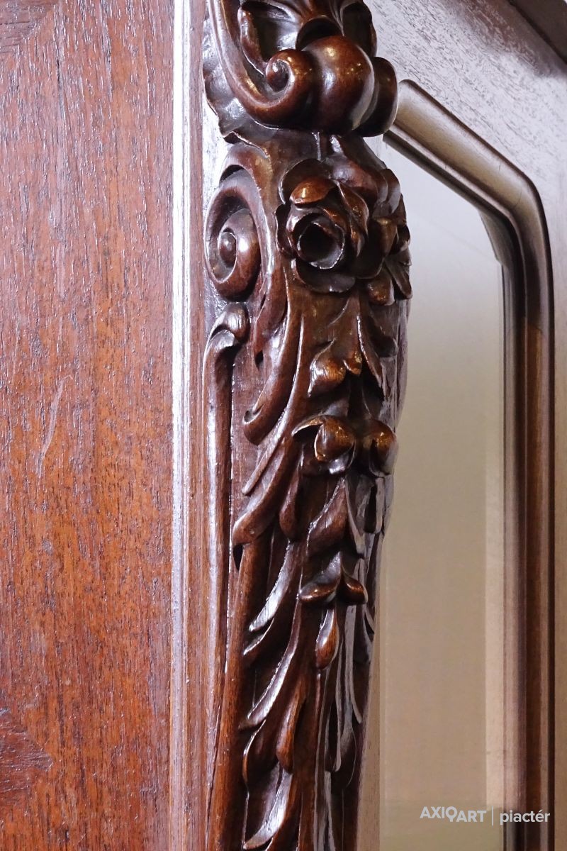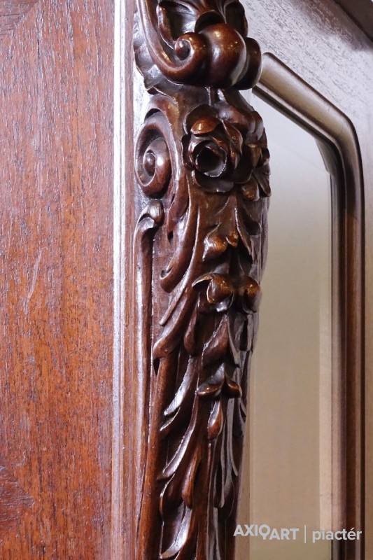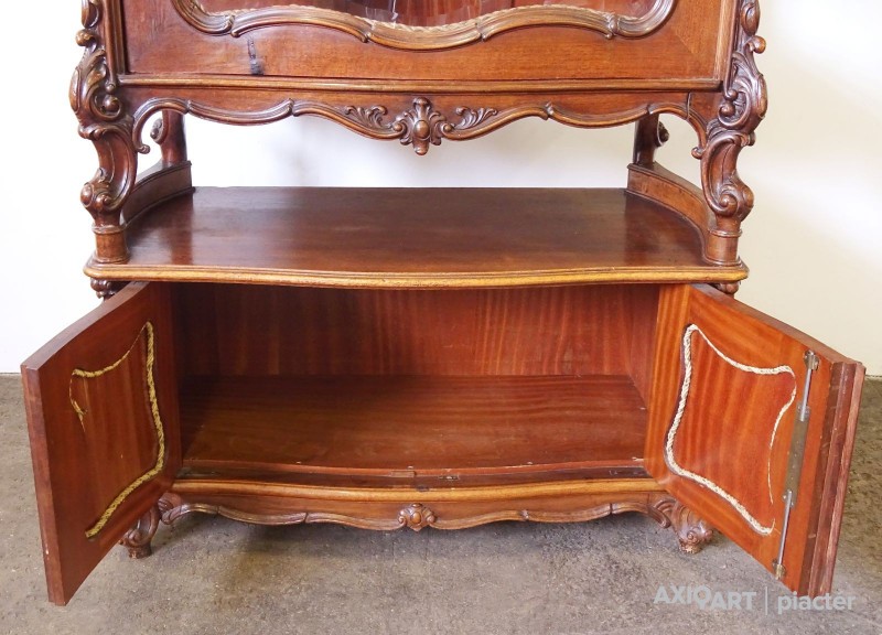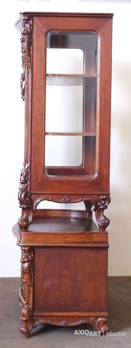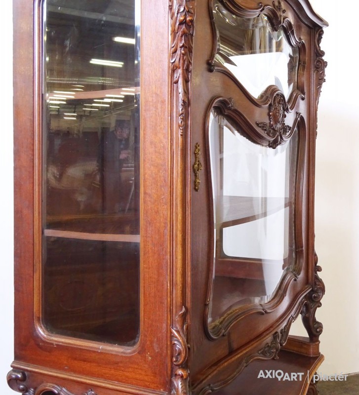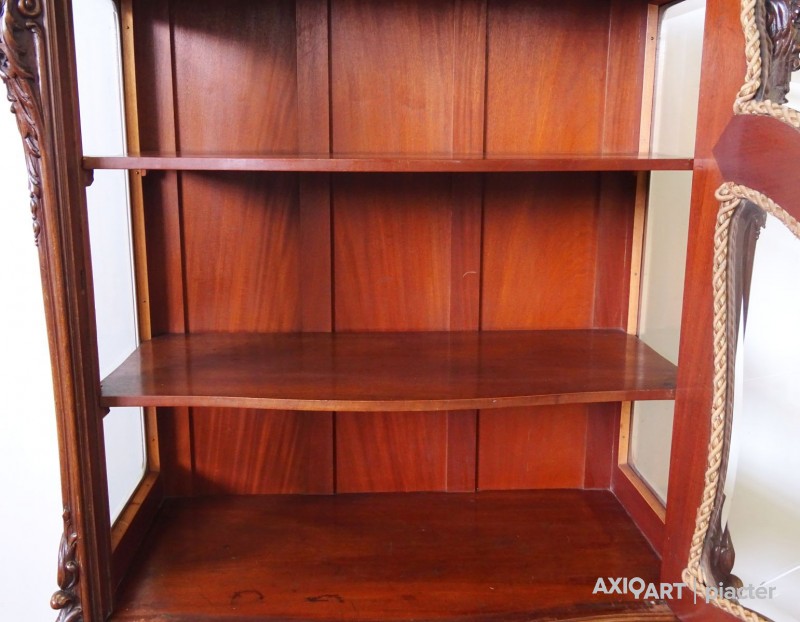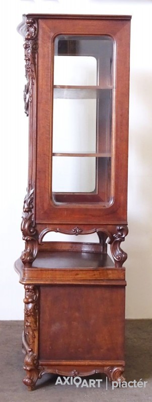 Gyönyörű, antik, faragványokkal gazdagon díszített, eredeti állapotában lévő vitrin, az 1800-as évek végéről. Az ajtók zárakkal rendelkeznek, kulcs jár hozzá. Az ajtókban hibátlan, gyönyörű ívelt metszett üvegek találhatók.
