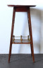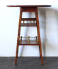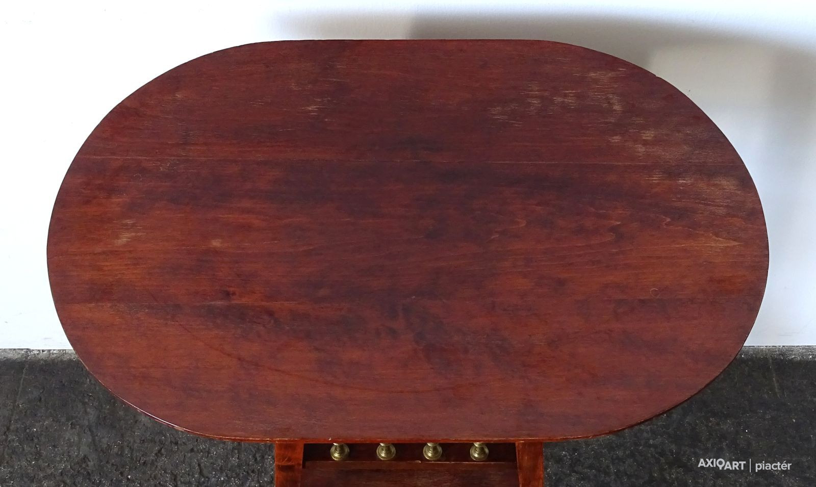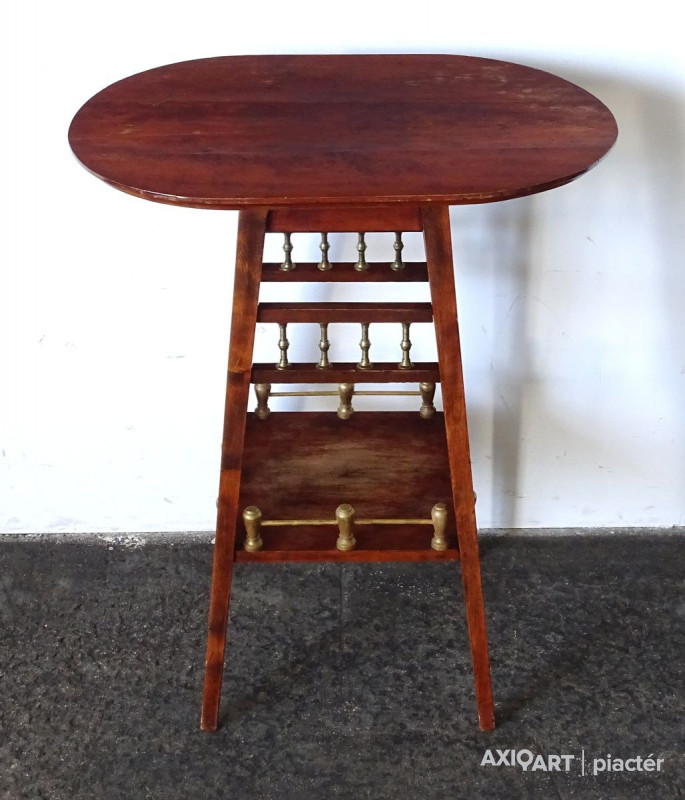 Antik, szép állapotú, ovális alakú lerakó asztal, virágtartó állvány. Oldalán áttört díszítés, réz betétekkel. Lent egy kisebb polc található aranyozott szegéllyel.