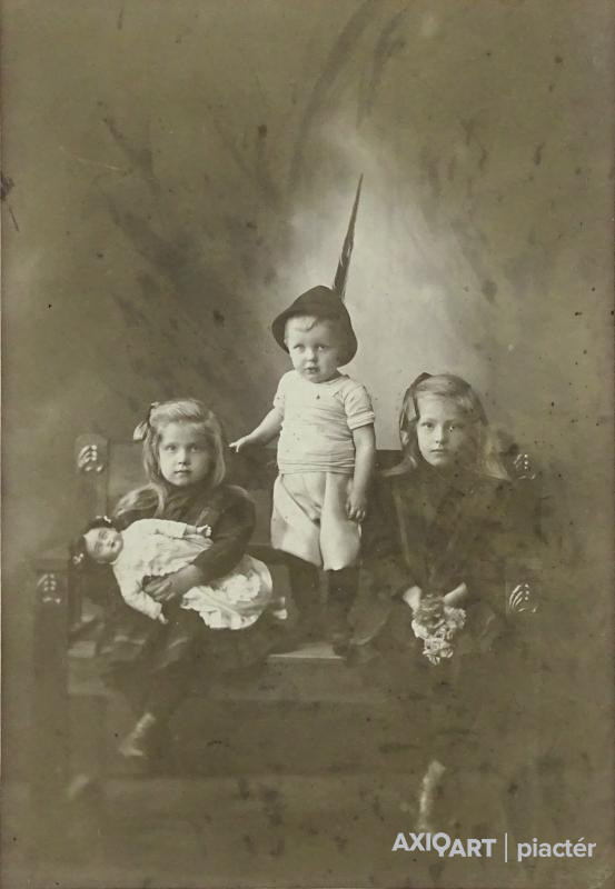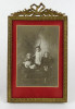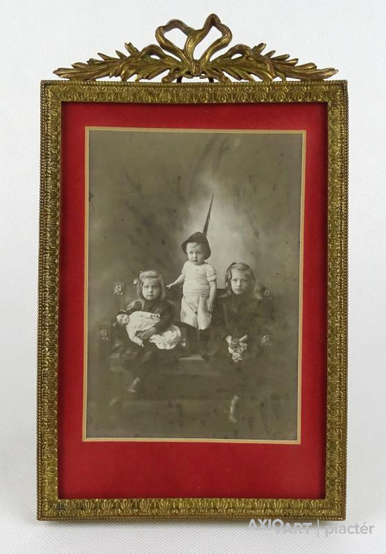 Antik, gyönyörű jelzett masnis keretben, üveglap mögött található antik gyerek fotográfia. Akasztási lehetőséggel és támasztékkal is rendelkezik. A fotón két kislány és egy tollas kalapos fiú, legényke látható.