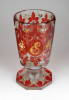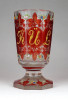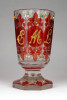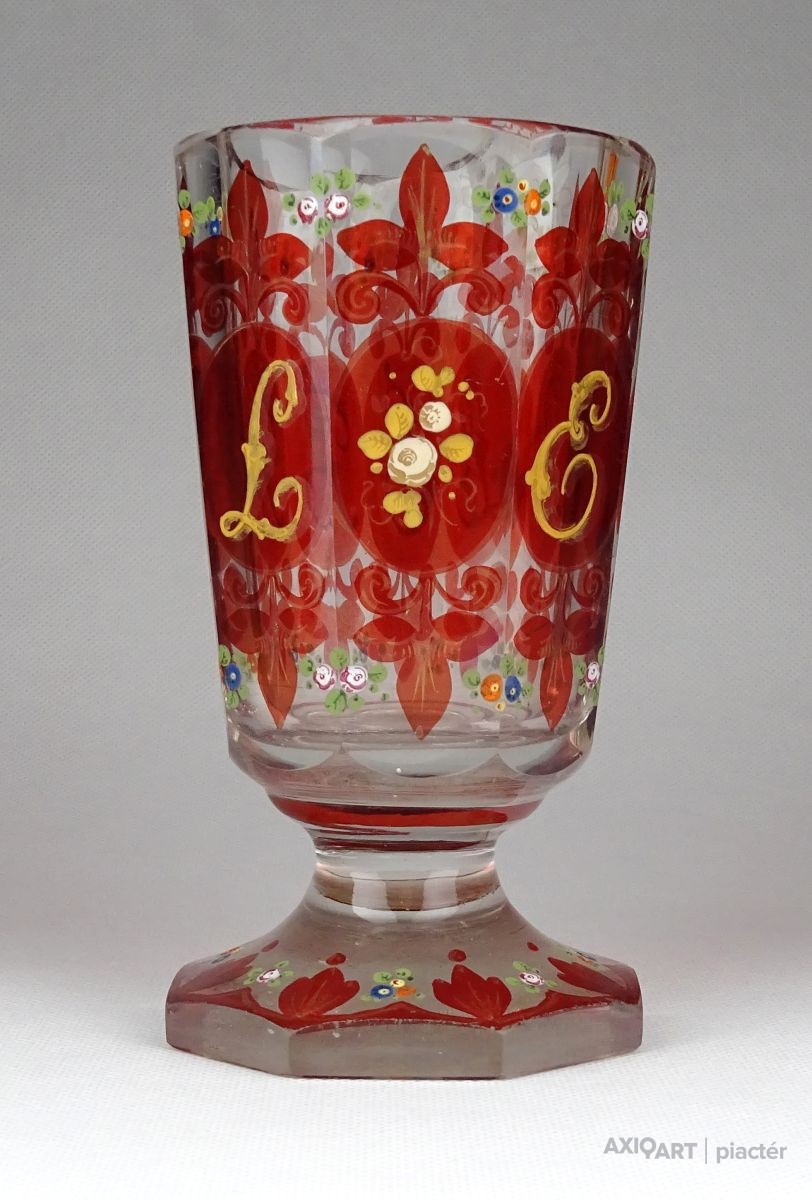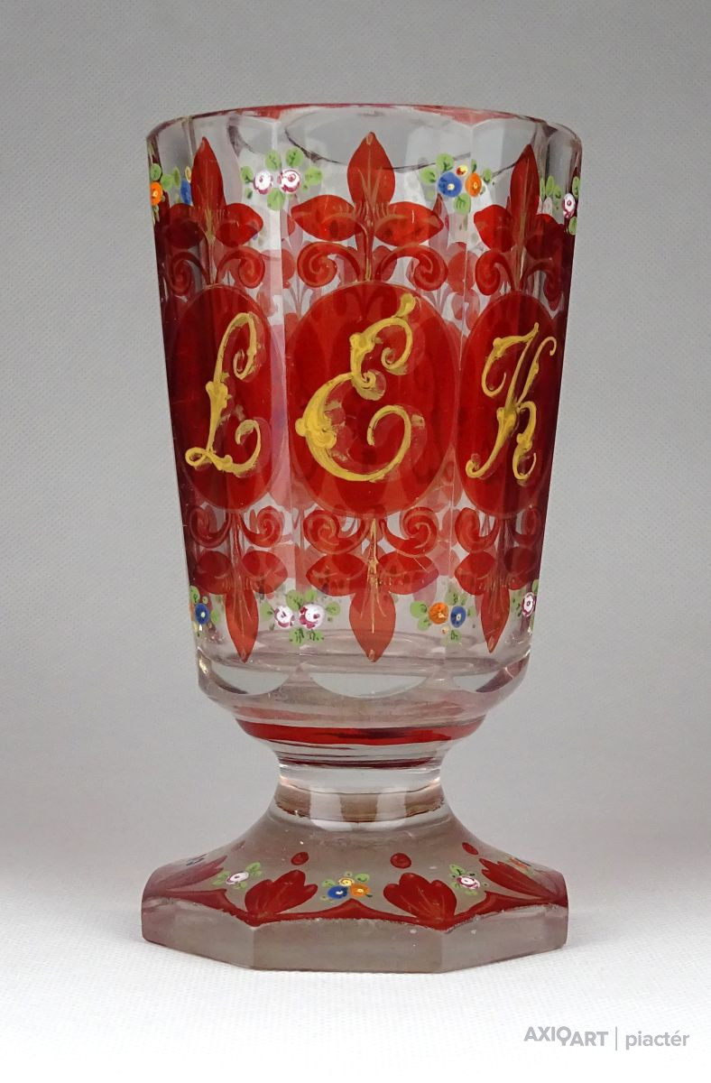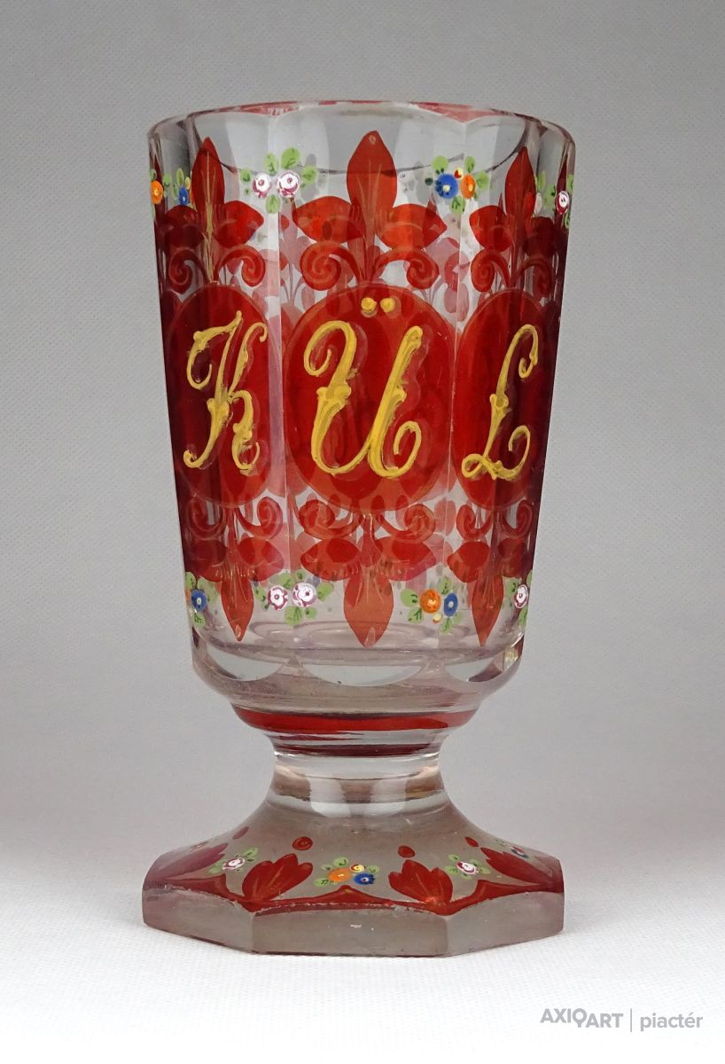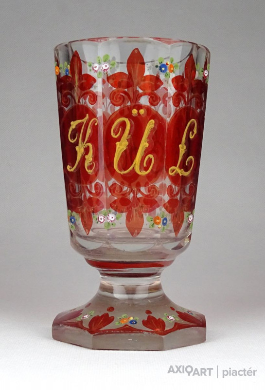 Antik hibátlan állapotú 1850 körüli, aranyozott bíborpácolt vastag falú Biedermeier talpas üveg pohár. Oldalán körben felirat: