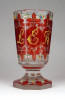 [1G346/UZ-K] Antik hibátlan állapotú 1850 körüli, aranyozott bíborpácolt vastag falú Biedermeier talpas üveg pohár. Oldalán körben felirat: EMLÉKÜL Magasság: 13.5 cm Szélesség: 7.3 cm Súly: 0.45 kg