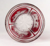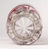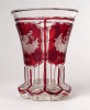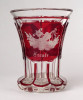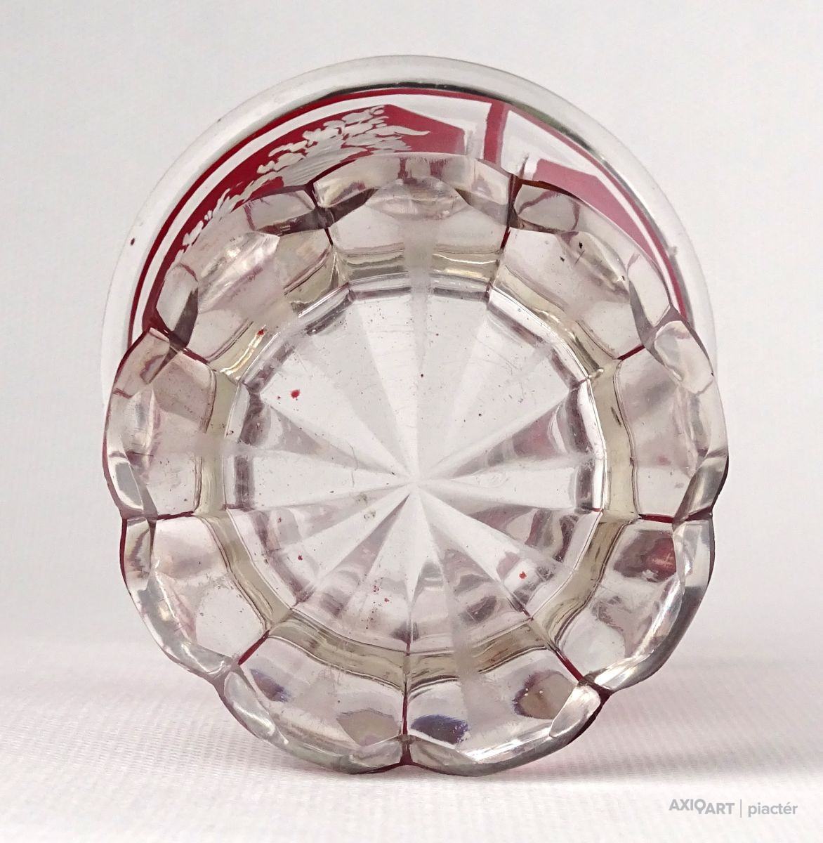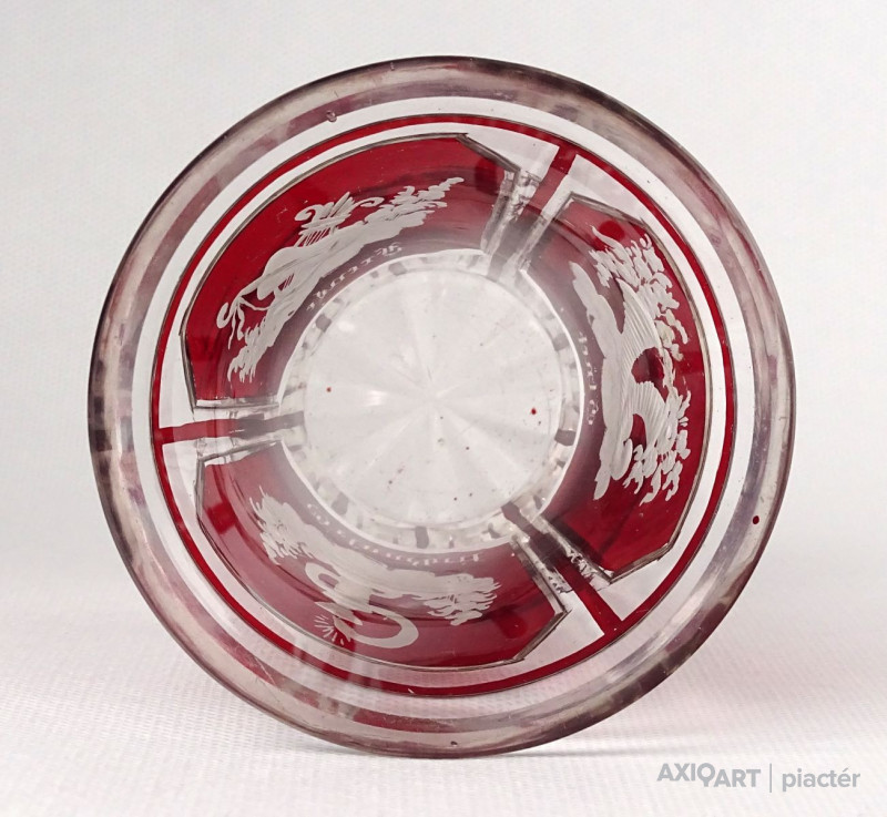 Antik XIX. század végéről való bíborpácolt vastag falú csiszolt Biedermeier talpas üveg pohár. Oldalán körben háromosztatú, részletgazdag csiszolatokkal díszített. Korából adódó kisebb sérülések találhatók rajta.