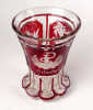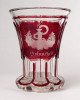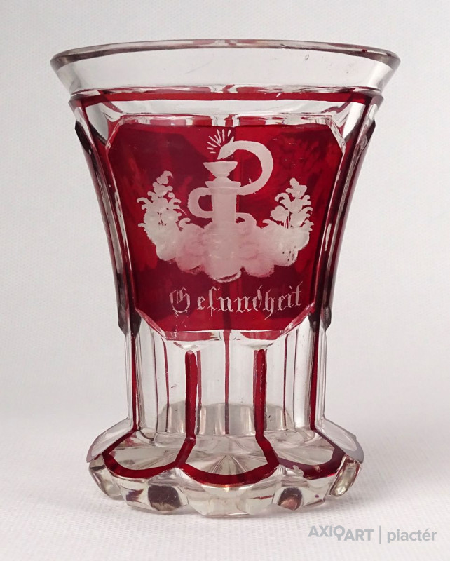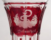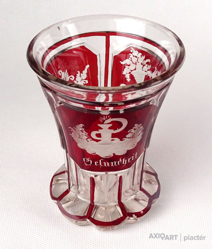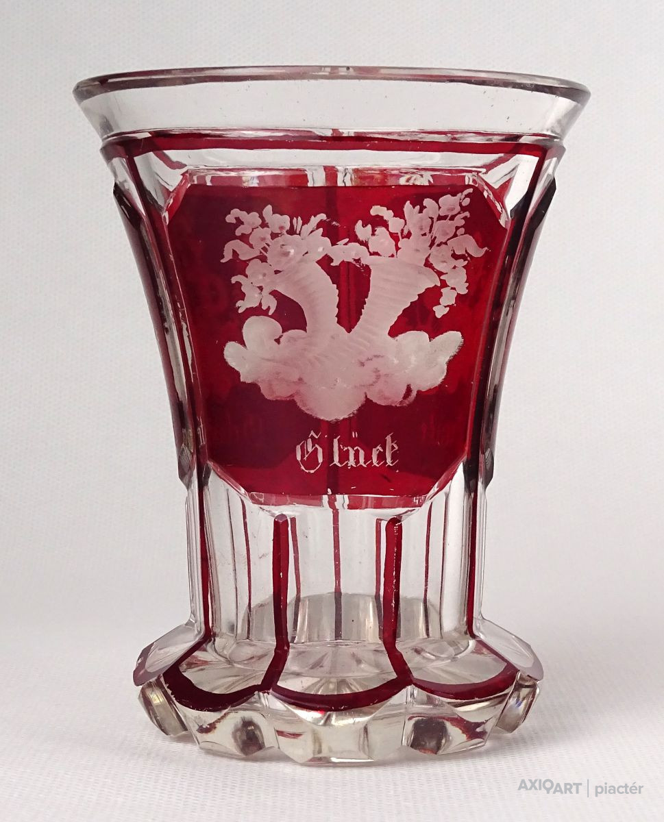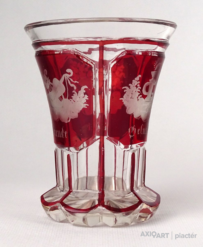 [1Q778/Z010] Antik XIX. század végéről való bíborpácolt vastag falú csiszolt Biedermeier talpas üveg pohár. Oldalán körben háromosztatú, részletgazdag csiszolatokkal díszített. Korából adódó kisebb sérülések találhatók rajta. Feliratok: GLÜCK - FEUDE - GESUNDHEIT (szerencse - barátság - egészség) Magasság: 11 cm Szélesség: 8.7 cm Súly: 0.32 kg