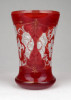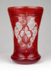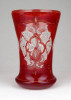 [0U964/UZ-K] Antik kézzel festett, bíborpácolt fújt üveg pohár. Aranyozása kopottas. Talpán repedés található, lásd fotó. Magasság: 11.3 cm Szélesség: 7.5 cm Súly: 0.205 kg