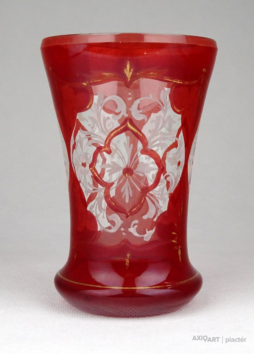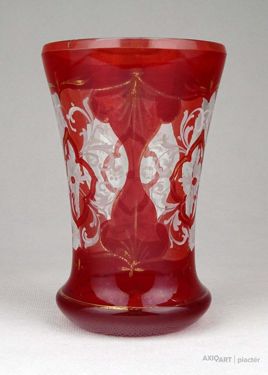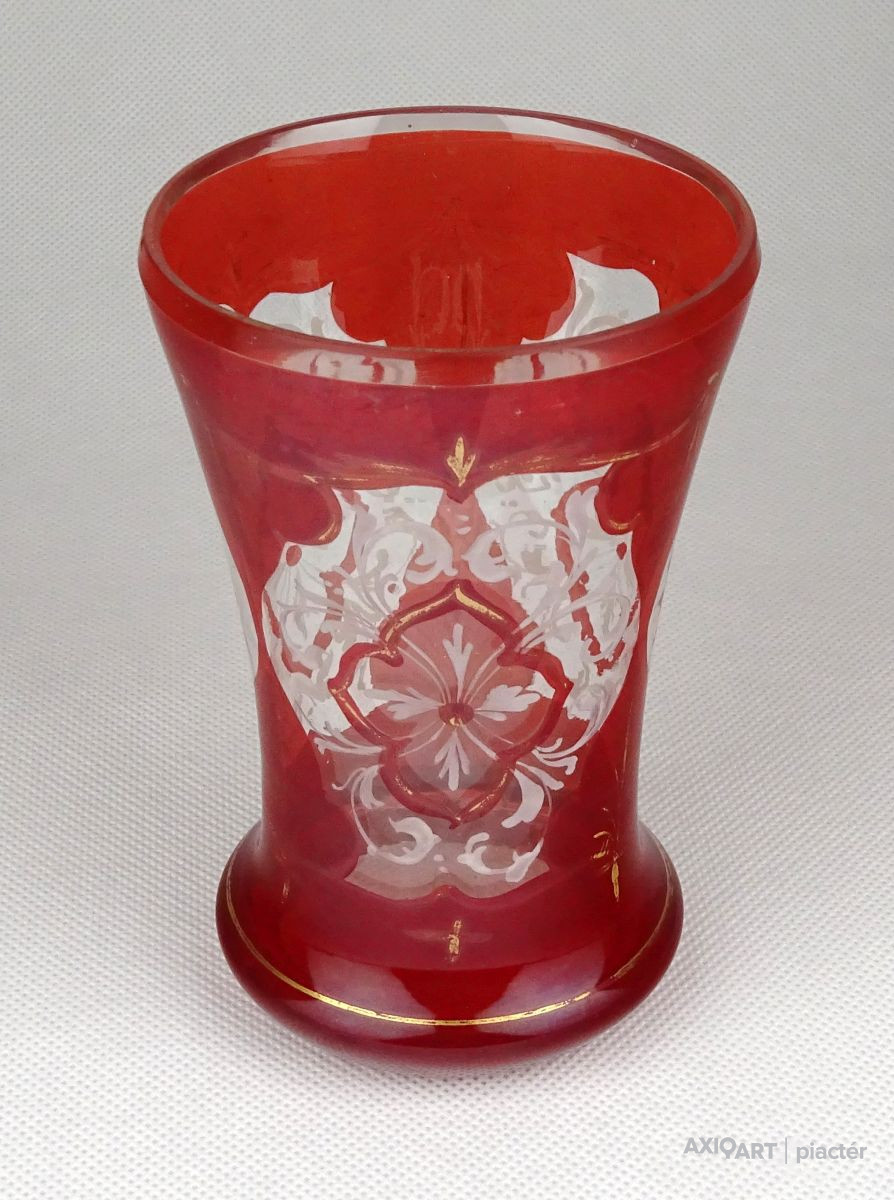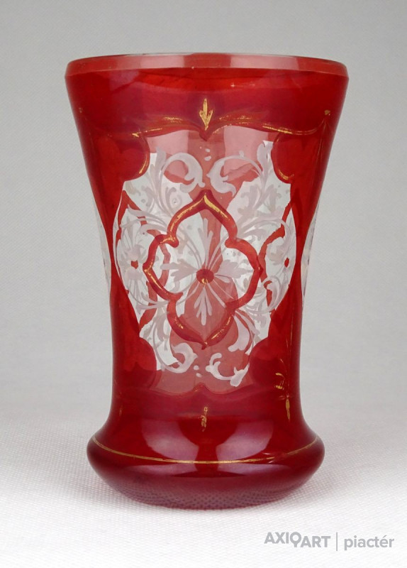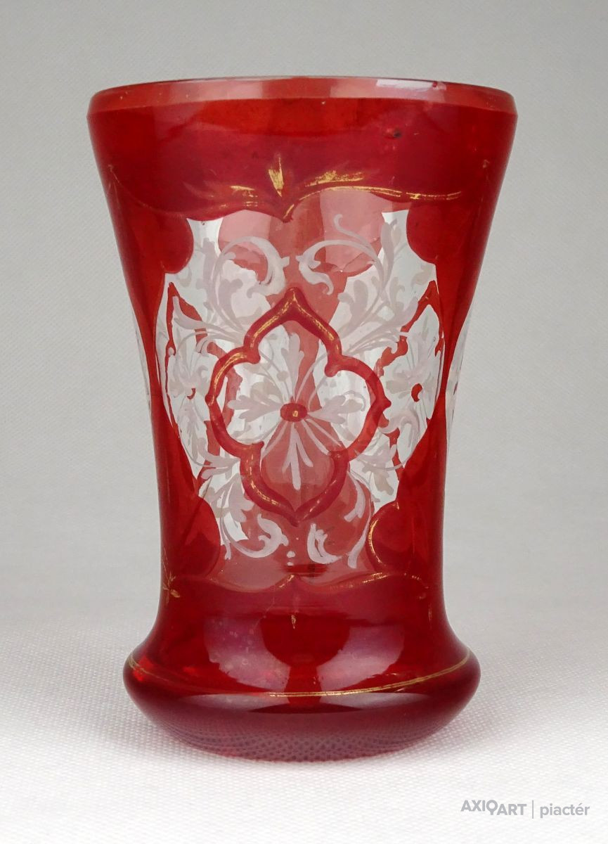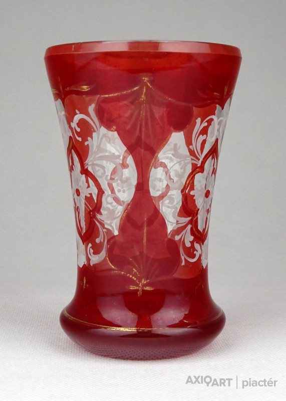 Antik kézzel festett, bíborpácolt fújt üveg pohár. Aranyozása kopottas. Talpán repedés található, lásd fotó.