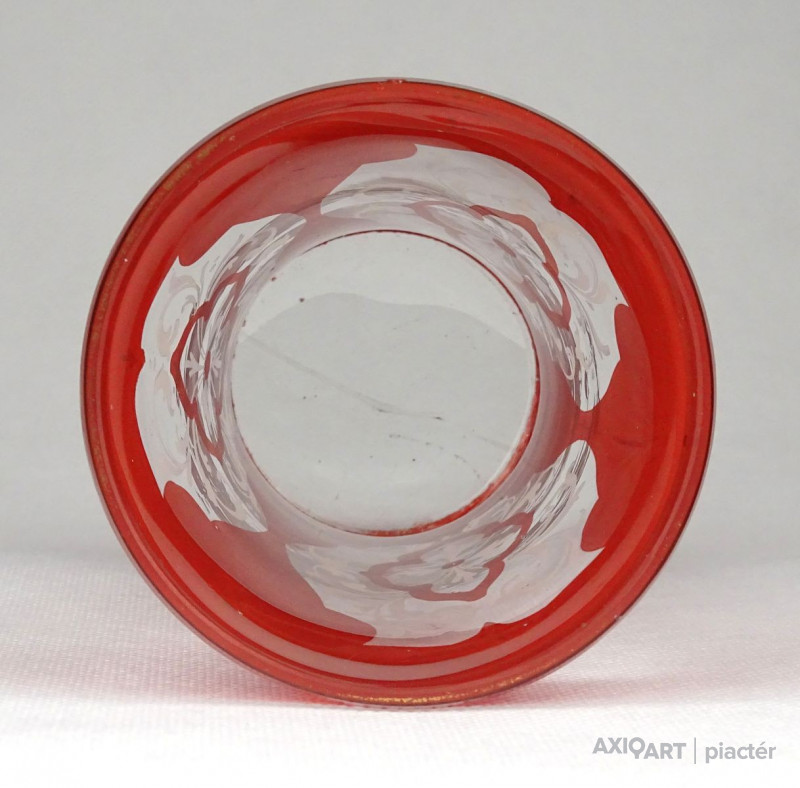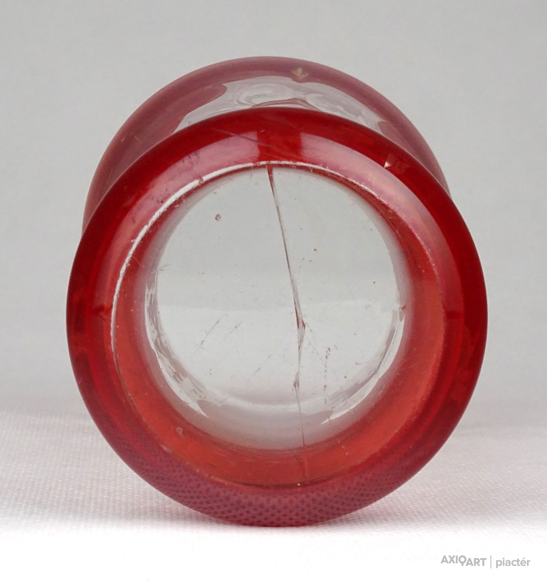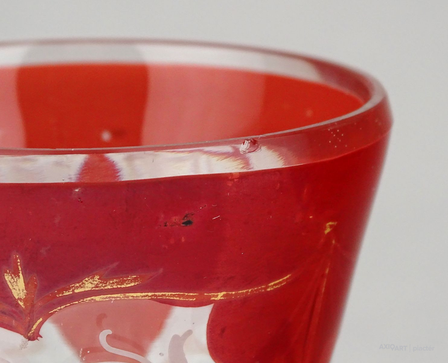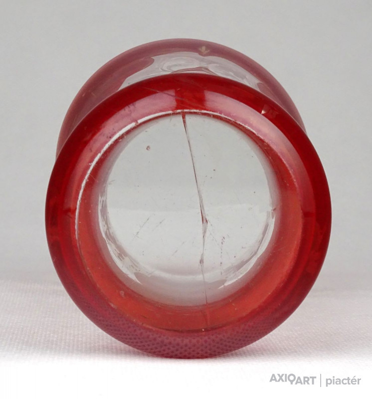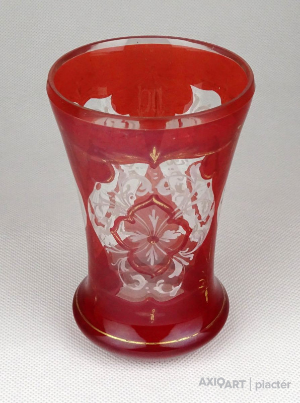 Antik kézzel festett, bíborpácolt fújt üveg pohár. Aranyozása kopottas. Talpán repedés található, lásd fotó.
