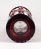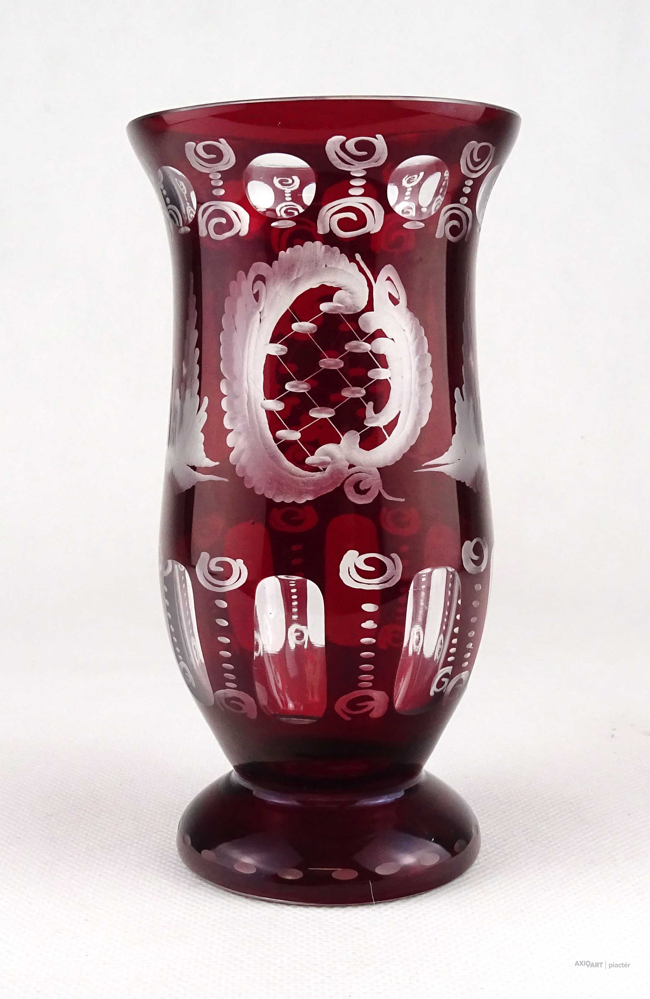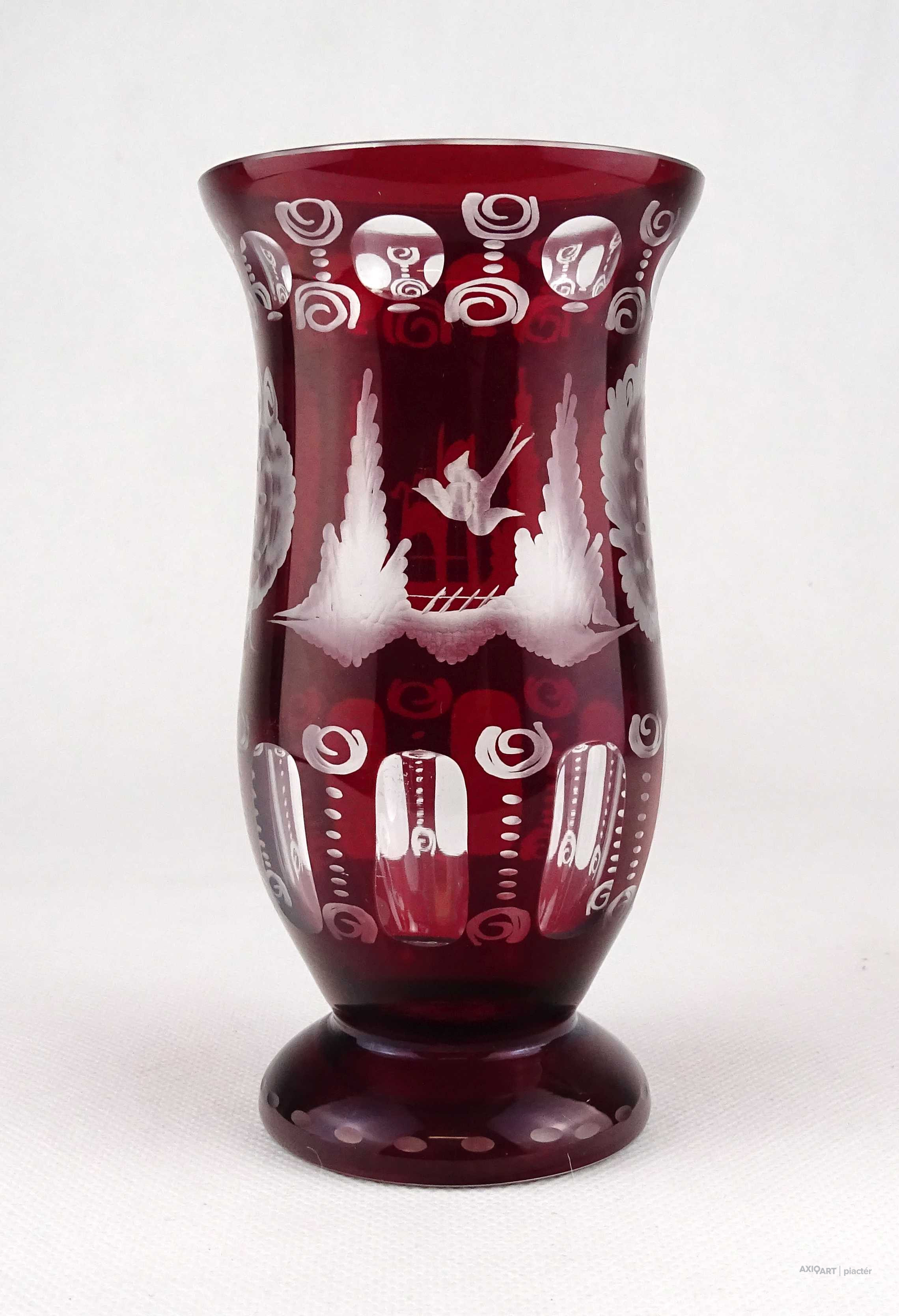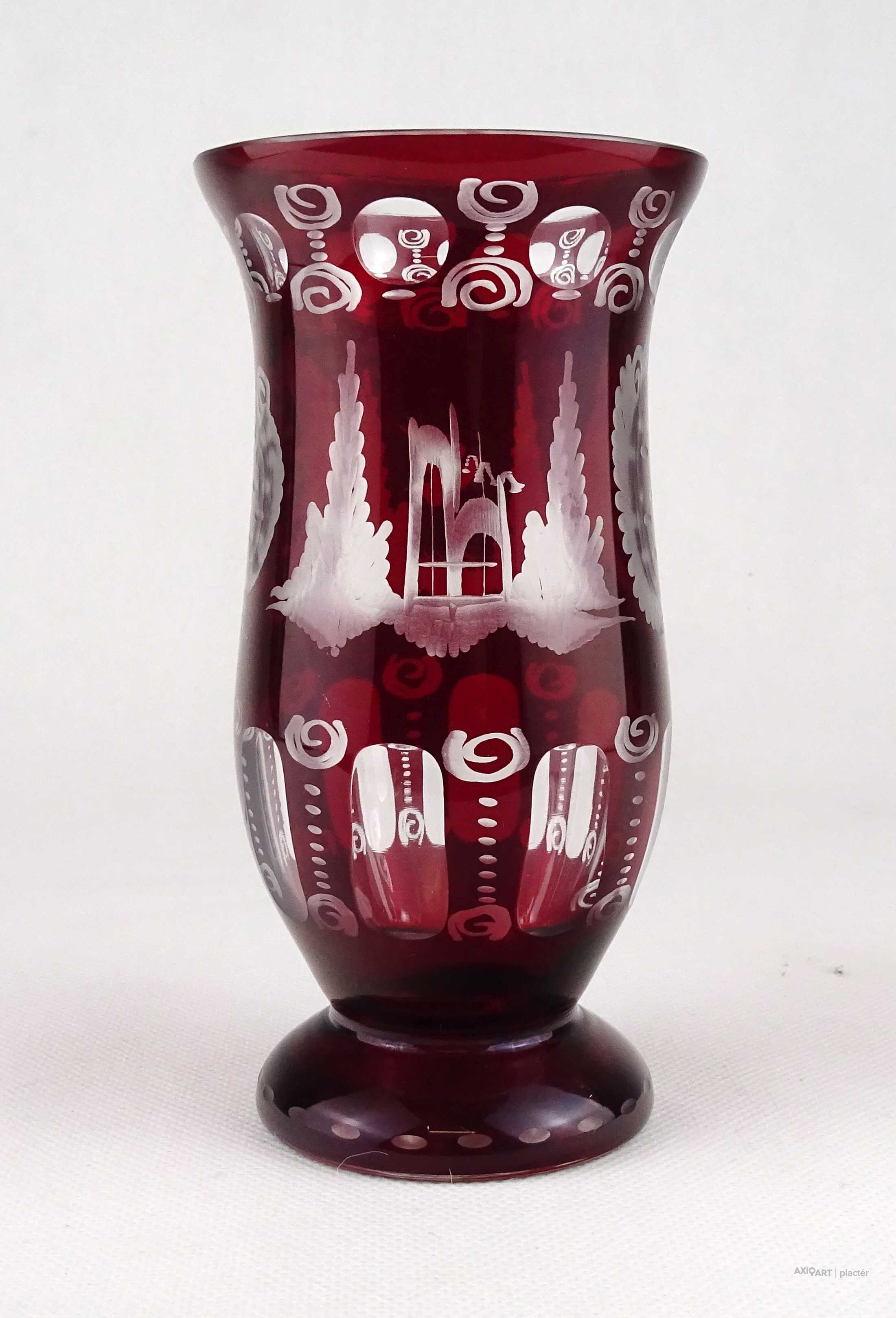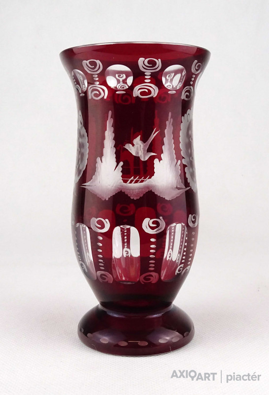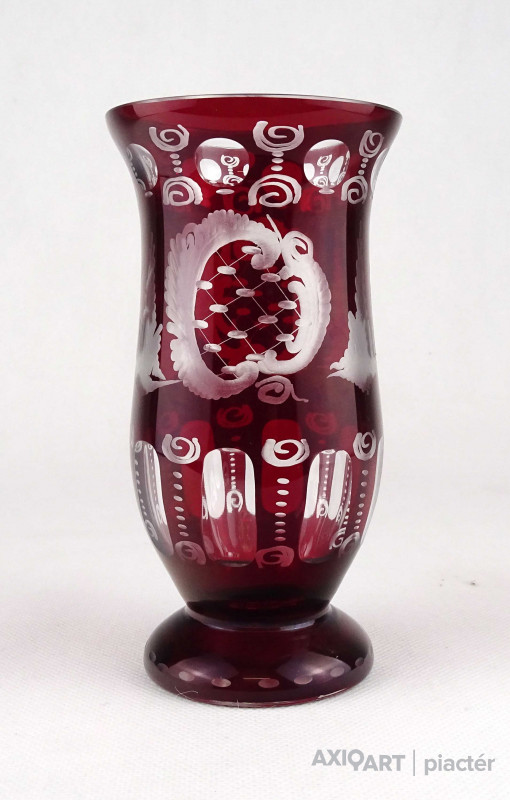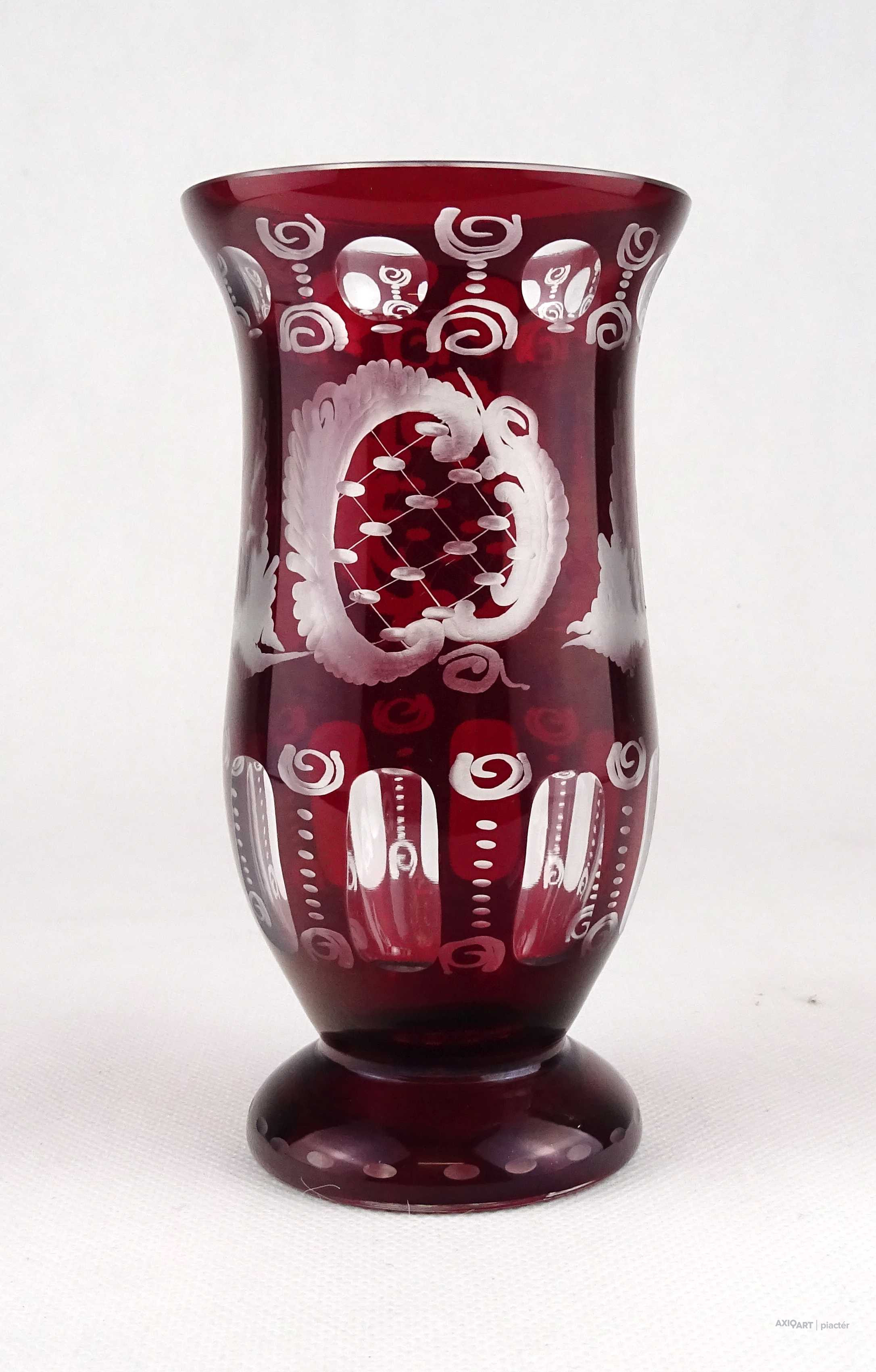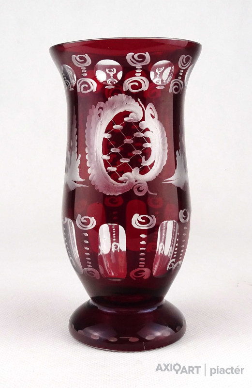 Antik, hibátlan állapotú, bíborpácolt Eggermann csiszolt üveg váza, díszváza. A váza teljes felülete finom csiszolatokkal díszített.