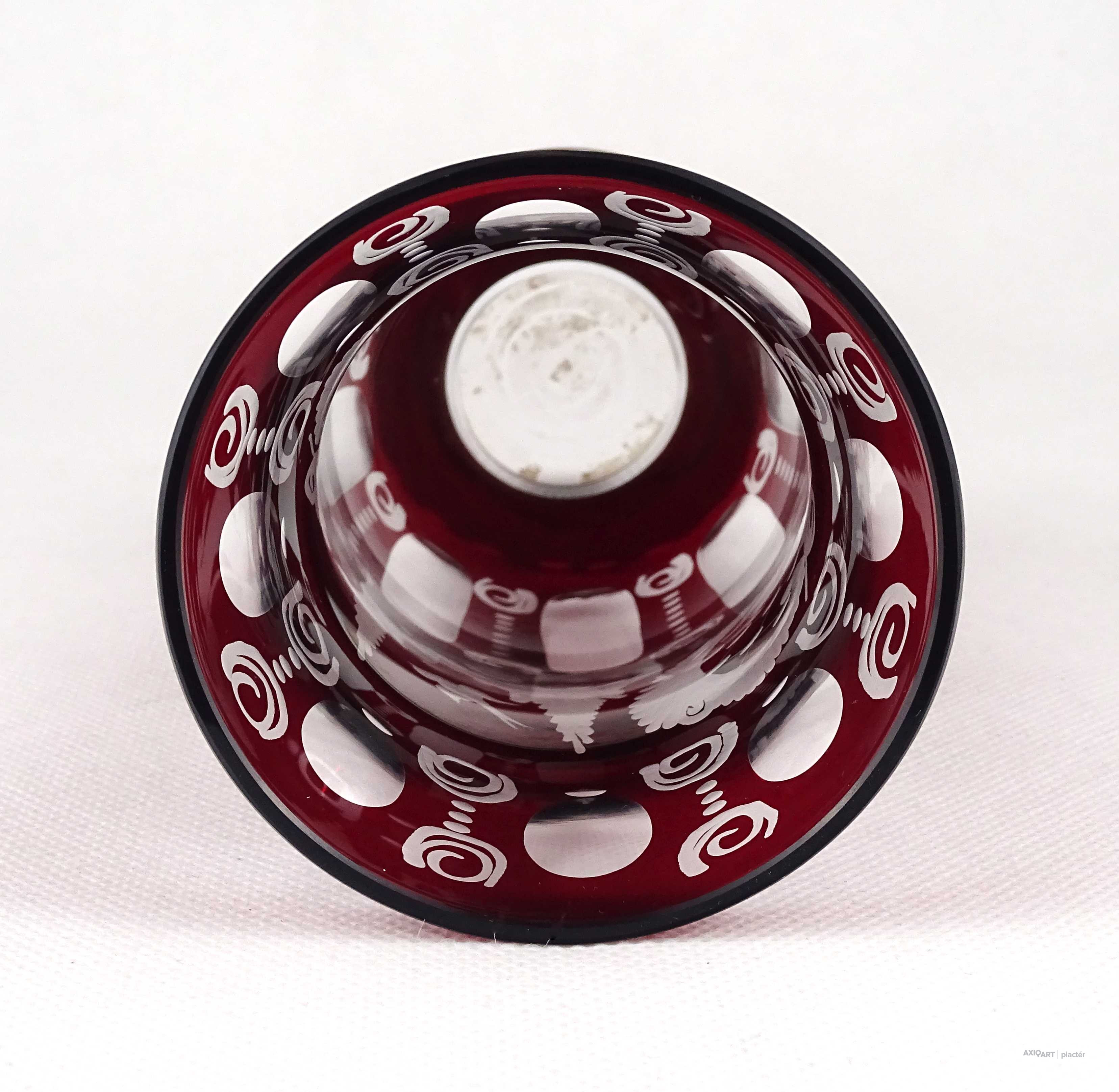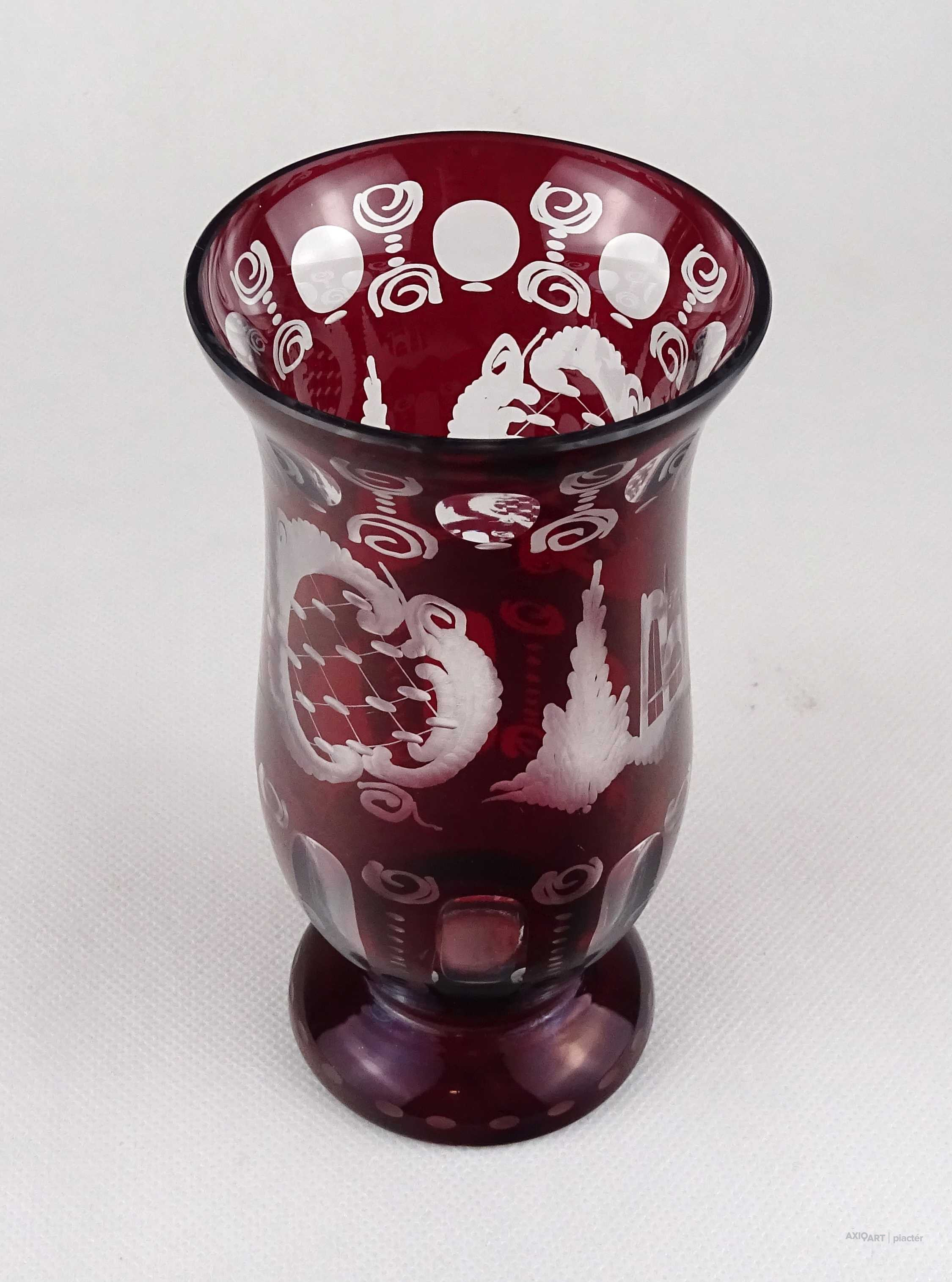 [1Z202/Z023] Antik, hibátlan állapotú, bíborpácolt Eggermann csiszolt üveg váza, díszváza. A váza teljes felülete finom csiszolatokkal díszített. Magasság: 16 cm Szélesség: 8.2 cm Súly: 0.32 kg