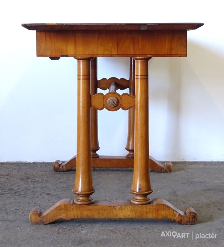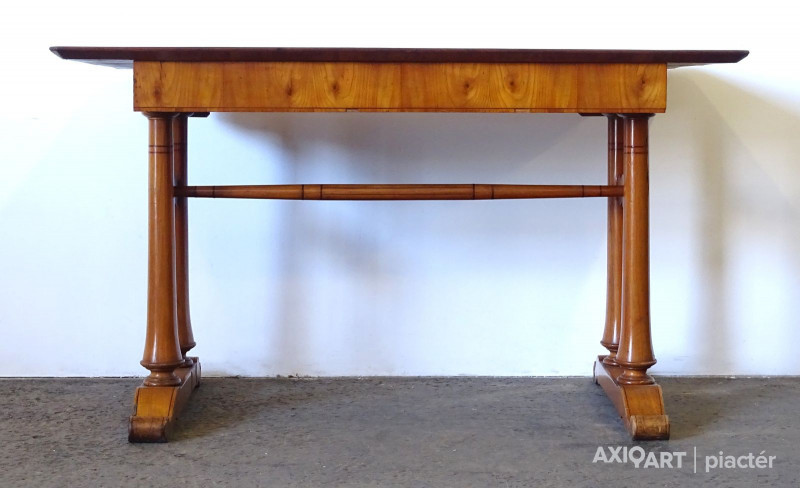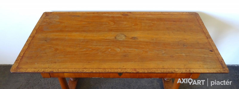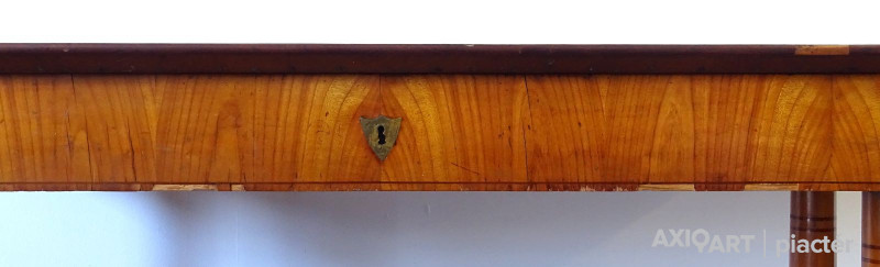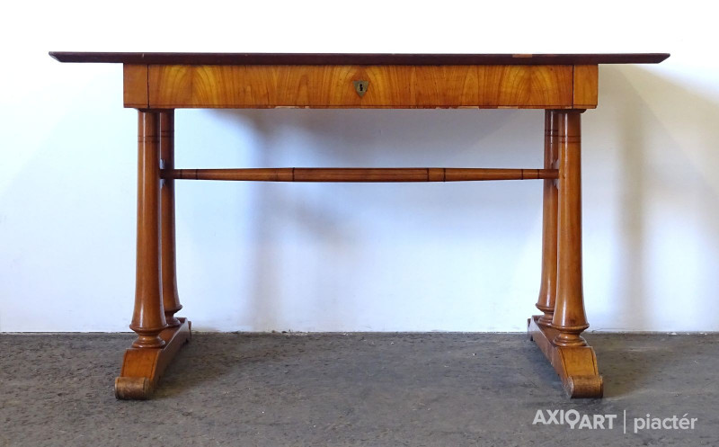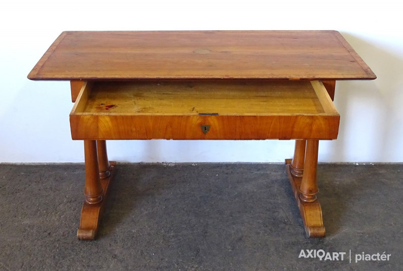 Antik, szép állapotban megmaradt cseresznyefa furnéros széles Biedermeier asztal, íróasztal. Egy darab nagy méretű fiókkal rendelkezik, rajta címerpajzs alakú réz zárcím látható. Korából adódó kisebb furnérhibák találhatók rajta.