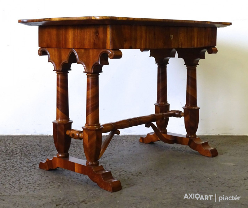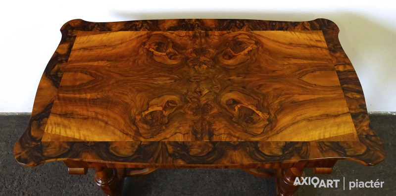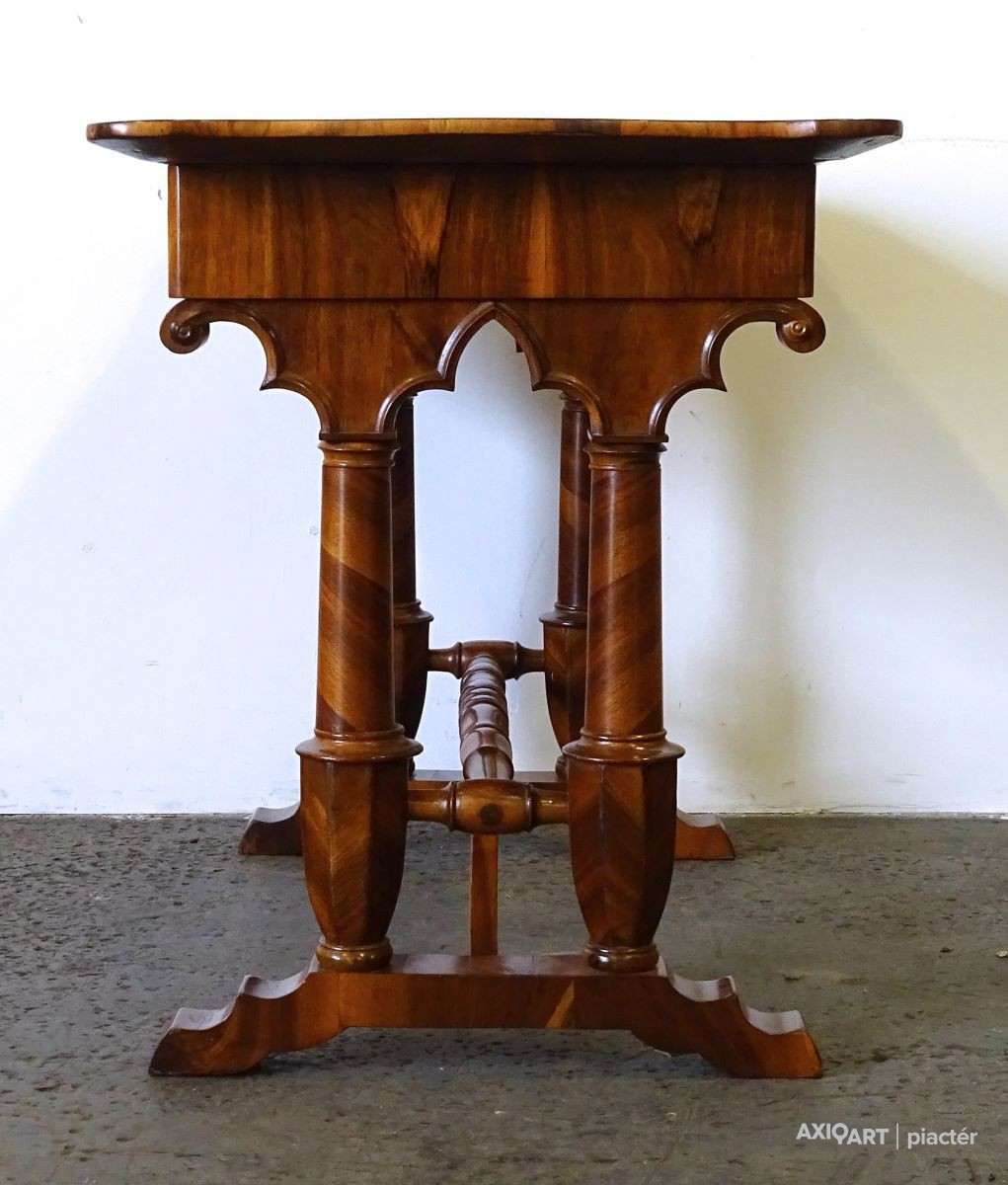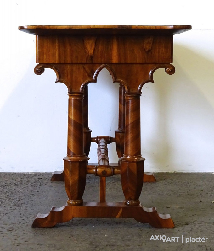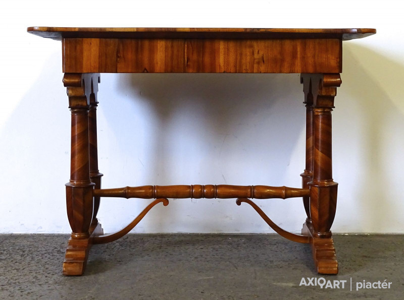 Antik, gyönyörű állapotú, azonnal enteriőrbe helyezhető rózsafa és diógyökér furnéros Biedermeier asztal, íróasztal. Egy darab fiókkal rendelkezik, rajta címerpajzs alakú réz zárcím látható.