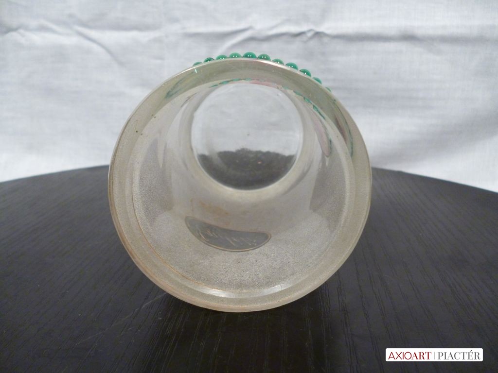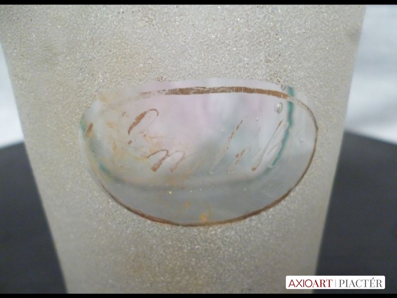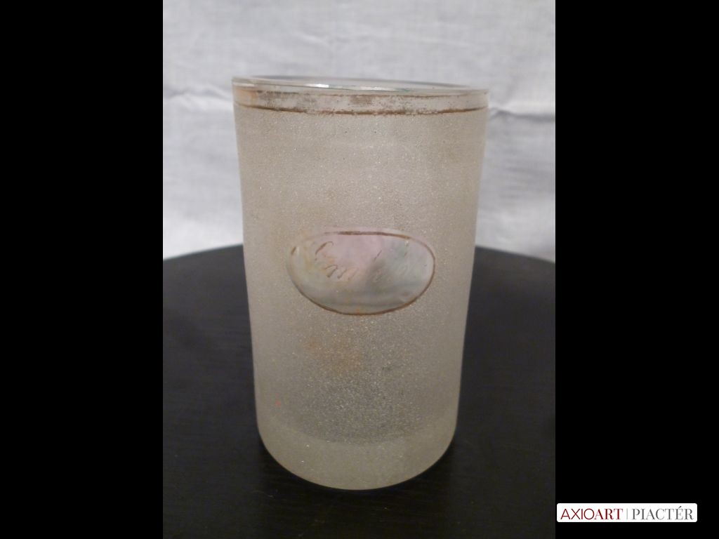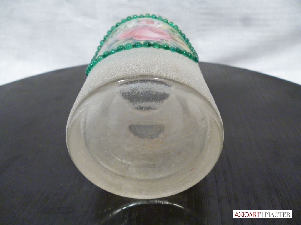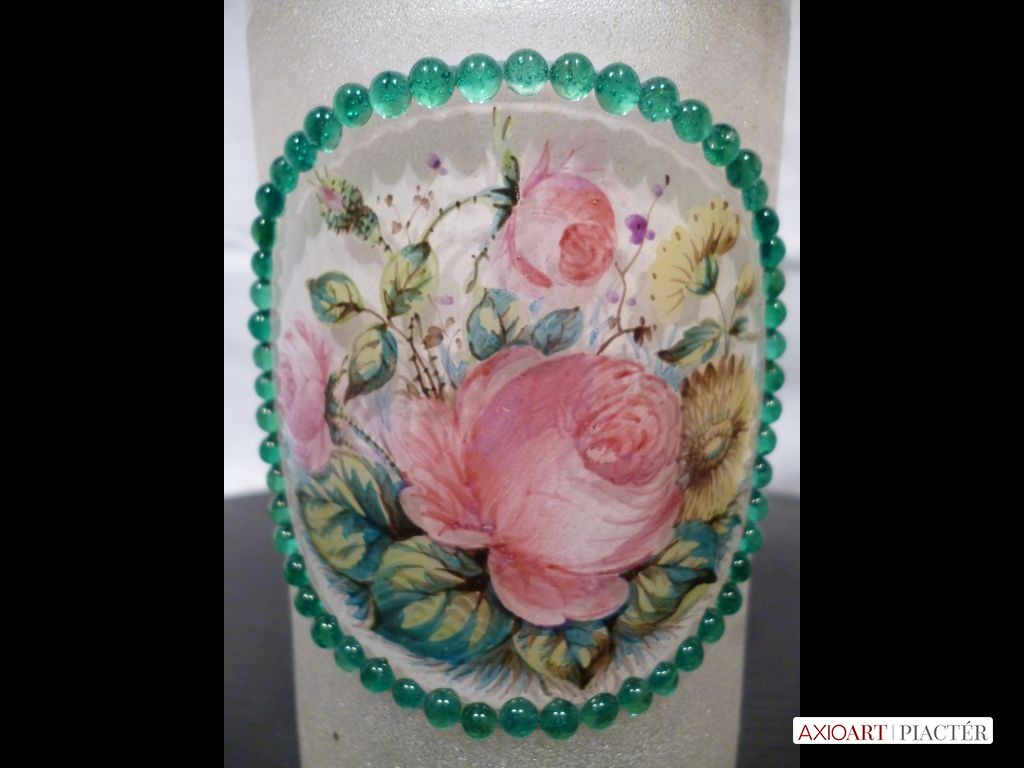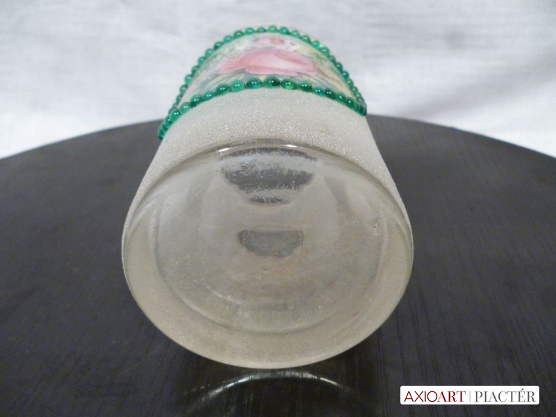 [1635/VTR-14] Gyűjteménybe való, gyönyörű emlékpohár, kúrapohár. Elején látható rózsás kézi festésű, gyöngy szerű plasztikus üveg dísz veszi körül. Hátulján kissé megkopott EMLÉK felirat. Kora 1850 körüli vastagfalú üveg. Magasság: 17 cm Szélesség: 7.2 cm   Magassága 17 cm, felső átmérője 7,2 cm.