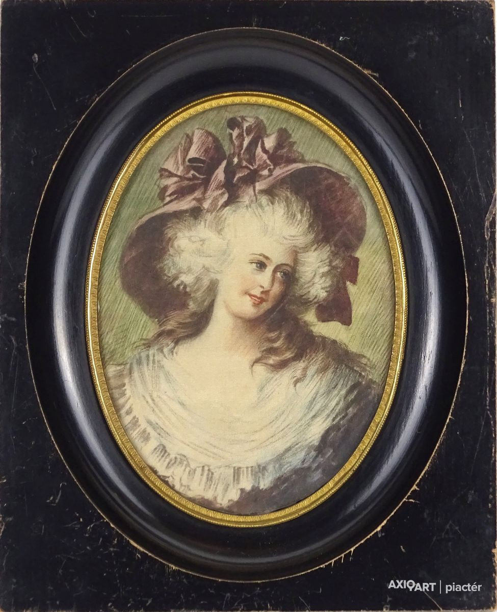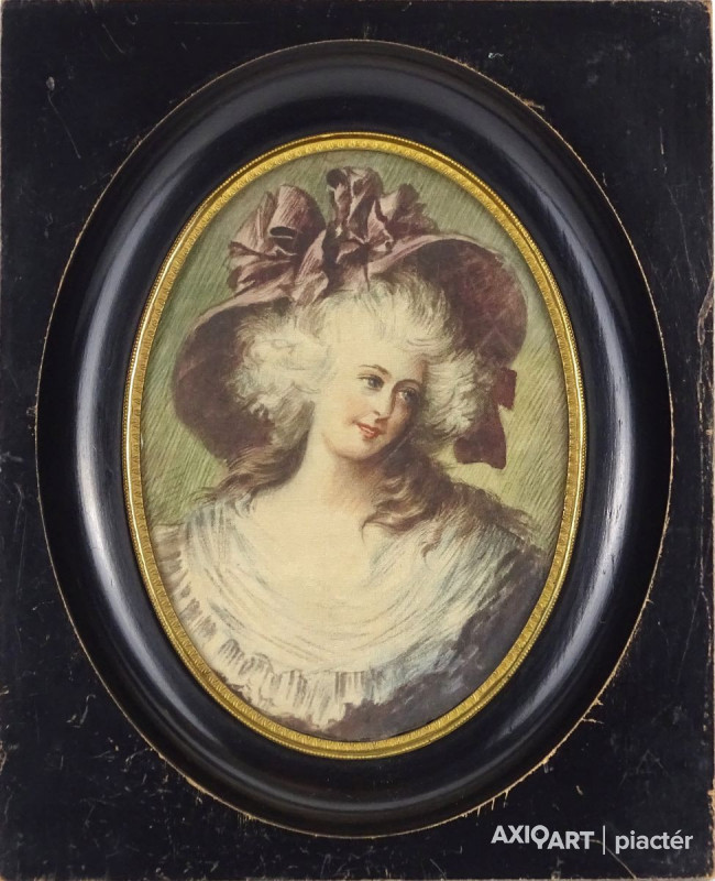 1800-as évek közepi jelzetlen selyemfestmény, miniatúra, kis méretű barokk úri hölgy dáma képe, portré, női portré. Üveg mögött, szép állapotú, antik fekete keretben. Akasztási lehetőséggel rendelkezik.
