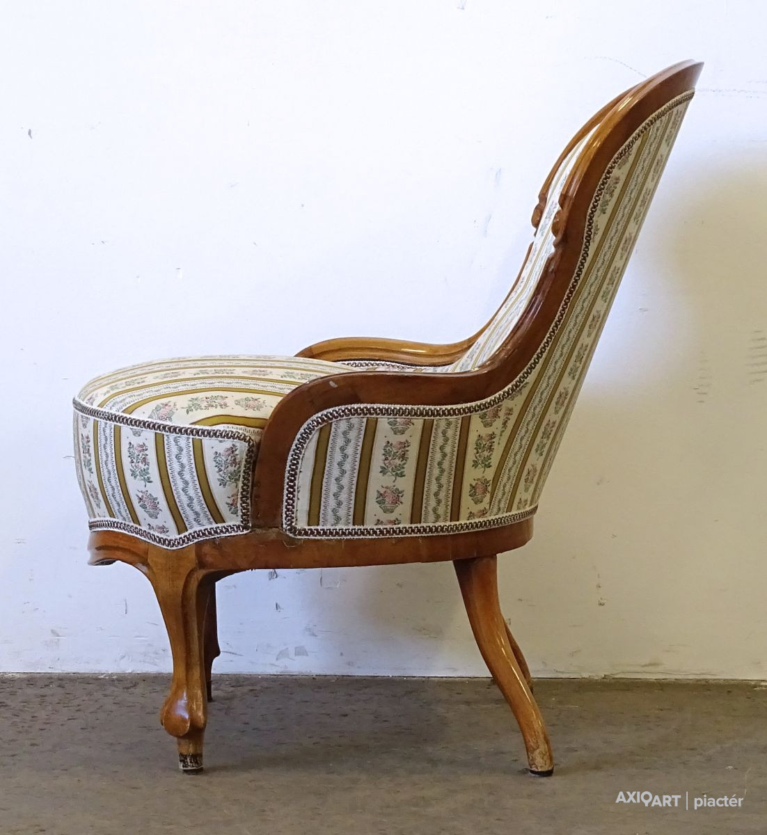 Antik, szép, azonnal enteriőrbe helyezhető állapotban lévő kis méretű Biedermeier fotel, kisasszony fotel, szalongarnitúra része. Szép állapotú kárpittal, kényelmes epedarugós ülőfelülettel.