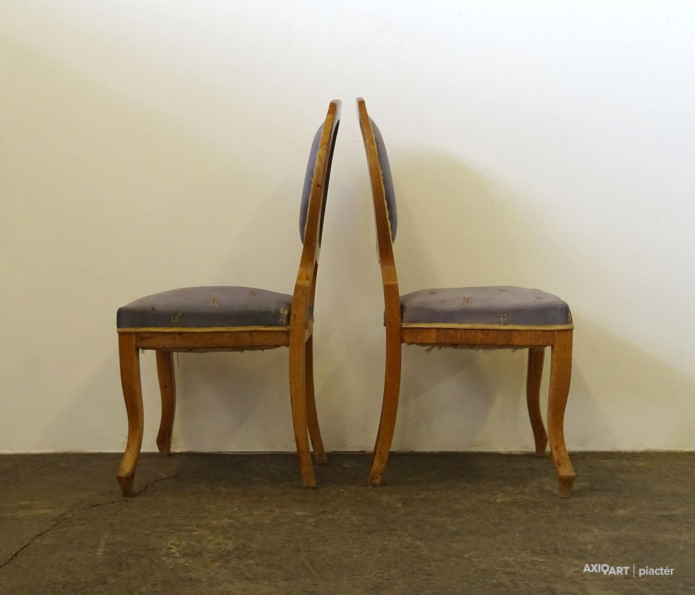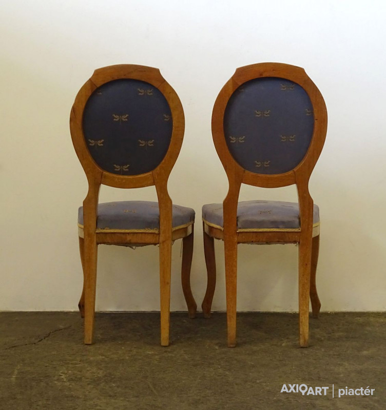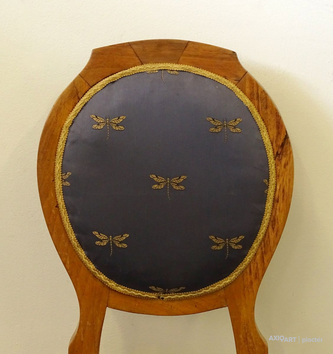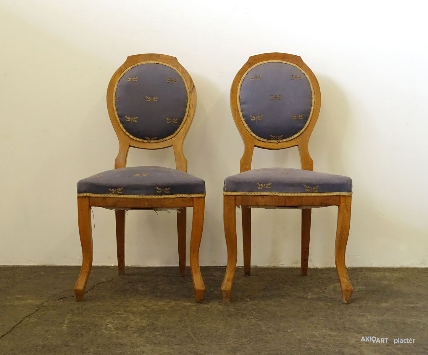 Szép állapotú, gyönyörű Biedermeier szék pár az 1800-as évek második feléből, cca 1880. Támlája és ülőfelülete kárpitozott. Rajta szitakötő mintás szürkéskék kárpittal.