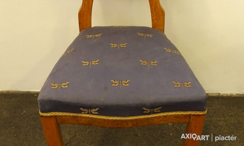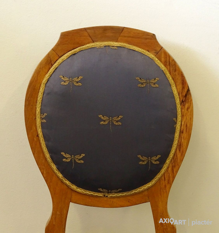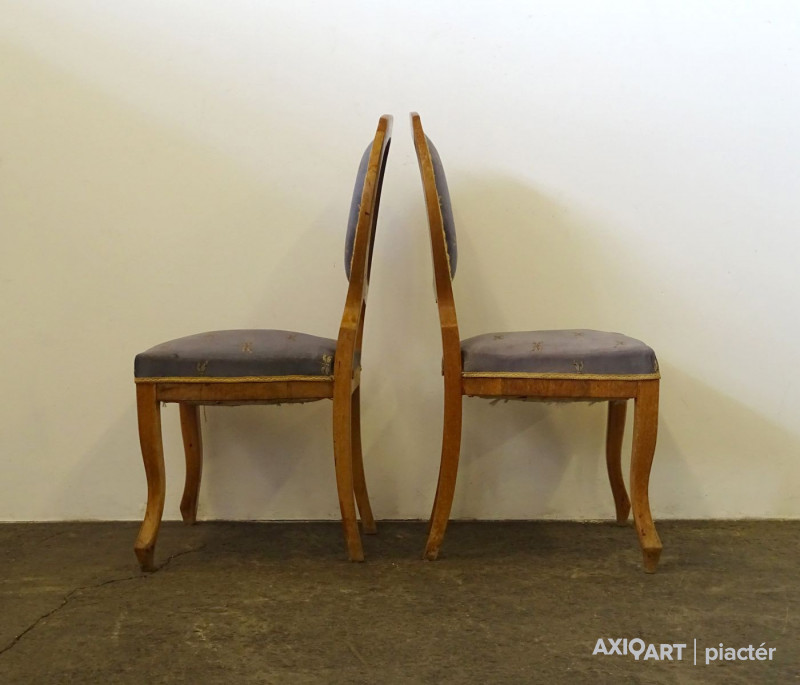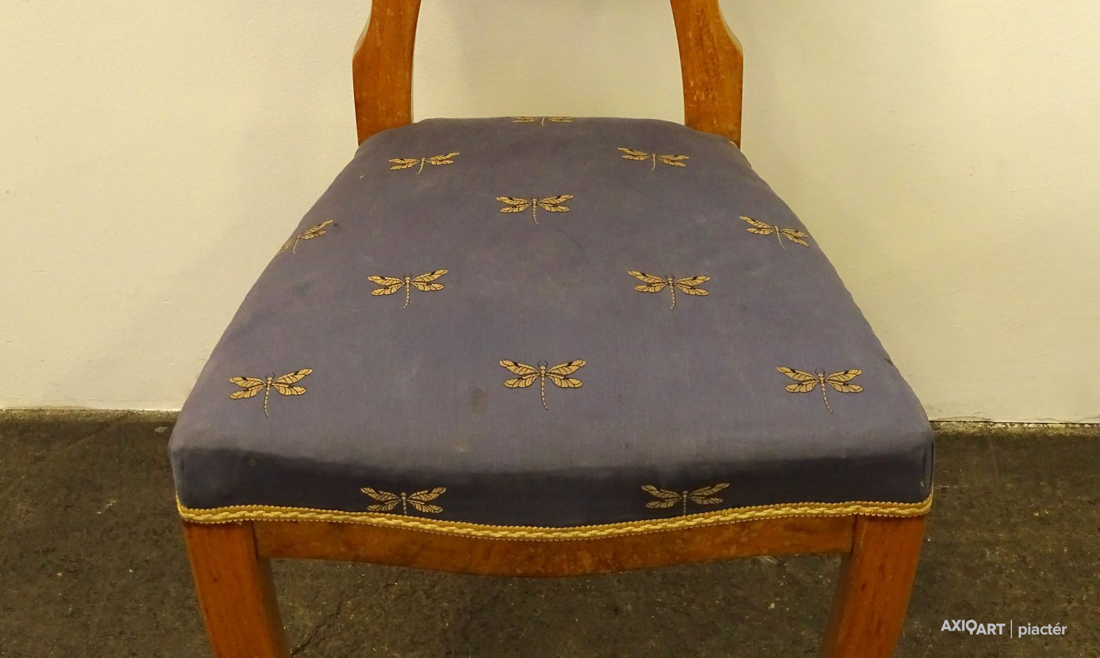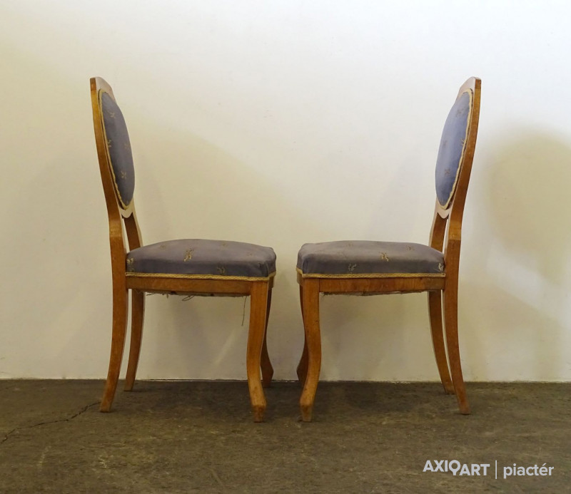 Szép állapotú, gyönyörű Biedermeier szék pár az 1800-as évek második feléből, cca 1880. Támlája és ülőfelülete kárpitozott. Rajta szitakötő mintás szürkéskék kárpittal.