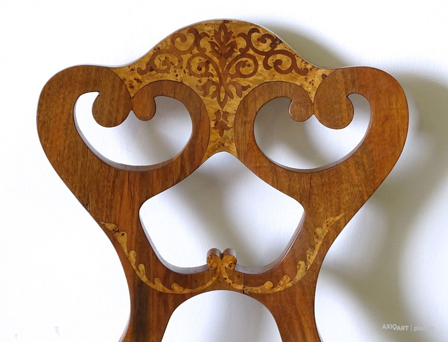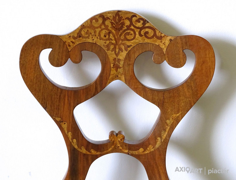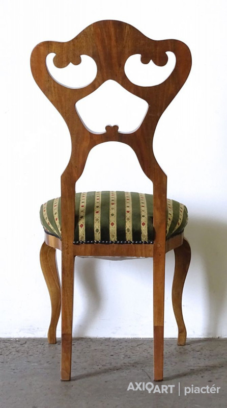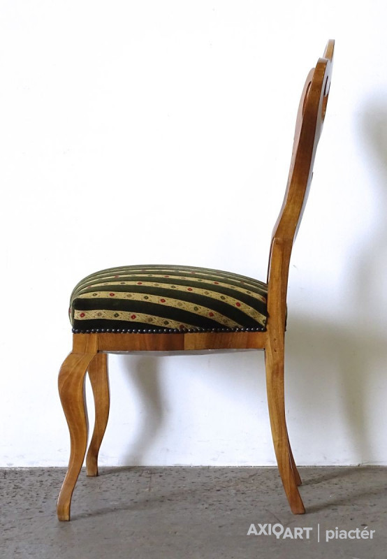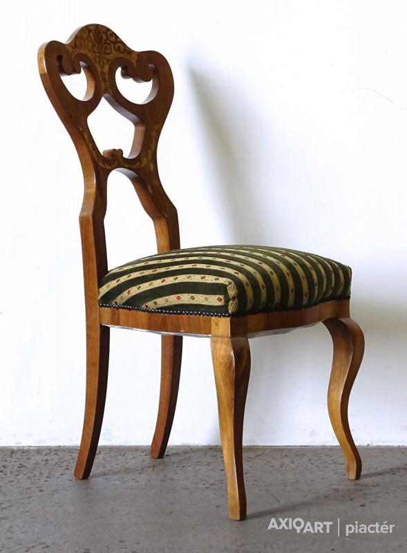 Hibátlan állapotú szép vastag svartnis Biedermeier szék, azonnal használatba vehető, enteriőrbe helyezhető állapotban van. Támláján gyönyörű intarzia díszítés. Ülőfelülete kényelmes epedarugós.