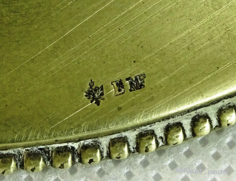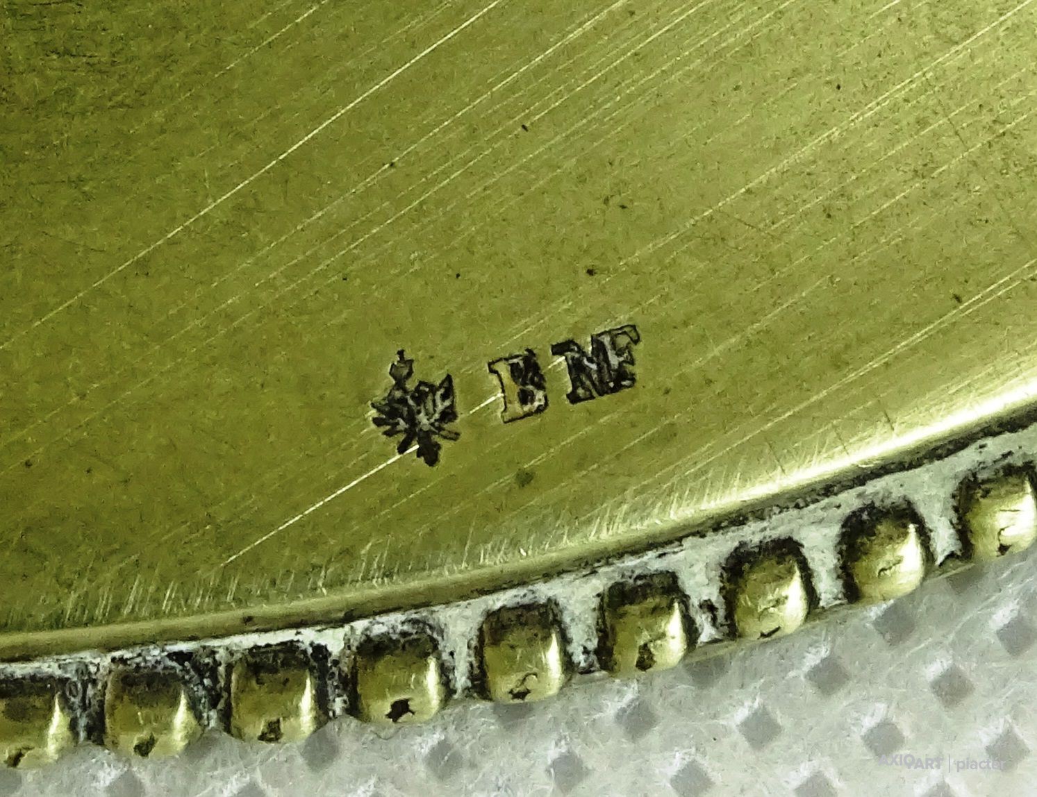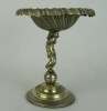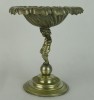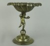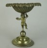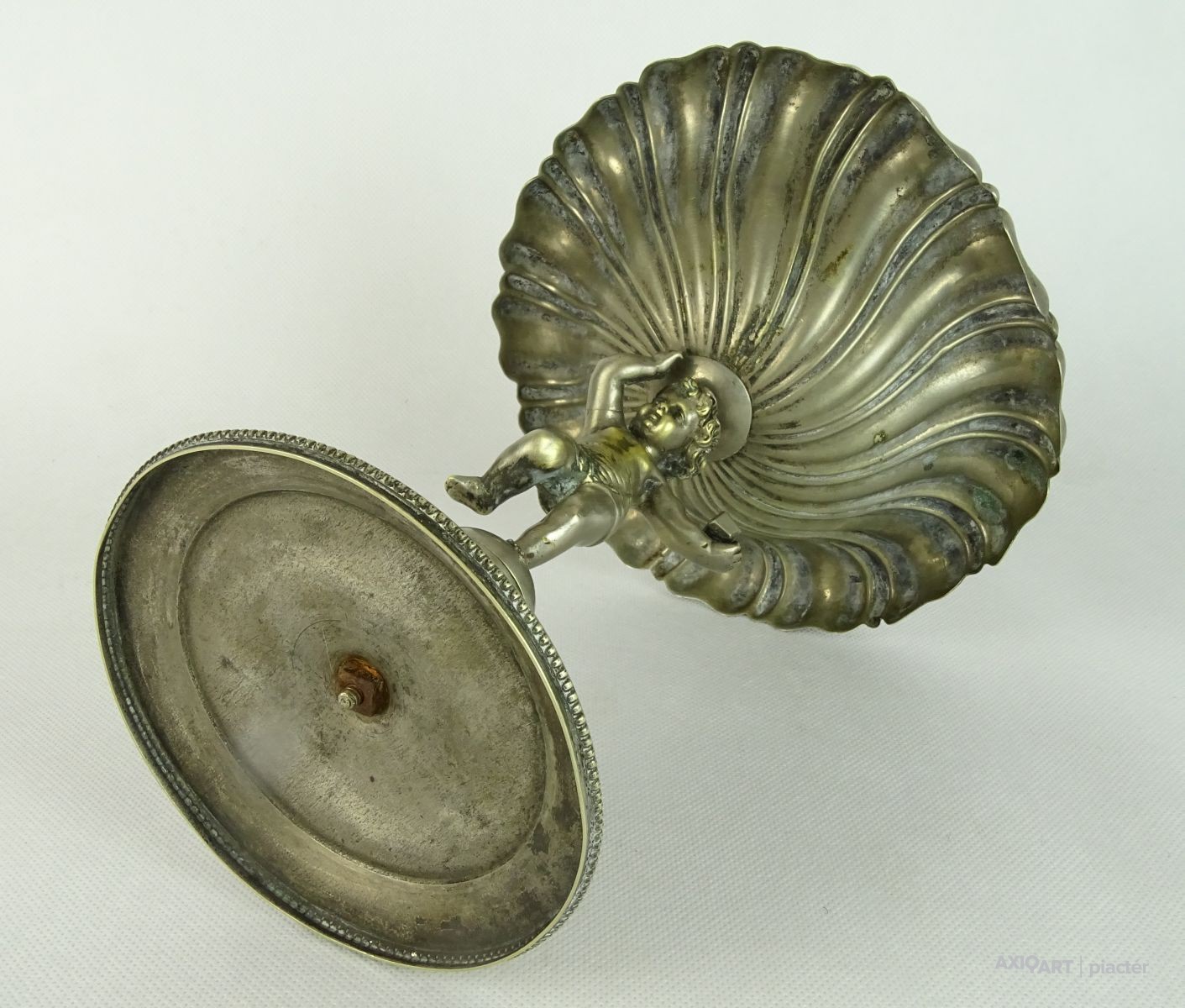 [0L760/X003] Szép állapotú, régi, jelzett, ezüstözött alpakka asztalközép kínáló tál, gyümölcs kínáló. A kelyhet egy lábon, globuson álló angyal, puttó tartja. Talpán koronás, címerállatos jelzés: BMF Magasság: 23 cm Szélesség: 19 cm Súly: 0.83 kg