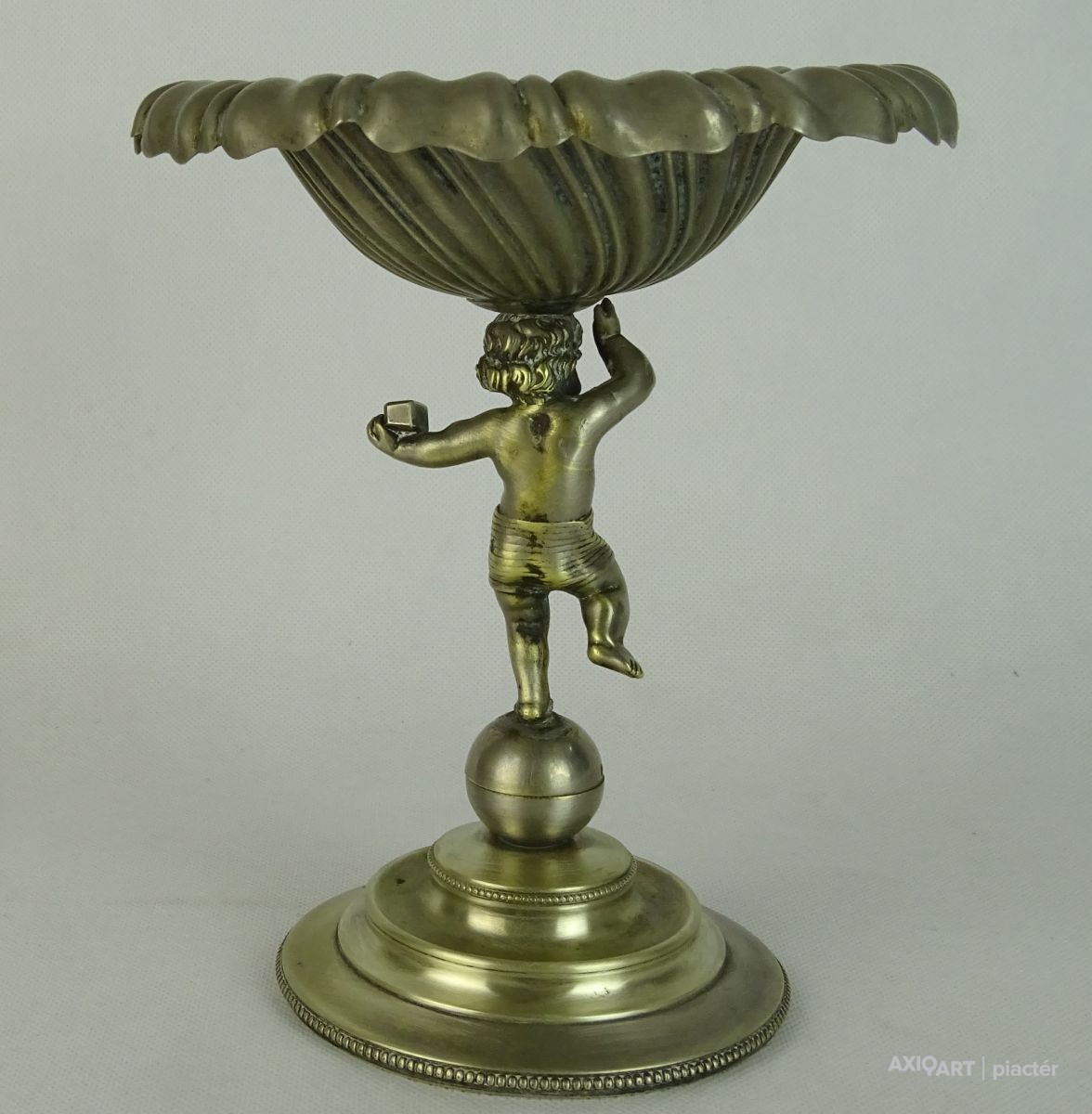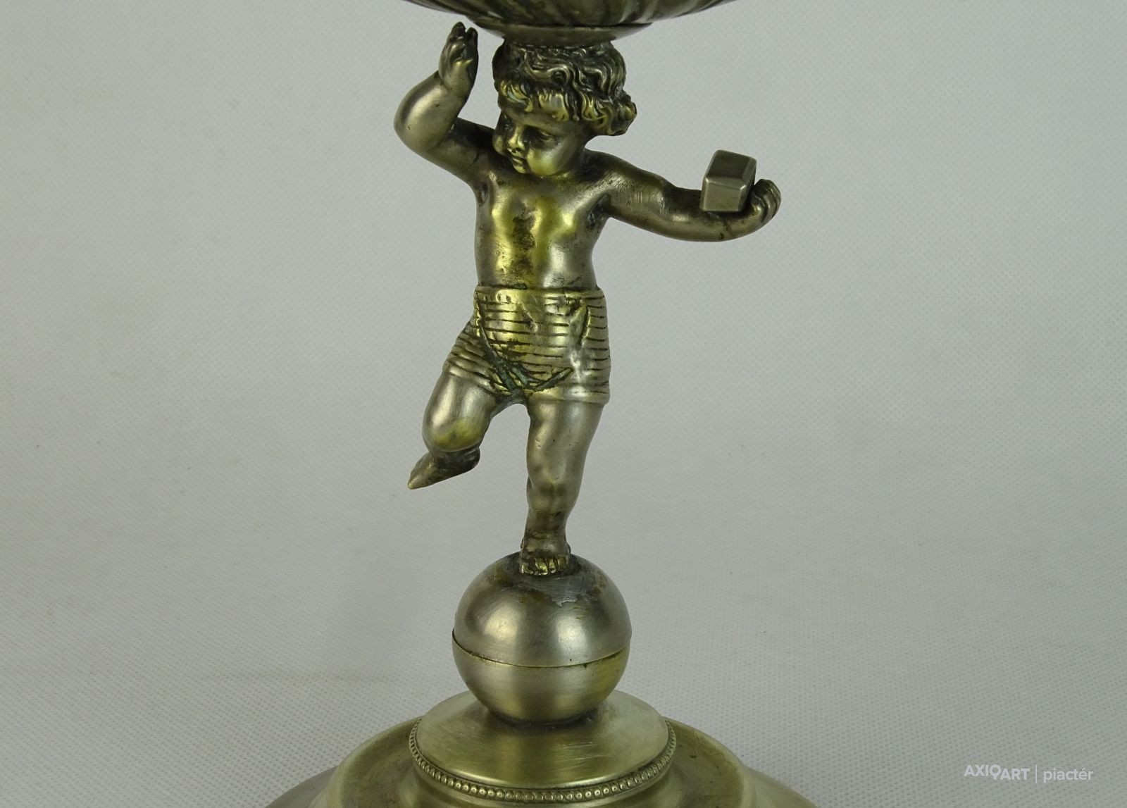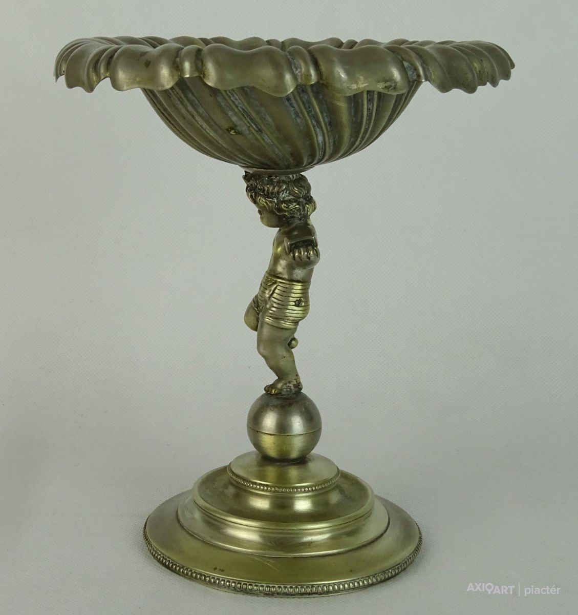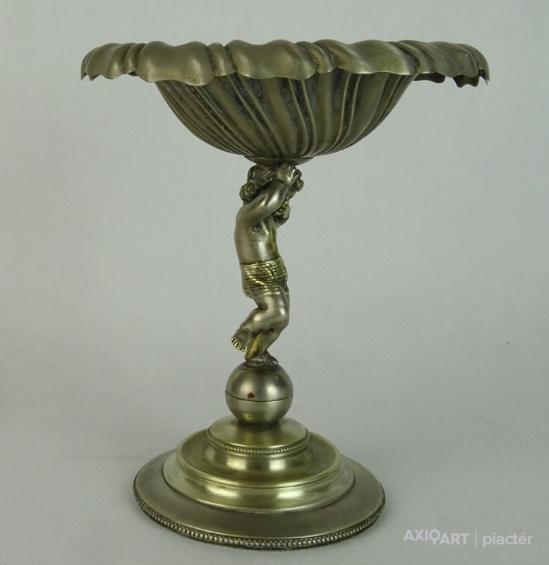 Szép állapotú, régi, jelzett, ezüstözött alpakka asztalközép kínáló tál, gyümölcs kínáló. A kelyhet egy lábon, globuson álló angyal, puttó tartja.