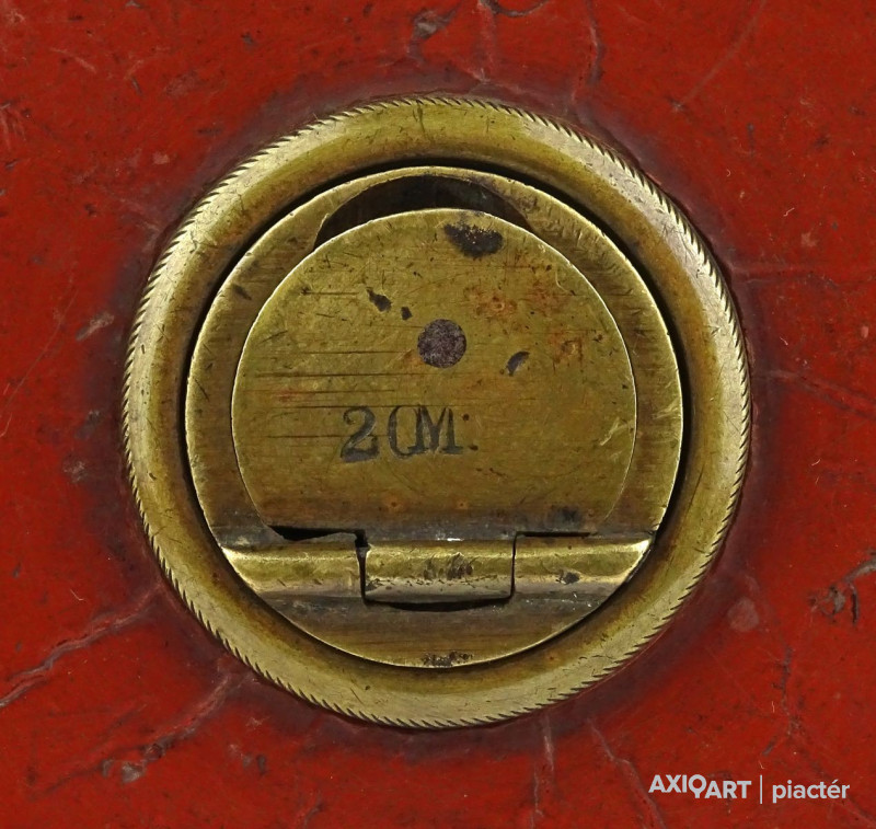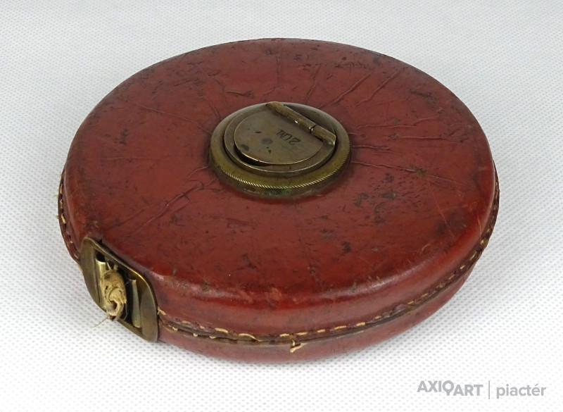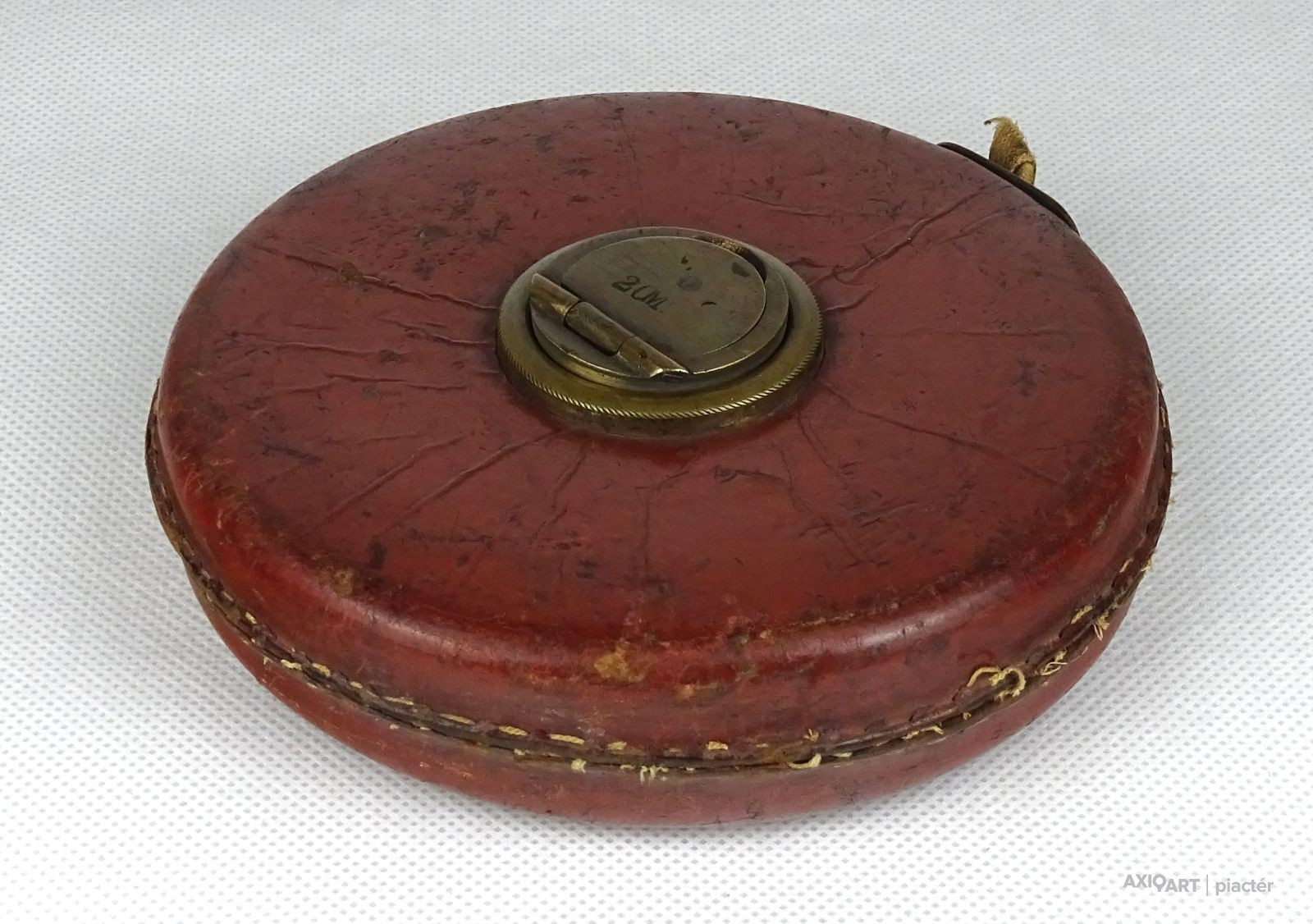 Kemény bőrtokos mérőszalag 20 m-es, fém részei sárgarézből készültek. Az első cca 50 cm hiányzik róla.