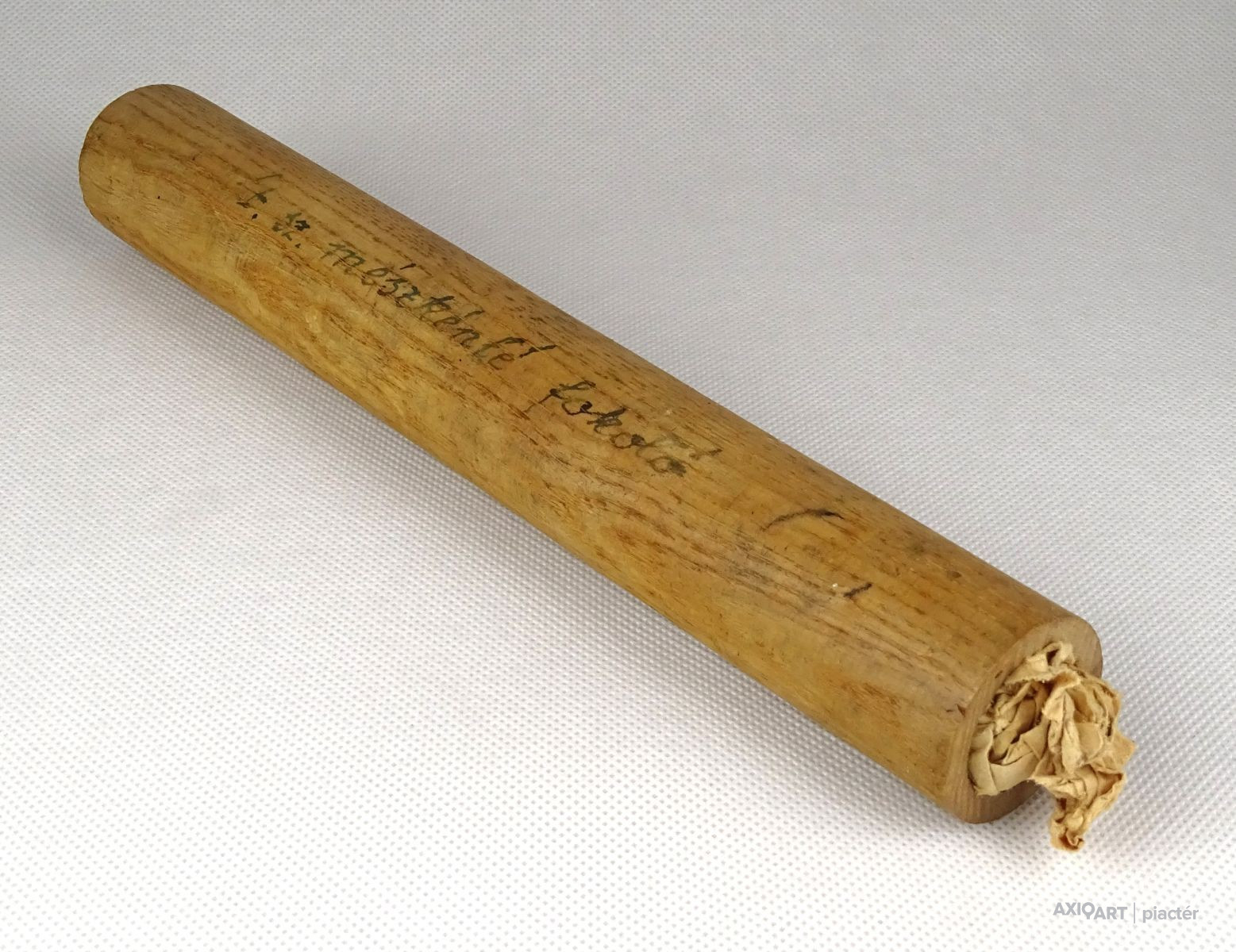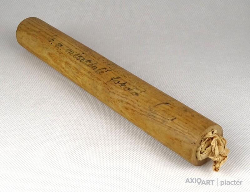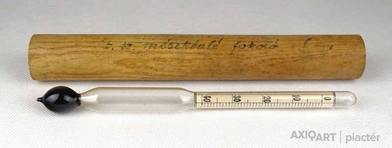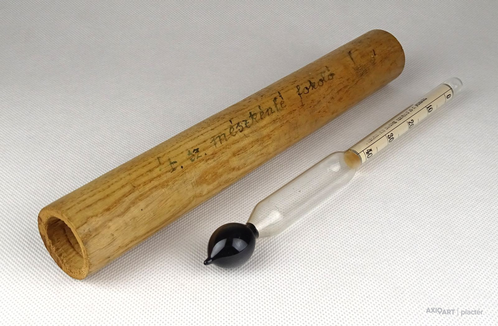 [1C469/Z052] Eredeti, biztonsági fa dobozában, tokjában található, jelzett antik skálázott fújt üveg borászati eszköz, borfokoló. Feliratok: AREOMETER BAUME SZERINT 15 C. FOKNÁL A fa tokon felirat: 4.SZ. MÉSZKÉNLÉ FOKOLÓ Súly: 0.12 kg