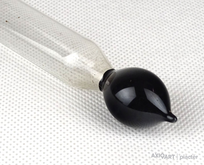 Eredeti, biztonsági fa dobozában, tokjában található, jelzett antik skálázott fújt üveg borászati eszköz, borfokoló.