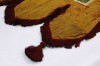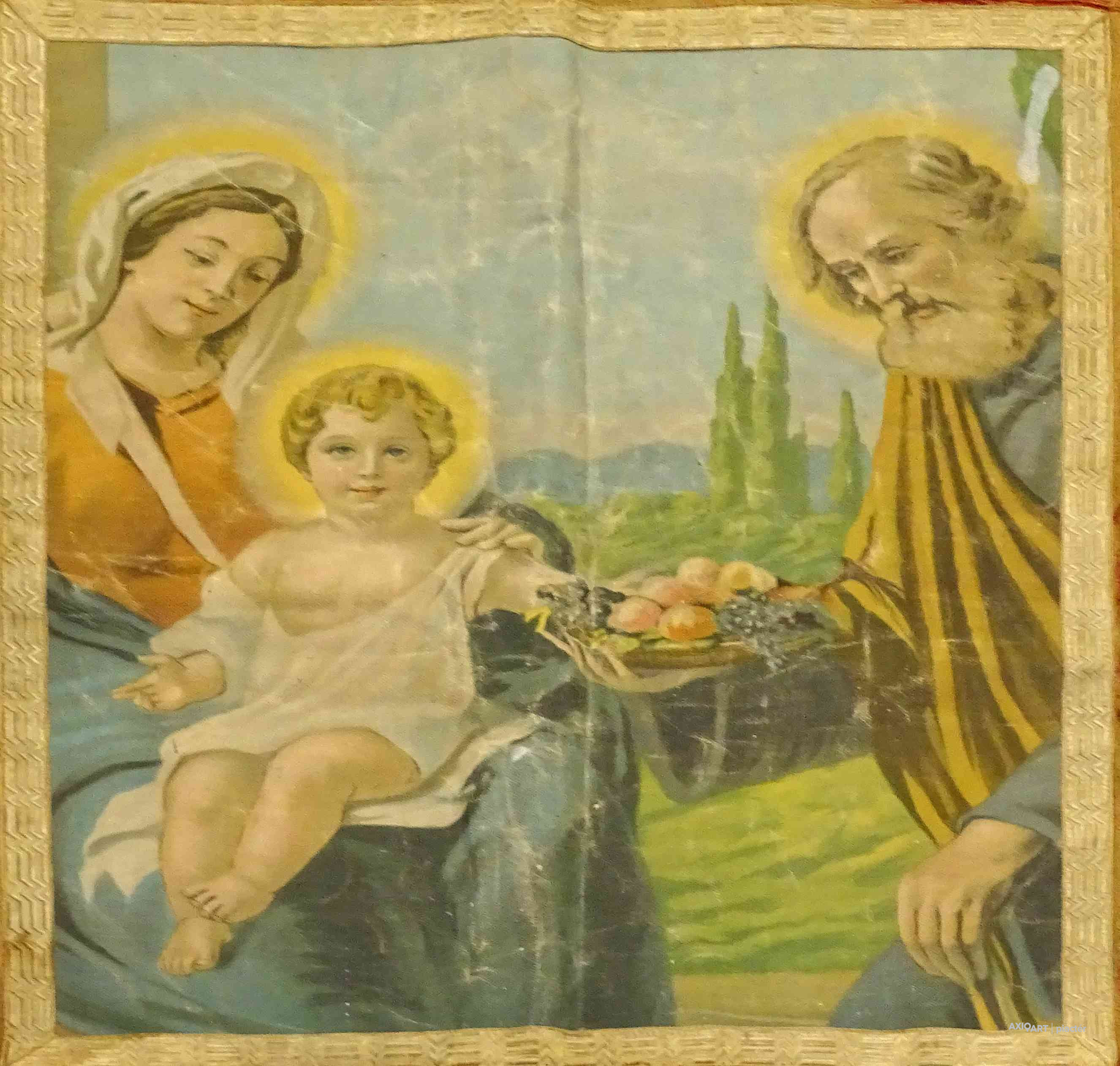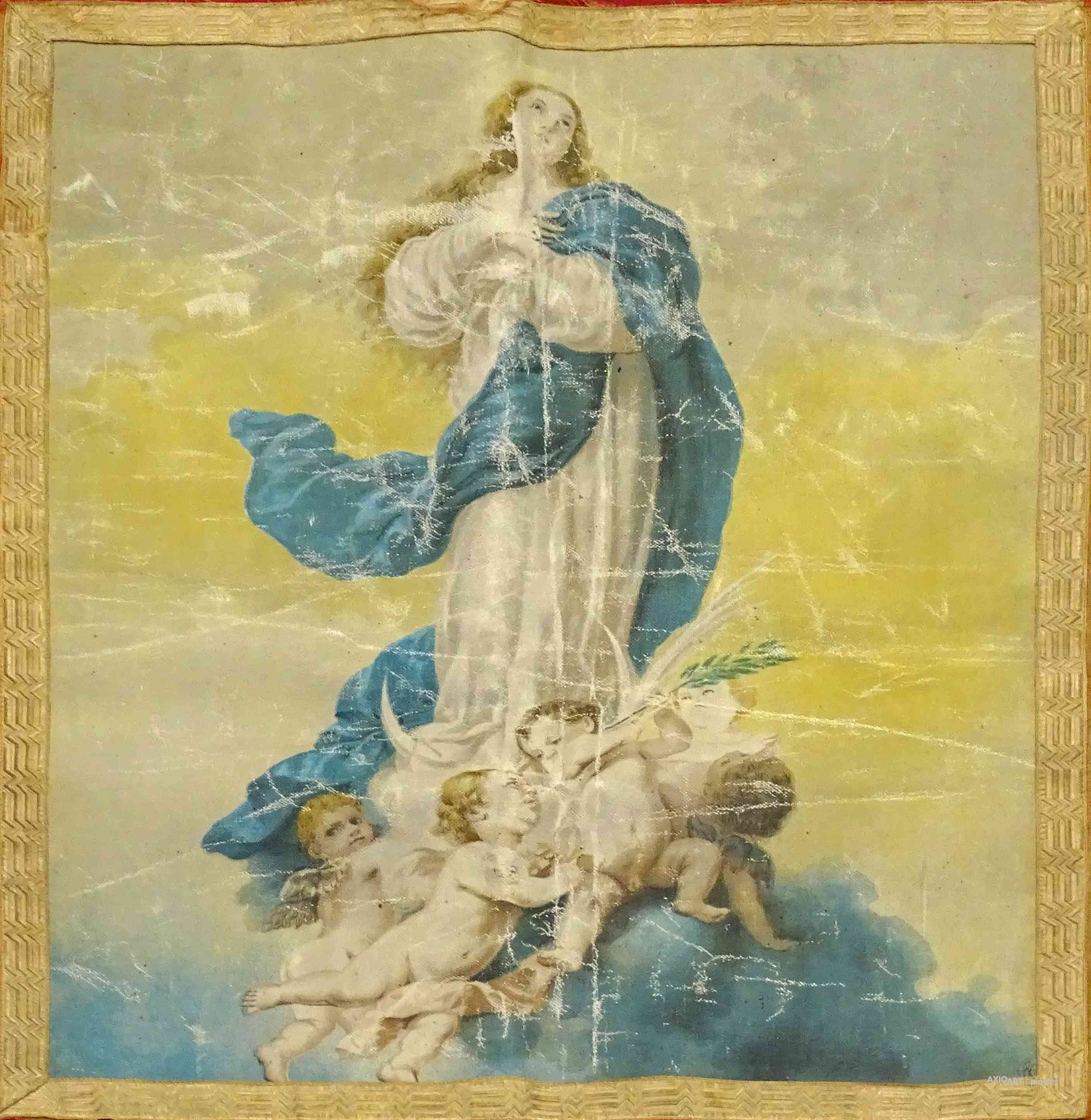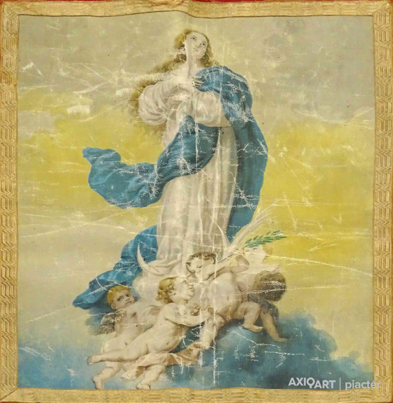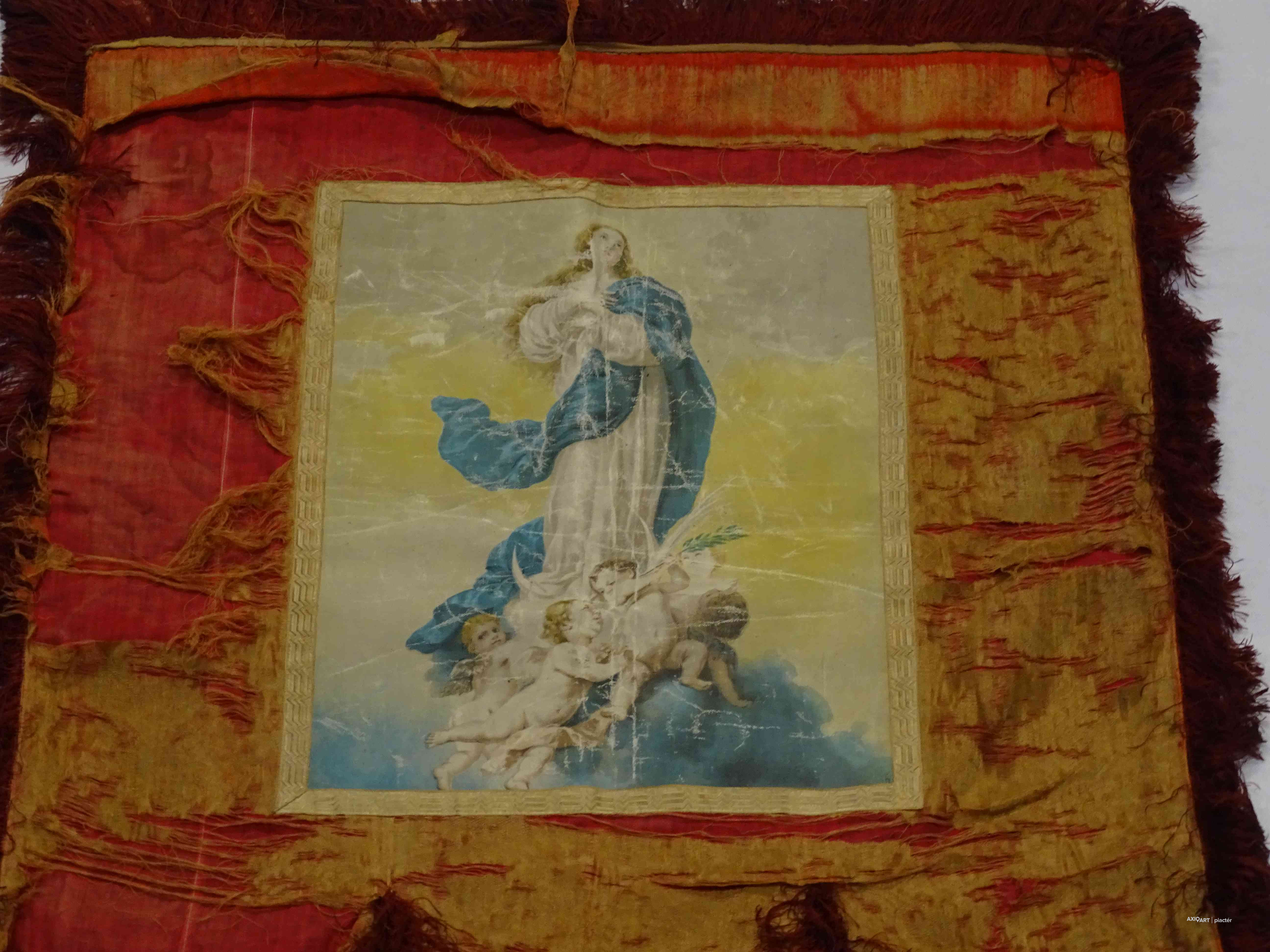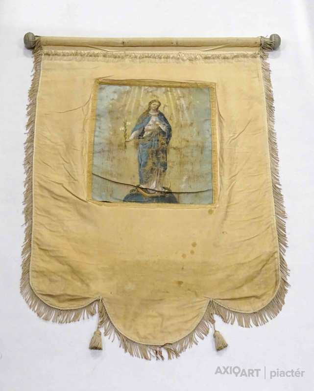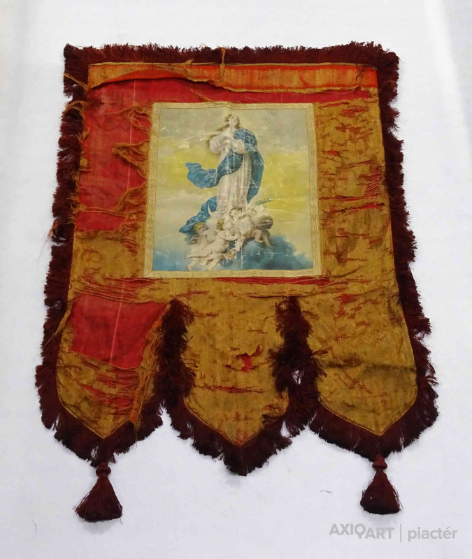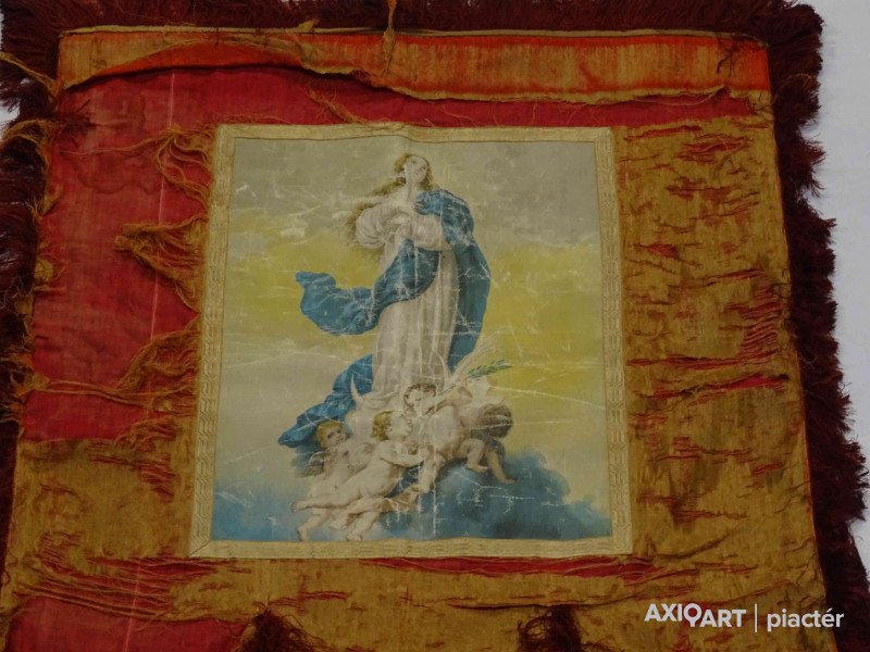 [1Y565/X273/5] Antik, XIX. századi templomi körmeneti zászló. Mindkét oldalán kézzel festett szentképekkel díszített templomi drapéria. A festmények jó állapotúak, míg maga a zászló anyaga erősen kopott, elfeslett állapotban van. A zászló anyaga bordó - aranyszínű brokát, körben bordó rojtokkal. Zászlórúdja nincs. Szélesség: 80 cm Hosszúság: 113 cm Súly: 0.69 kg