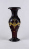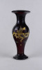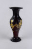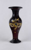 Antik, hibátlan állapotú, bordó színű, kézzel festett, aranyozott, barokk mintával díszített, talpas fújtüveg váza.