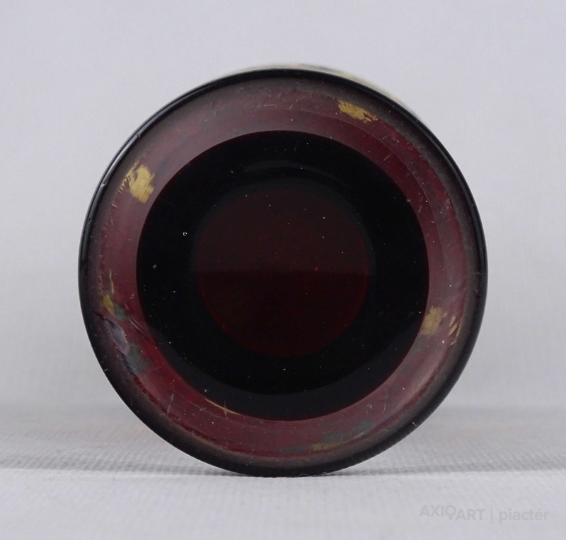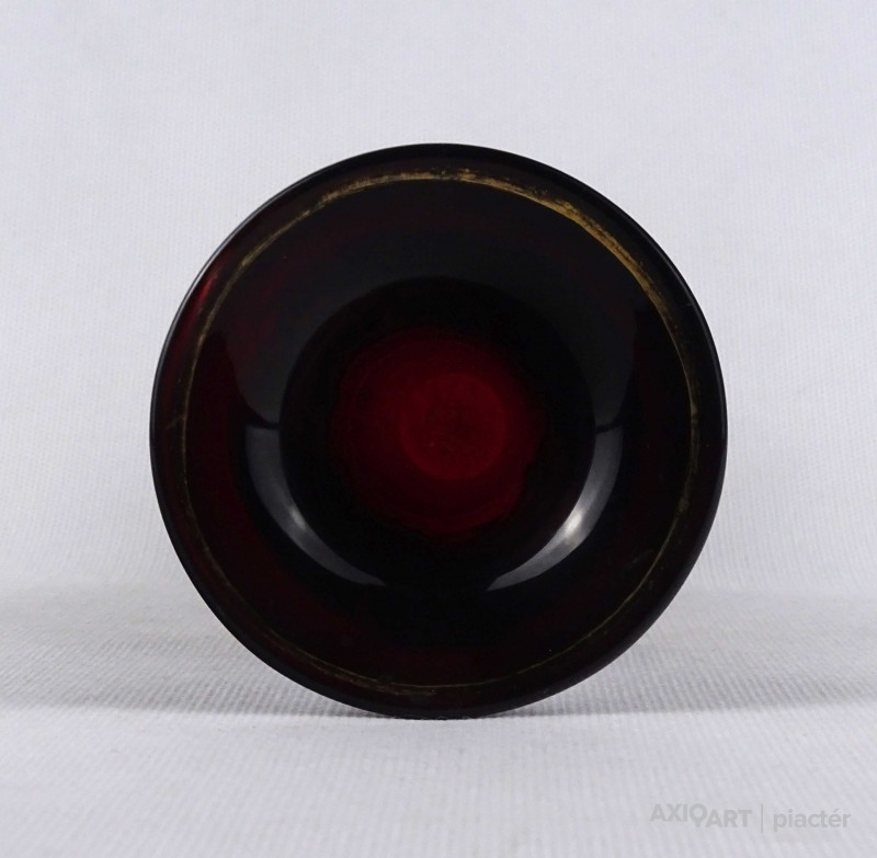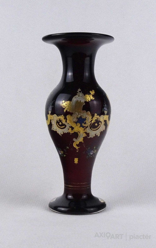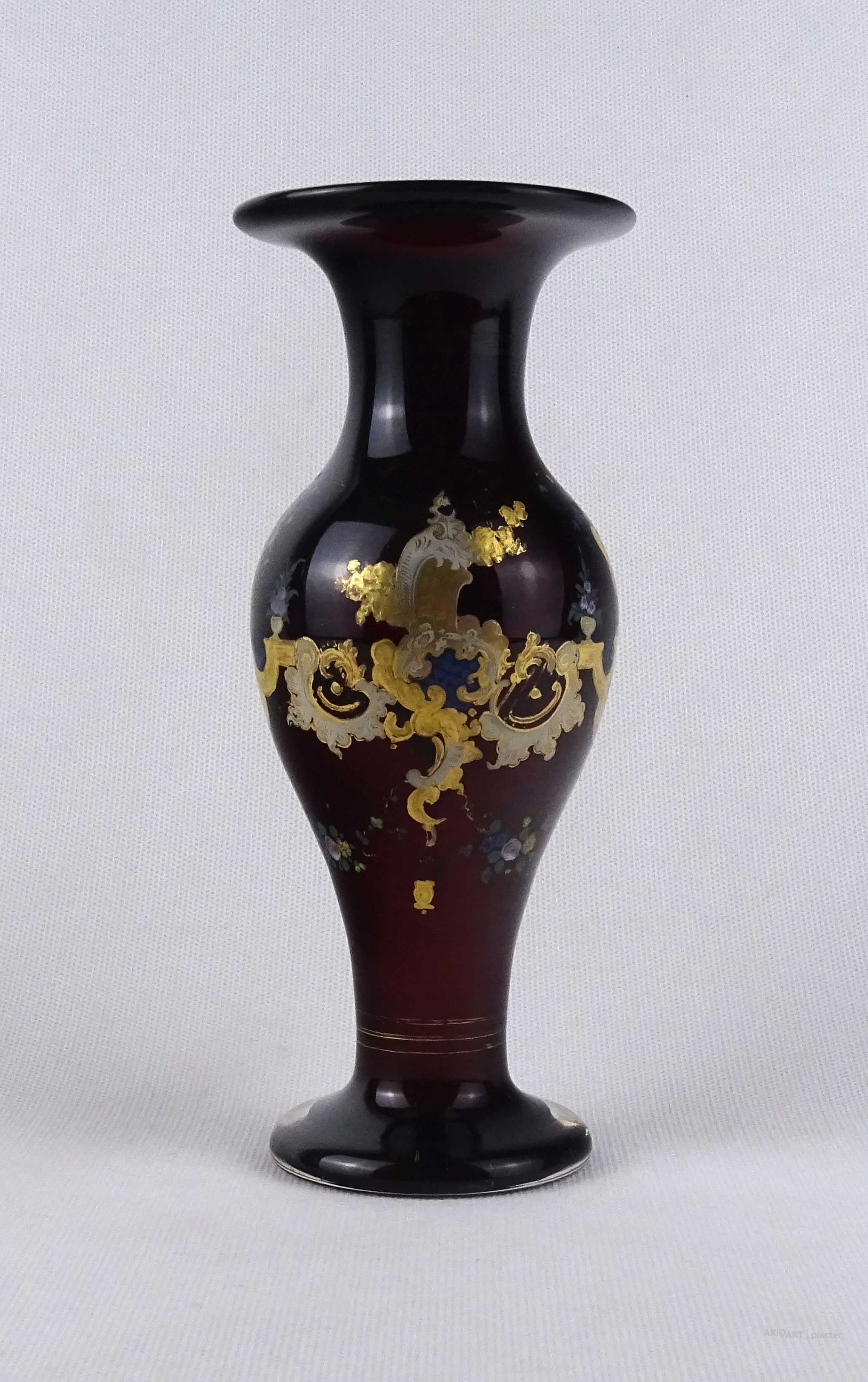 [1U645/Z034] Antik, hibátlan állapotú, bordó színű, kézzel festett, aranyozott, barokk mintával díszített, talpas fújtüveg váza. Magasság: 18.9 cm Szélesség: 8 cm Súly: 0.355 kg