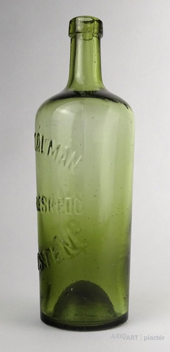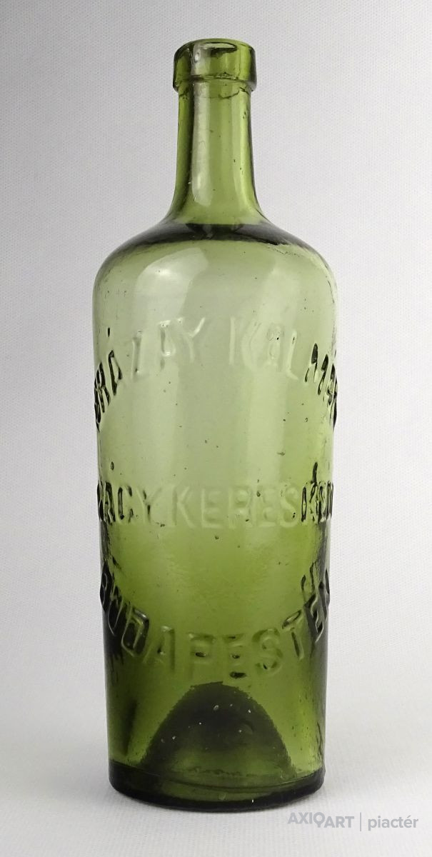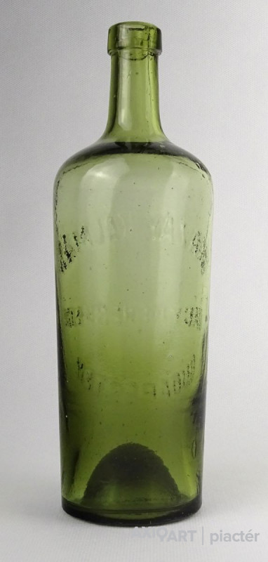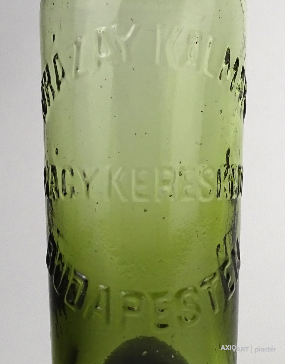 [1P781/Z023] Régi hibátlan állapotú, formába fújt, gyönyörű zöld színű gyógyszertári üveg, patikaüveg. Oldalán domború felirat: BRÁZAY KÁLMÁN NAGYKERESKEDŐ BUDAPESTEN Magasság: 22.5 cm Szélesség: 7 cm Súly: 0.48 kg   Magassága 19 cm, átmérője 7 cm. Súlya 437 g. Brázay Kálmán    Ugrás a navigációhozUgrás a kereséshez Brázay Kálmán 1904-ben (Strelisky Sándor felvétele) Született 1839. október 16. Kiskunhalas Elhunyt 1925. január 7. (85 évesen) Pellérd Állampolgársága magyar Nemzetisége magyar Foglalkozása kereskedő A Wikimédia Commons tartalmaz Brázay Kálmán témájú médiaállományokat. Sablon • Wikidata • Segítség Brázay (Brazovics) Kálmán (pellérdi) (Kiskunhalas, 1839. október 16. – Pellérd, 1925. január 7.) kereskedő. Brázay Kálmán a 19. század végének nagy ambícióval rendelkező kereskedője, aki boltját a 20. század elejére iparvállalattá és nagykereskedéssé fejlesztette. Nevéhez függő legnagyobb érdeme, hogy elterjesztette a sósborszesz használatát. Gyerekkora  Kiskunhalason 1839. október 16-án népes családba született: tizenegy testvére volt. A boldog élet nem hosszú ideig adatott meg a családnak. Az apa, Brazovics Brázay József a szabadságharcban katona volt, és a szabadságharc leverését követően börtönbe került, a vésztörvényszék tízéves várfogsággal sújtotta. Édesanyja, elveszítve gazdálkodó társát, kénytelen volt dobra veretni az ősi birtokot. A birtokért kapott harmincezer forintot a népes család eltartása hamar fölemésztette, így amikor az apa 1852-ben kegyelemmel kiszabadult, a szülők úgy döntöttek, a Temes vármegyei Csákóvárra költöznek, ahol maradék pénzükből, amely – a fáma szerint – alig érte el a négyezer forintot, ismét megpróbáltak földet venni s gazdálkodni. Ugyanakkor az elszegényedett nemesi család nagyobb gyerekei - így könnyítvén a büdzsén - igyekeztek munkába állni.  Tanulóévei  Ekkor került a tizenhárom esztendős Kálmán Temesvárra fűszeres inasnak. A minden újra nyitott ifjú szeretett dolgozni, szorgalmát főnöke is látta, s mikor 1855-ben fölszabadult, kiváló ajánlólevéllel a zsebében indulhatott el. Ezután Szegeden dolgozott, majd Baján, végül Pesten. Ám az itt látottak sem elégítették ki, így még ebben az esztendőben tovább ment Bécsbe. A császárváros üzleteit látva megértette, csak akkor tudja terveit megvalósítani, ha nyelveket tanul, s továbbképzi magát. Kezdetben néhány krajcáros díjazásért egy apró boltban inaskodott, s szerény béréből németórákat vett. Majd, miután tökéletesen megtanult németül, az egyik legelőkelőbb üzletbe állt be. Itt rengeteget látott és tapasztalt: kitanulta a szakma fortélyait. Nehezen összekuporgatott tőkéjéből folytatta vándorútját: megjárta Németországot, Hollandiát és Belgiumot, -mi több- 1858-ban Angliába is eljutott. Tanulóévei alatt szerteágazó kapcsolatokat épített ki a kor legnagyobb gyarmatáru-kereskedőivel, melynek később nagy hasznát látta. Európai tanulóéveinek befejezése után, tapasztalatokkal felvértezve 1862-ben tért vissza Pestre. Numvári Werther Frigyes Pest, országút 25. szám alatti fűszerüzletében ismét beállt a pult mögé. Az üzletmenet fellendítését látva 1865-ben Werther örökösei az üzlet vezetésével őt bízták meg. Werther és Brázay üzlet 1870. Mikor a kiegyezés után (1867-ben) kötelezővé tették a bírósági cégbejegyzést, az elsők között szerepelt az Országúti üzlet, és Brázay Kálmán neve hamarosan országosan ismertté vált. 1868. januártól már az üzlet társtulajdonosa. (Werther és Brázay ország ut 25. szám (ma: Múzeum körút) 1868-1869.) (Werther és Brázay országut 26. szám 1870.)  A kereskedő  A kereskedői pályán önálló 1871-ben lett, az Országút 39. alatt volt a fűszeráru-nagykereskedése, ezzel a legkiválóbb kereskedések egyikét alapította meg, ahol fűszert, gyarmatárukat (kávét. teát, rumot, likőröket), szörpöket és gyerektápszereket kínált. Óriási bevételéből megvette az Országút 23. sz. alatti szerény, földszintes épületet, s helyén új, minden tekintetben pazar központot építtetett. A beruházásra a tulajdonos mintegy negyvenezer forintot szánt, ám időközben kiderült, az ugyancsak ekkortájt alapított korszerű feldolgozótelep miatt mintegy háromszorosára emelkednek a költségek. A kockázat óriási volt, ám a befektetés mégis mesésen megtérült. A múlt század elején Brázayéknál egyébként már nem csak gyarmatárut és sósborszeszt, hanem szappant, kozmetikumokat is lehetett kapni. A termékek döntő hányadát saját maguk állították elő, de komoly mennyiségben importáltak is.  A sósborszesz  Német nyelvű Brázay sósborszesz reklám Specialitása a nagy hirre emelkedett sósborszesz gyártása lett. Franciaországi tanulmányai alatt ismerkedett meg ezzel a termékkel Brázay Kálmán. Sós vizet kevertek pálinkához, majd illatosították. Elsősorban a fáradtság ellen volt hatásos, de fertőtlenítőként is alkalmazták. Numvári Werther Frigyes cége, 1868 A sósborszesz már évtizedekkel korábban elengedhetetlen kelléke volt a magyar háztartásoknak, Thék Mór a Városház uccában már 1858-ban, Werther Frigyes vegyész-technikus –ki a berlini Dr. Hermbstadt vegyészet-tanár tanítványa volt- 1863-tól gyártott sós-borszesz elnevezésű terméket, azonban ezek összetételét nem ismerjük. Werther szerint a feltalálója William Lae, kinek az erről írt «Selbst-Arzt» c. könyvét fordította le (Pest, 1866). Brázay -Werther receptjét továbbfejlesztve- gyártott sósborszeszt: a finomszeszbe olajokat, aromákat kevert, s ezt hígította sós vízzel. Csodaszere - mely bedör