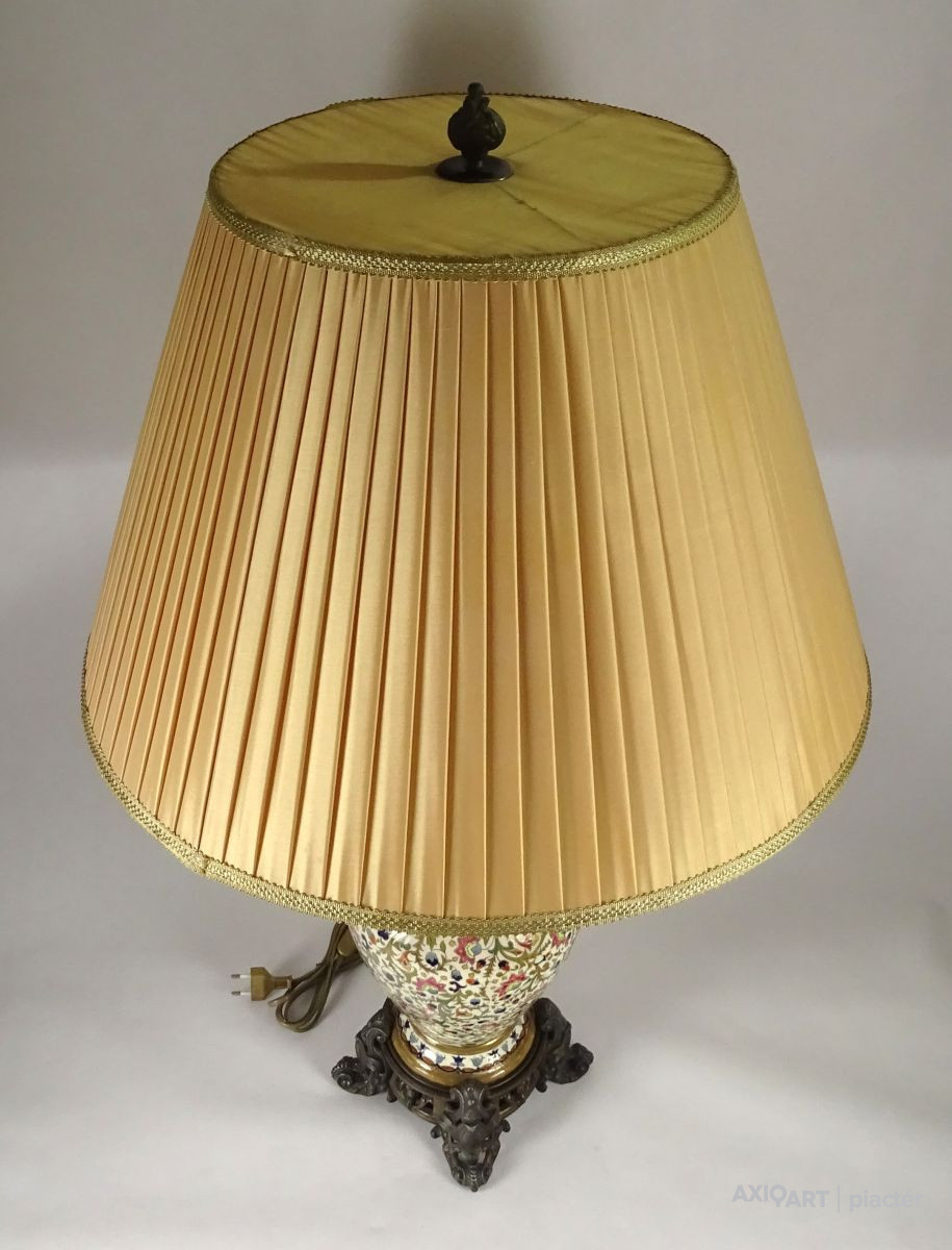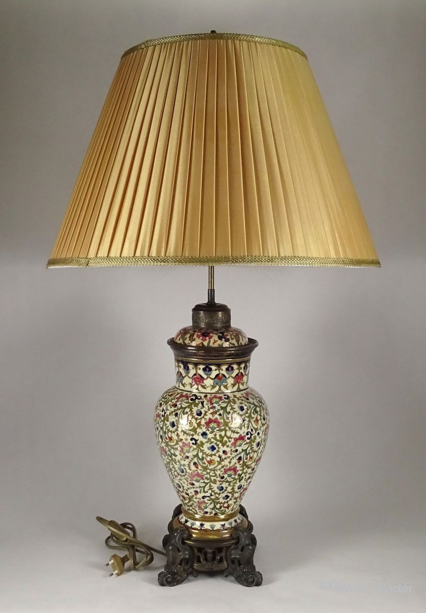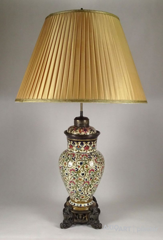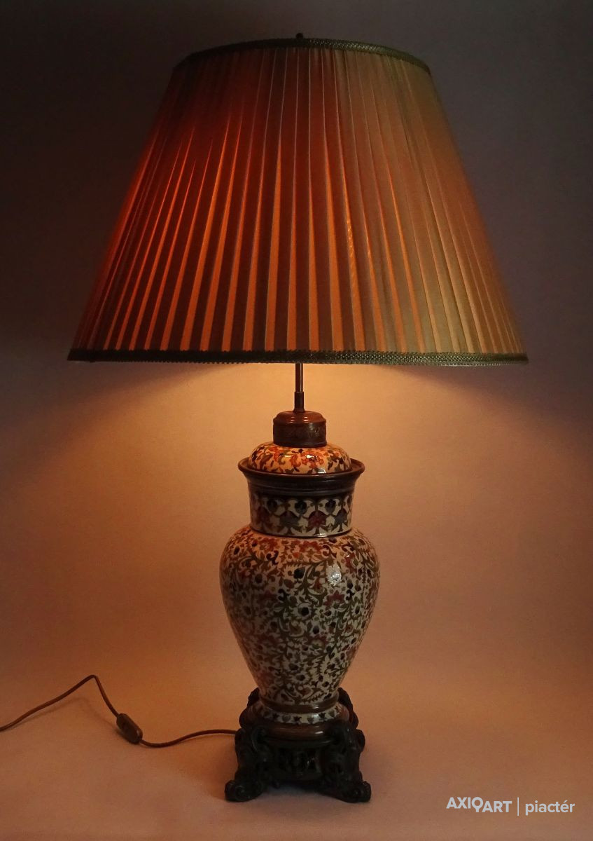 [1R899/UZ-N] Hibátlan állapotú nagy méretű gyönyörű kézzel festett majolika lámpa. Szépen kimunkált áttört bronz talpon áll. Rajta normál állapotú bura. Működőképes állapotban van. Kettő darab nagy méretű (E27) izzó való bele. Bronz talp alatt a majolikán kék jelzés: FISCHER J. BUDAPEST PATENT Mélynyomással: FISCHER J. BUDAPEST Formaszám: 589 Magasság: 90 cm Szélesség: 55.5 cm Súly: 6.2 kg