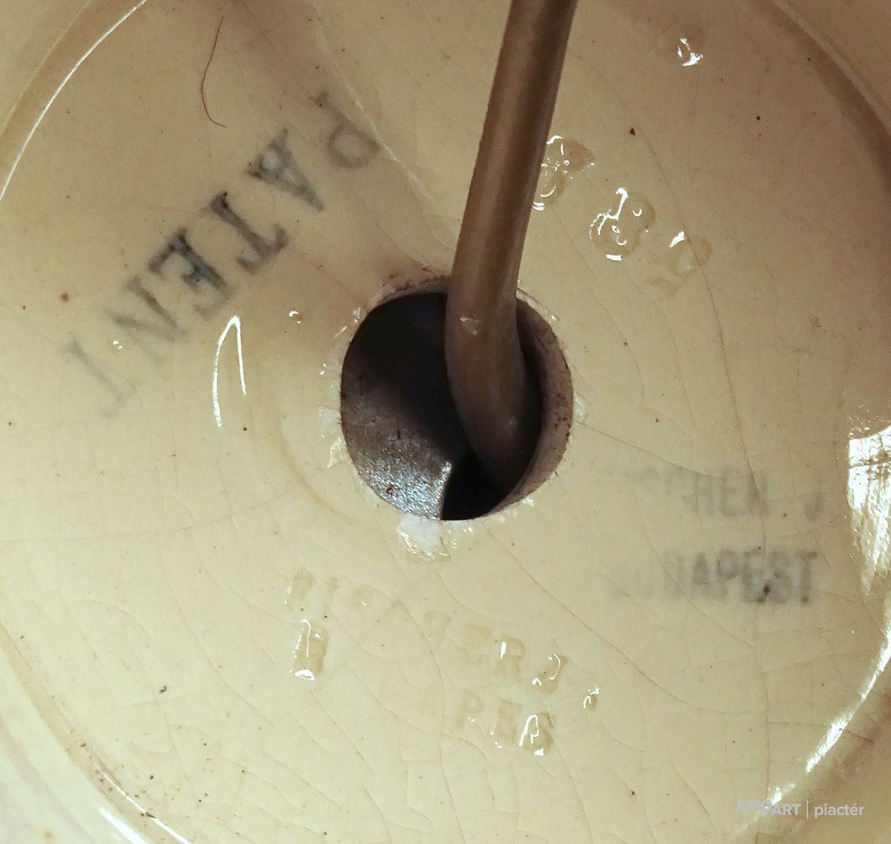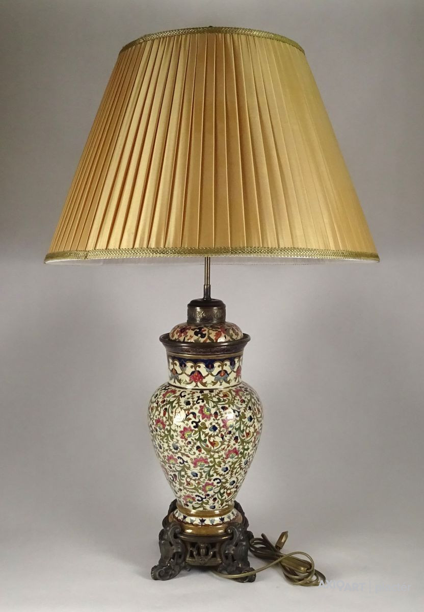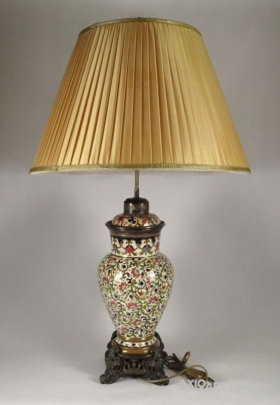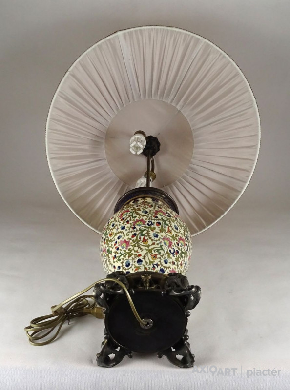 [1R899/UZ-N] Hibátlan állapotú nagy méretű gyönyörű kézzel festett majolika lámpa. Szépen kimunkált áttört bronz talpon áll. Rajta normál állapotú bura. Működőképes állapotban van. Kettő darab nagy méretű (E27) izzó való bele. Bronz talp alatt a majolikán kék jelzés: FISCHER J. BUDAPEST PATENT Mélynyomással: FISCHER J. BUDAPEST Formaszám: 589 Magasság: 90 cm Szélesség: 55.5 cm Súly: 6.2 kg