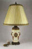 [1R900/UZ-N] Hibátlan állapotú gyönyörű áttört díszes majolika lámpa. Szép bronz talpon áll. Rajta normál állapotú bura. Működőképes állapotban van. Kettő darab nagy méretű (E27) izzó való bele. Bronz talp alatt a majolikán mélynyomott jelzés: ZSOLNAY PÉCS Formaszám: 1694 Magasság: 73.5 cm Szélesség: 45 cm Súly: 6.2 kg