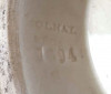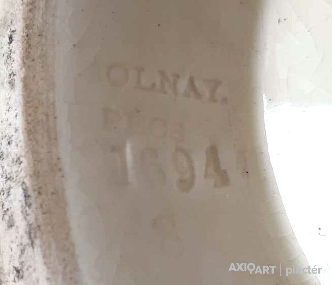 Bronz talp alatt a majolikán mélynyomott jelzés: