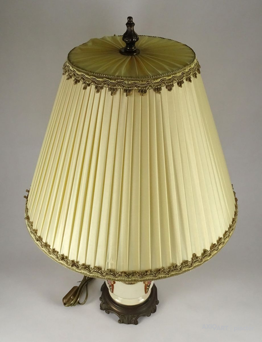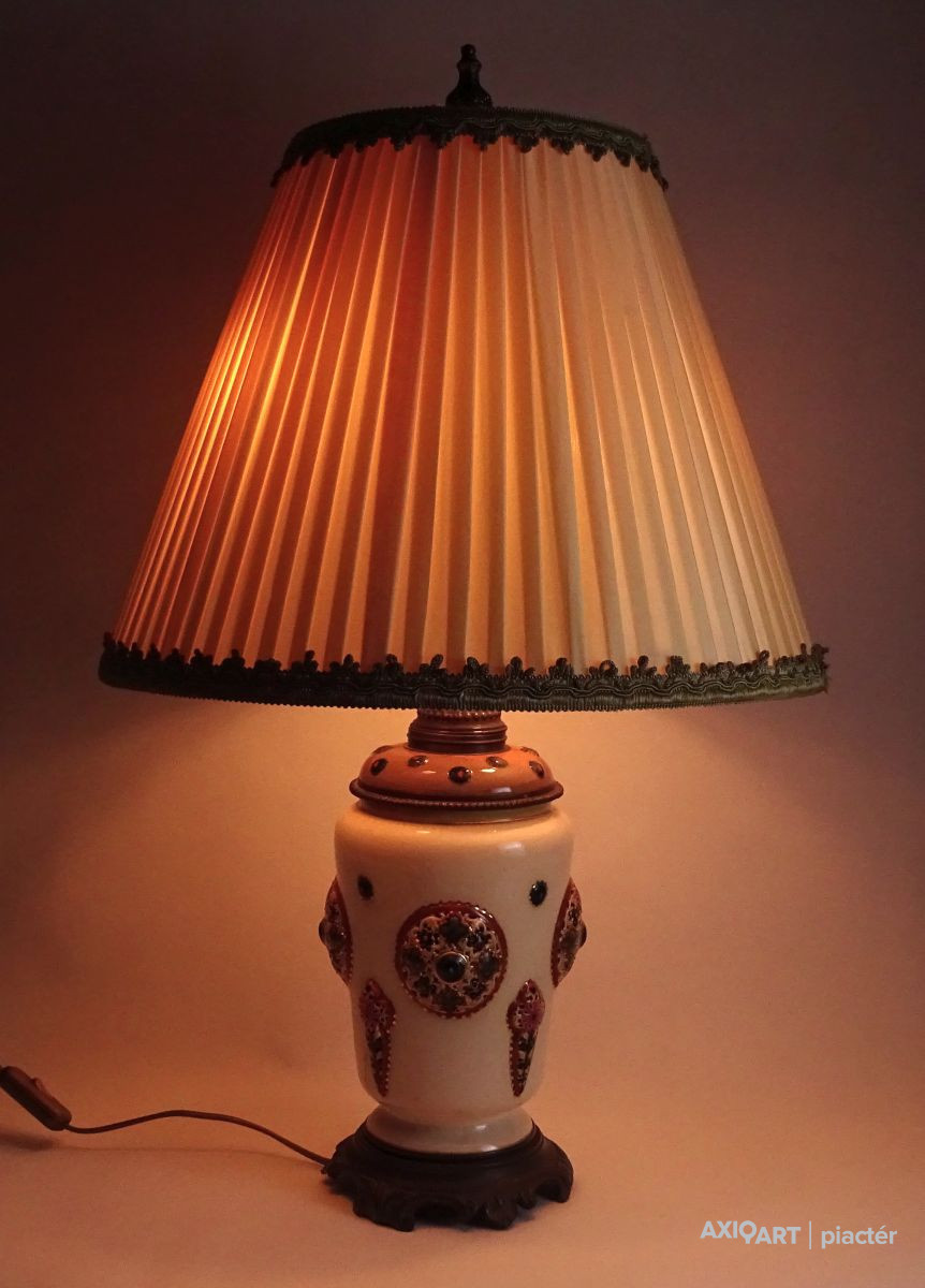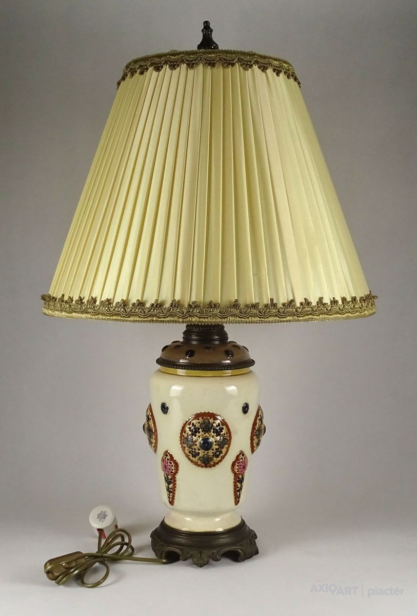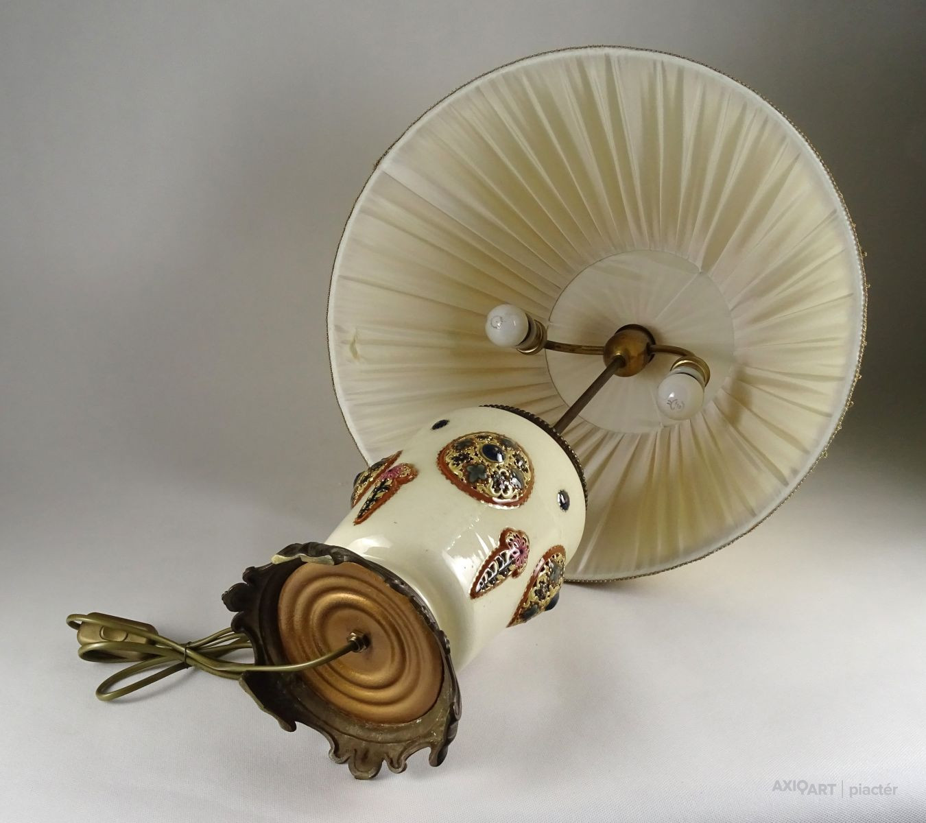 Hibátlan állapotú gyönyörű áttört díszes majolika lámpa. Szép bronz talpon áll. Rajta normál állapotú bura. Működőképes állapotban van. Kettő darab nagy méretű (E27) izzó való bele.