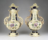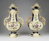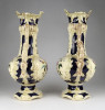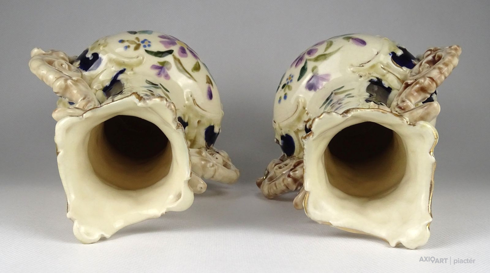 Antik, hibátlan állapotú, aranyozott majolika váza pár. Gyönyörű kobaltkék színnel, kézi festésű virágokkal díszített. Mindkét váza felső pereme profi restaurátor által javított.