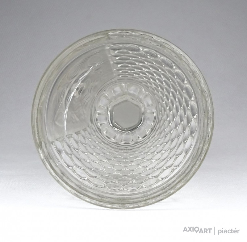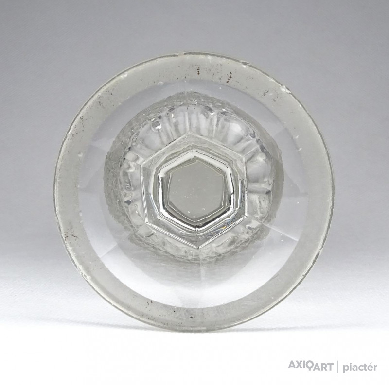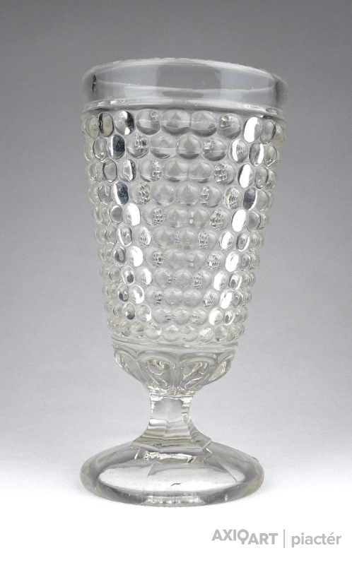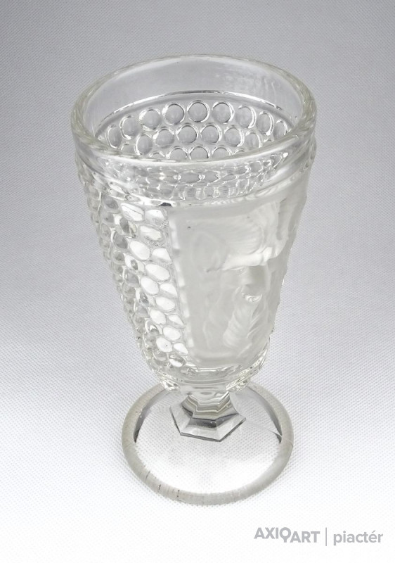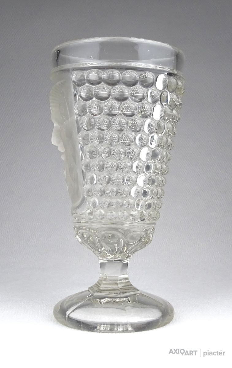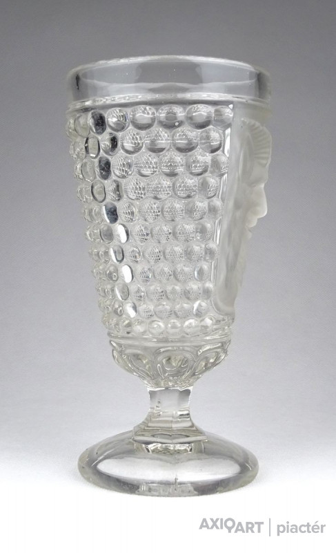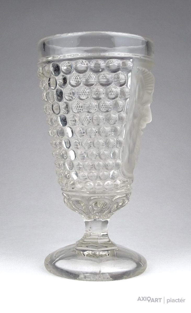 Antik, hibátlan állapotú, vastag falú, bütykös talpas üveg pohár. Oldalát opálos felületű plasztikus nagyméretű faunfej díszíti.