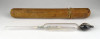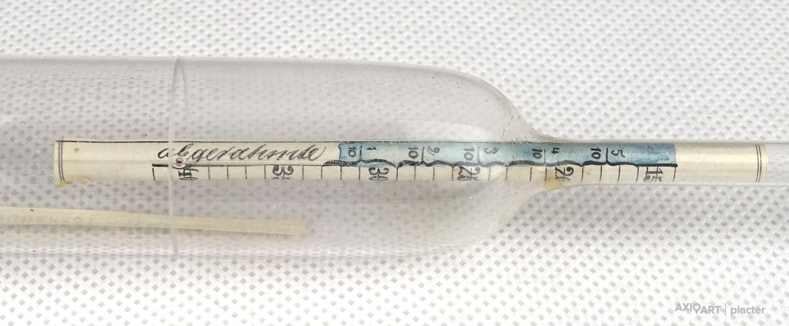 [1C468/Z052] Eredeti, biztonsági fa dobozában, tokjában található, jelzett antik skálázott fújt üveg tejipari eszköz. Feliratok: CALDERONI ÉS TÁRSA BUDAPEST TEMP +14° REAUM Súly: 0.115 kg
