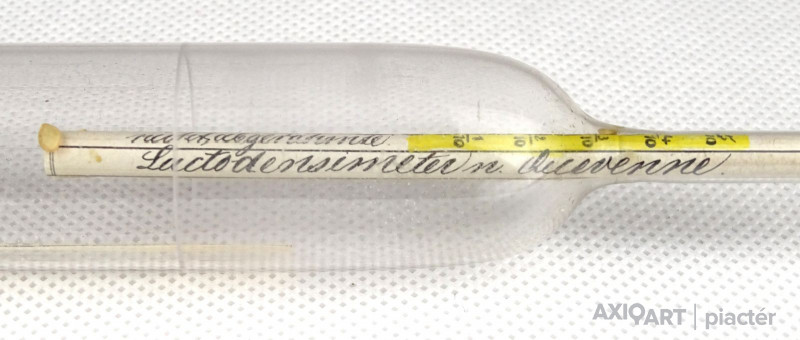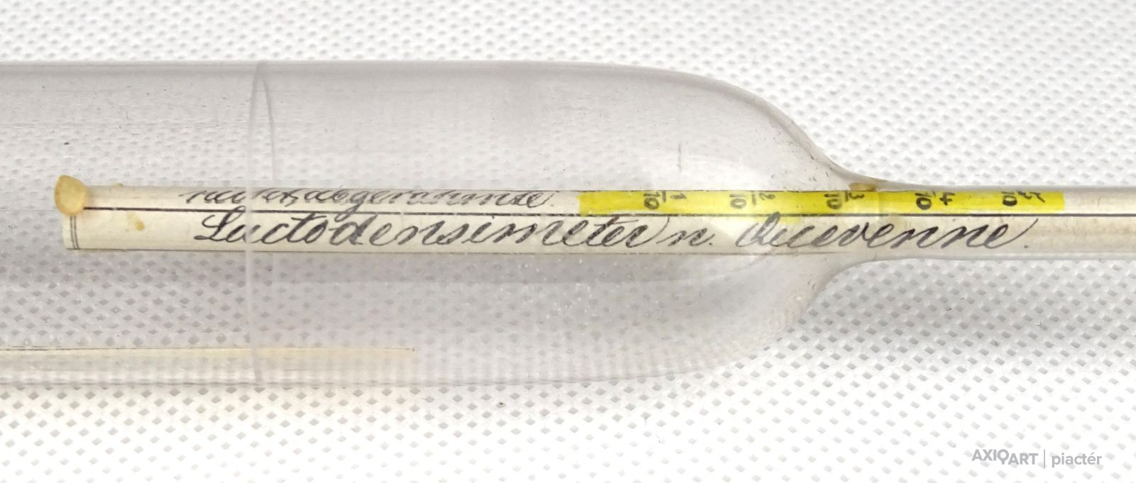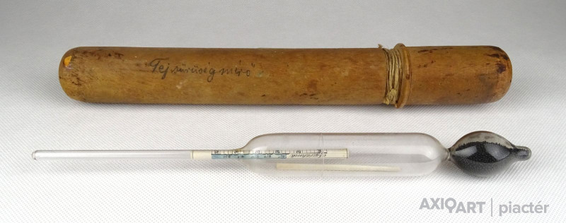 Antik Calderoni fújt üveg tej sűrűségmérő fa tokjában LACTODENSIMETER