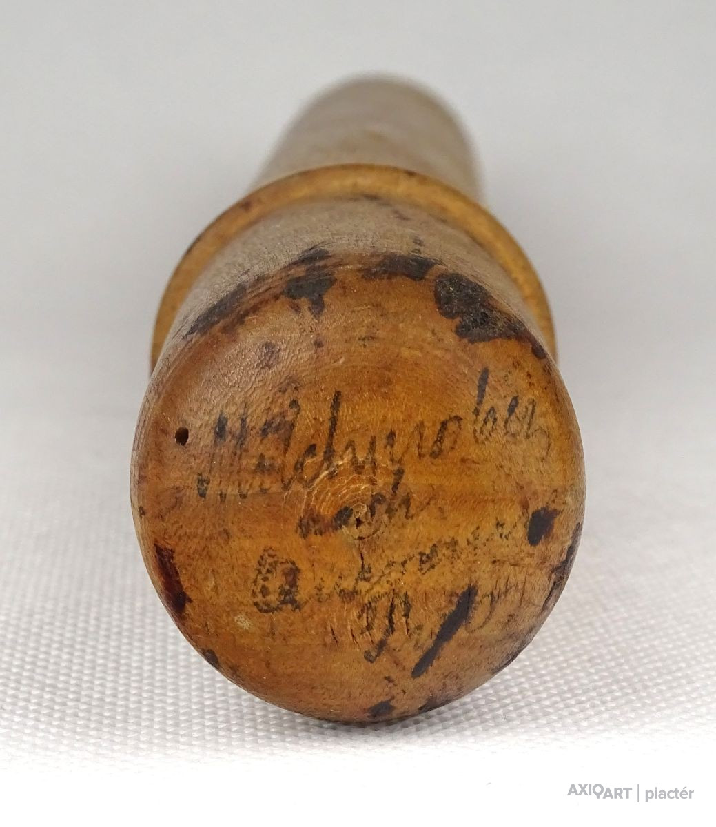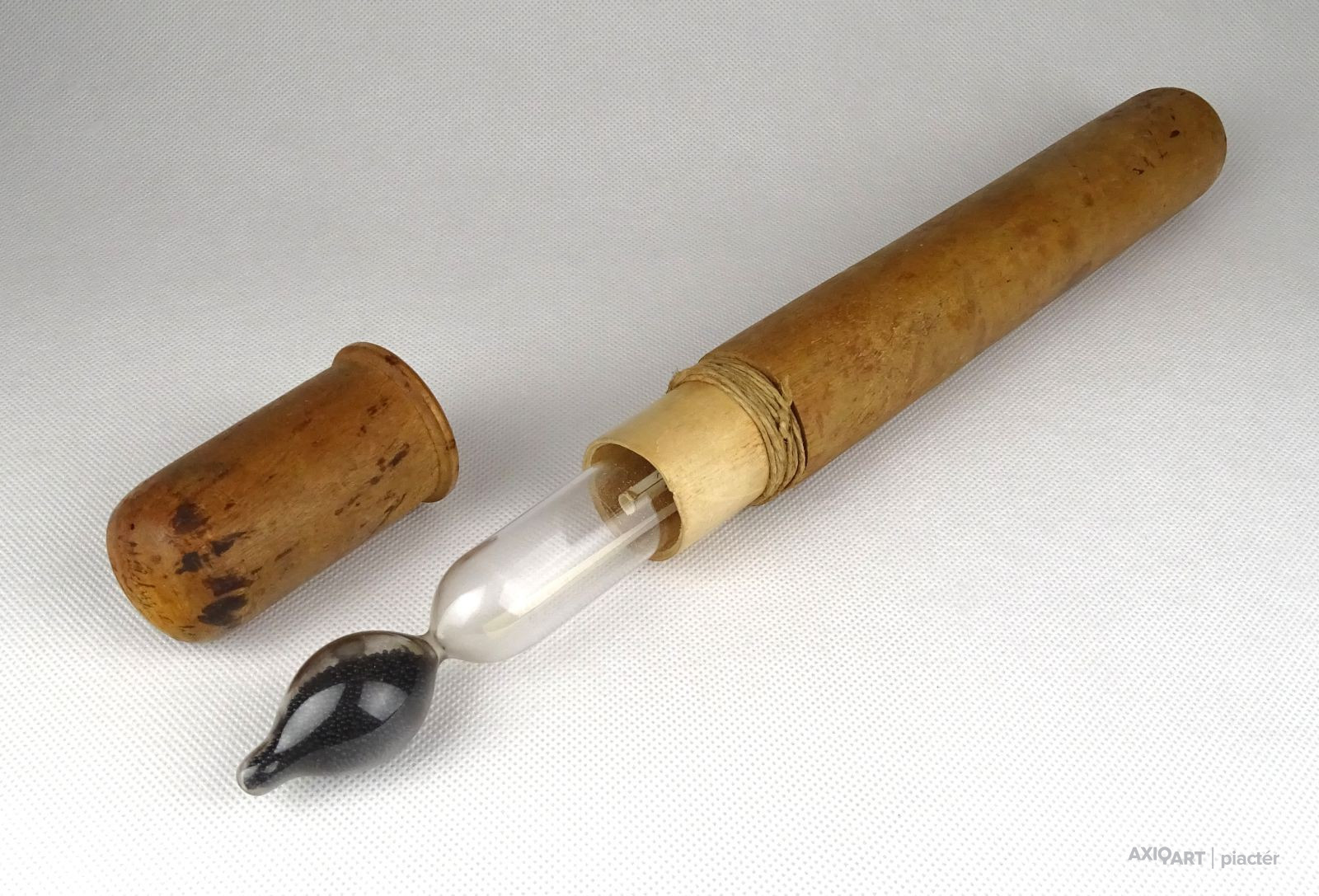 Eredeti, biztonsági fa dobozában, tokjában található, jelzett antik skálázott fújt üveg tejipari eszköz.