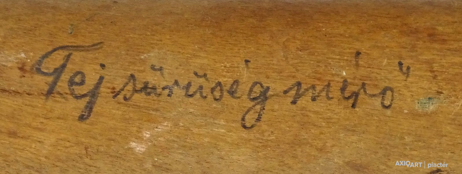[1Y029/Z018] Olaj farost festmény, üveglap mögött, hibátlan képcsarnokos keretben. Hátoldalán Képcsarnok Vállalat papír címkéje: A művész neve: SCHÉNER MIHÁLY A kép címe: TÁJ Magasság: 66.5 cm Szélesség: 86 cm Súly: 6.54 kg Schéner Mihály festő, grafikus, szobrász, keramikus, bábtervező Medgyesegyháza, 1923-01-9 Elhalálozott: Budapest, 2009. május 11. Honlap: http://www.kormendigaleria.hu/kiadvany.html 1942-1947: Magyar Képzőművészeti Főiskola, tanára: Rudnay Gyula. 1978: Munkácsy-díj; 1984: érdemes művész; 1989: kiváló művész; 1995: Kossuth-díj. 1992-től a Magyar Művészeti Akadémia, 1993-tól a Széchenyi Irodalmi és Művészeti Akadémia tagja. 1956-ig tanított. 1982: Nagyatádi Faszobrász Alkotótelep, 1985: Nemzetközi Acélszobrász Alkotótelep, Dunaújváros. A stílusában felismerhető, mégis sokféle műtárgyat létrehozó ~ gazdag, állandóan alakuló életműve a folyton változó világban helyét kereső, az alkotói szabadságot megvalósító XX. századi képzőművész példázata lehetne. Magát expresszív-szürrealista alkotónak nevezi. Egyaránt dolgozik festékkel, textillel, fával, fémmel. Rajzol, szerkeszt, farag, épít, gyúr, varr és ragaszt, felhasználja a mézesbábok öntőformáit. Festő, rajzoló, textilszobor- és bábkészítő, fazekas, asztalos, esztergályos. Háromlépcsős folyamatban gondolkozik: rajzban tervez, majd fest, szobrot készít, “formába önt”, mindig a végső plasztikai megoldást keresi. Ami állandó és mégis játékosan változékony megjelenésű Schéner művészetében, az a gyermekkori emlékek által meghatározott népi mesterségek iránti tiszteletet kifejező motívumkincs, a tárgyi folklór formakészlete, amely már-már kézjegyként ismétlődik munkáin. Mitologikussá nőtt képzelete új lényeket teremt, pl: a Pigulát, amely disznótestű, emberfejű teremtmény. Schéner festményein a szürrealista motívumokat konstruktív szerkezetbe rendezi, a geometriát és az organikus természeti motívumokat egyaránt beépíti műveibe. A népi, népművészeti formakincsből merített lovas huszárok, betyárok, szegénylegények cifra szűr mentéje, piros csákója, fekete csizmája, az önálló életet élő zsinórdíszek és mézeskalács bábok, a kiskocsik a gyermekkori vásárok, búcsúk színes forgatagába vezet. A primér motívumokat aztán felváltják a vastagon felhordott felületbe karcolt jelek, vonalhálózatok, amelyek a játszó gyermek homokba rajzolt ábráit, a pásztorember fába vésett üzeneteit, az ősember barlang falába rótt mágikus jeleneteit idézik meg. A művész pillanatnyi érdeklődésének megfelelően a színek búvópatakként tűnnek el és jelennek meg ismét. A 60-as években leginkább a formákkal való játék érdekelte, a festmények felülete egyre gazdagodott: a táblaképek felületén applikációk jelentek meg, vagy lemállasztott rétegek hagyták maguk után hiányukat, motívumok nélküli ősformák, archetipikus képzetek bukkantak fel művészetében. A véletlenszerűnek látszó rétegekkel való játék azonban tudatos komponálás eredménye, amely később nyilvánvaló ritmusnak és formai szerkesztettségnek adja át a helyét, mint a Törvénytáblák c. sorozaton. A különböző művészi kifejezési formák egymásra termékenyítő hatással vannak, át- meg áthatják egymást. Textilszobrai, amelyekkel új műfajt teremtett, ugyanazzal az automatikus, expresszív-szürrealista módszerrel készülnek, mint festményei. A hagyományosan a népművészetben alkalmazott anyag, a filc lehetőséget ad a népi formakincs felelevenítésére, amely azonban a művész különös szürrealista átiratában jelenik meg. A szívekkel kivarrt, zsinórdíszes Posztókotlós c. művén mézesbábok lógnak, hátán huszárok lovagolnak. Egész sor textilből készült kéz-plasztikát alkot, amelyeket az ujjakra rávarrt díszekkel öltöztet, személyesít meg. A színes-különös világból aztán ~ újra puritán képi és formai rendbe juttatja el a nézőt, majd nemsokára tépett, gyűrt, vágott, csorgatott, repedezni hagyott szenvedélyesen vonagló képi felületeket hagy hátra. Schéner készített apró gyermekjátékokat, térstruktúra-tereket, mászókákat is. A magyar népi formák mellett szürreális játékaiban gyakran alkalmaz görög mitológiai alakokat, “elkentaurosodott” lovakat, Gorgó-fejeket, sellőket, hárpiákat, Pán-ábrázolásokat. Schéner nemcsak saját művészetéről publikál, hanem művésztársairól is számos írása jelenik meg, elsősorban az Új Auróra c. folyóiratban, amelynek egy ideig főmunkatársa volt. Irodalom kiállítása, Magyar Építőművészet, 1962/4. Húsz év után, Művészet, 1965/4. BOZÓKY M.: ~, Tiszatáj, 1968/5. PERNECZKY G.: Nincs uborkaszezon, Élet és Irodalom, 1969. augusztus 8. BARÁNSZKY-JÓB L.: ~, Művészet, 1969/9. LÁSZLÓ GY.: ~ kaposvári kiállítása, Jelenkor, 1969/4. MAJOR M.: Pásztorok, betyárok, huszárok - kezek, Tükör, 1970. szeptember 15. FRANK J.: Bemutatjuk ~t, Élet és Irodalom, 1972. május 6. ról kiállítása ürügyén, Képzőművészeti Almanach, Budapest, 1972 Sötétkék kokasok, Élet és Irodalom, 1973. szeptember 9. MAJOR M.: ~ játékai, Élet és Irodalom, 1974. július 27. BARTA J.: Egy különös művész, Alföld, 1974/6. VADAS J.: Szárnykészítők, Élet és Irodalom, 1975. október 4. JUHÁSZ F.: A halál ellen játszani, Élet és Irodalom, 1975. május 17. PAP G.: Kincsek és műkincsek, Művészet, 1975/6. P. SZŰCS J.: Az utak kettéválnak, Művészet, 1978/3. Békési művészet, Művészet, 1978/7. SZAMOSI F.: ~ [kismonográfia], Budapest, 1978 VADAS J.: Játék a játékkal, Élet és Irodalom, 1979. augusztus 18. NÉMETH L.: ~ műveiről, Művészet, 1979/4. MIKLÓS P.: Mit akar ez a múzeum?, Művésze