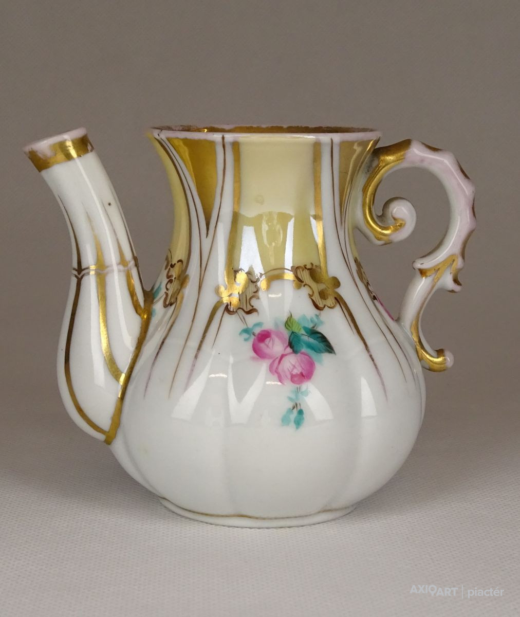 1850-es évek környéki kézi festéses, rózsamintás, dúsan aranyozott kávéskanna.