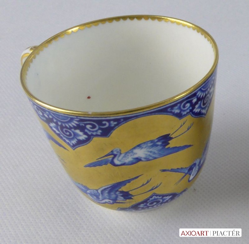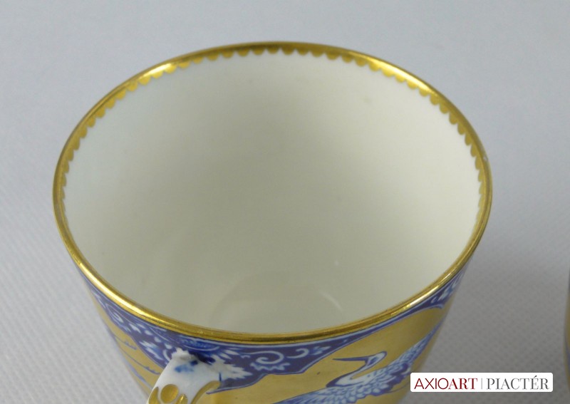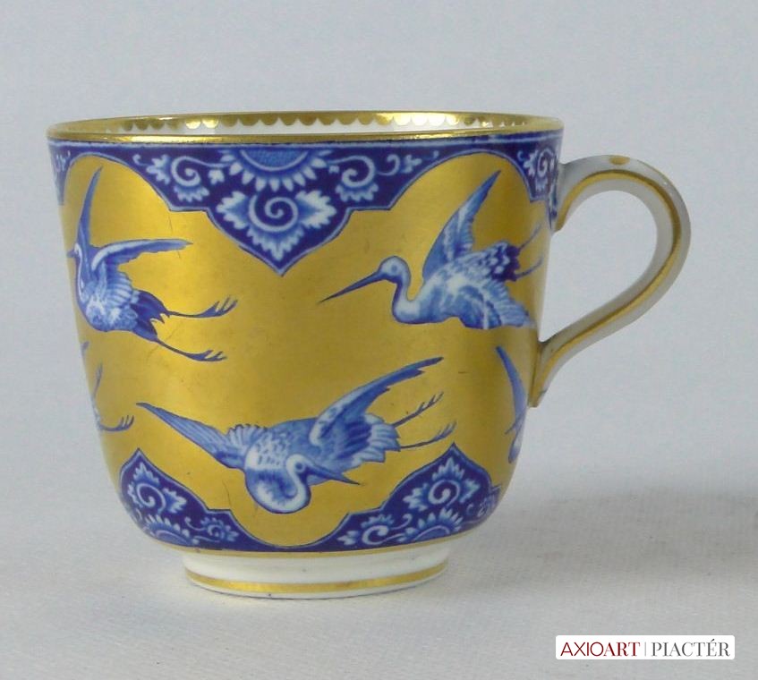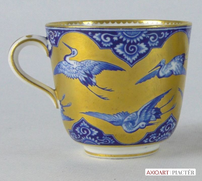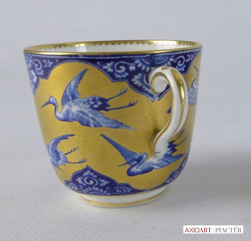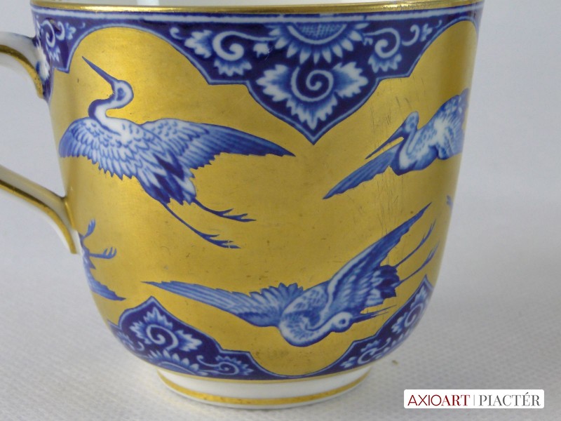 Gyönyörű, hibátlan, antik porcelán teáscsésze, cca 1870. Kék-fehér alapon gazdagon, vastagon aranyozott, mely gólyákat ölel körbe. Jelzetlen.