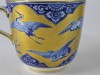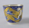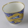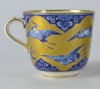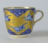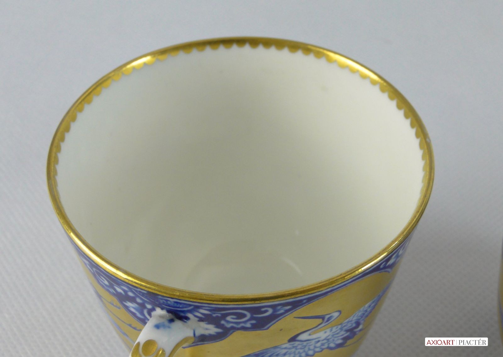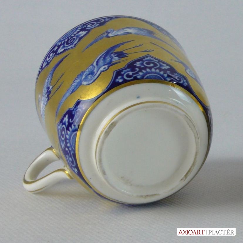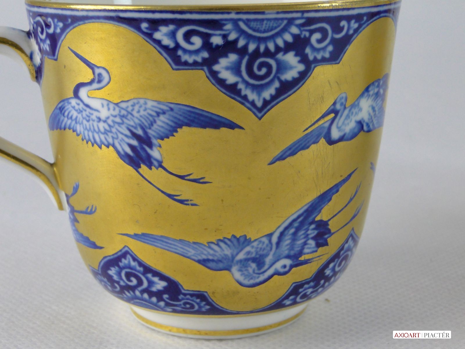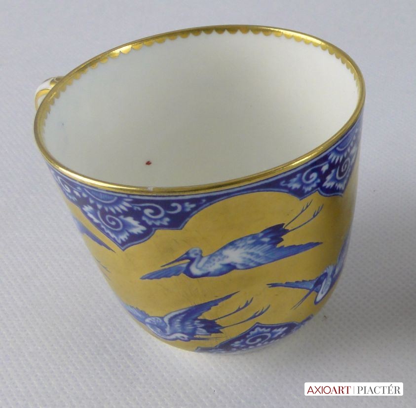 Gyönyörű, hibátlan, antik porcelán teáscsésze, cca 1870. Kék-fehér alapon gazdagon, vastagon aranyozott, mely gólyákat ölel körbe. Jelzetlen.