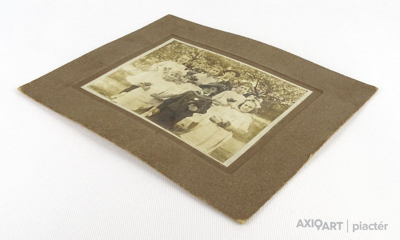 [0U764/X319] Antik, kartonra ragasztott, fekete-fehér fotográfia, melyen egy 20 fős monarchia korabeli férfiakból álló társaság látható egy szecessziós szalonban fotózva. Jelzés, felirat: GLÜCK JÓZSEF GYŐR Magasság: 32.5 cm Szélesség: 44 cm Súly: 0.155 kg Glück József Székesfehérvár, 1887. november 11. – Auschwitz, 1944. június: fényképészmester. Székesfehérvárott végezte iskoláit. Itt sajátította el a fényképészszakmát. Győrben a Deák Ferenc u. 13-as számú házban nyitott műtermet (1898). 1909-ben Münchenben mestervizsgát tett. Győr utcáiról, tereiről, a város változásairól művészi fényképfelvételeket készített. A Xántus János Múzeum őrzi 24x30 cm-es üvegnegatívjait és több pozitív nagyítását. Ezekről a lemezekről készültek azok a képek, amelyek a századforduló és a 30-as évek Győrét ábrázolják. Legalább 200 pótolhatatlan győri városkép megörökítése fűződik nevéhez. A korabeli fényképkiállítások majdnem mindegyikéről elismeréssel tért haza. 1926-tól a Magyar Fényképészek Országos Szövetségének elnöke. 1935-től a győri ipartestület gazdasági bizottságának elnöke, a fotószakosztály vezetőségi tagja. A Győri Ének-és Zeneegylet háznagya, a tűzoltótestület pénztárnoka, a mentőegyesület választmányának tagja. A Győri Neológ Izraelita Hitközség iskolabizottságának tisztségviselője, a város törvényhatósági bizottságának tagja. Innen zsidó származása miatt 1939-ben kizárták. Egy évvel később a városi ipartestület a felügyelőbizottságába választotta. Iparát 1942. május 1-jével megszüntették. 1944 májusában családjával együtt gettóba kényszerült, majd Auschwitzba deportálták. Forrás: https://www.gyorikonyvtar.hu/gyel/index.php/Gl%C3%BCck_J%C3%B3zsef